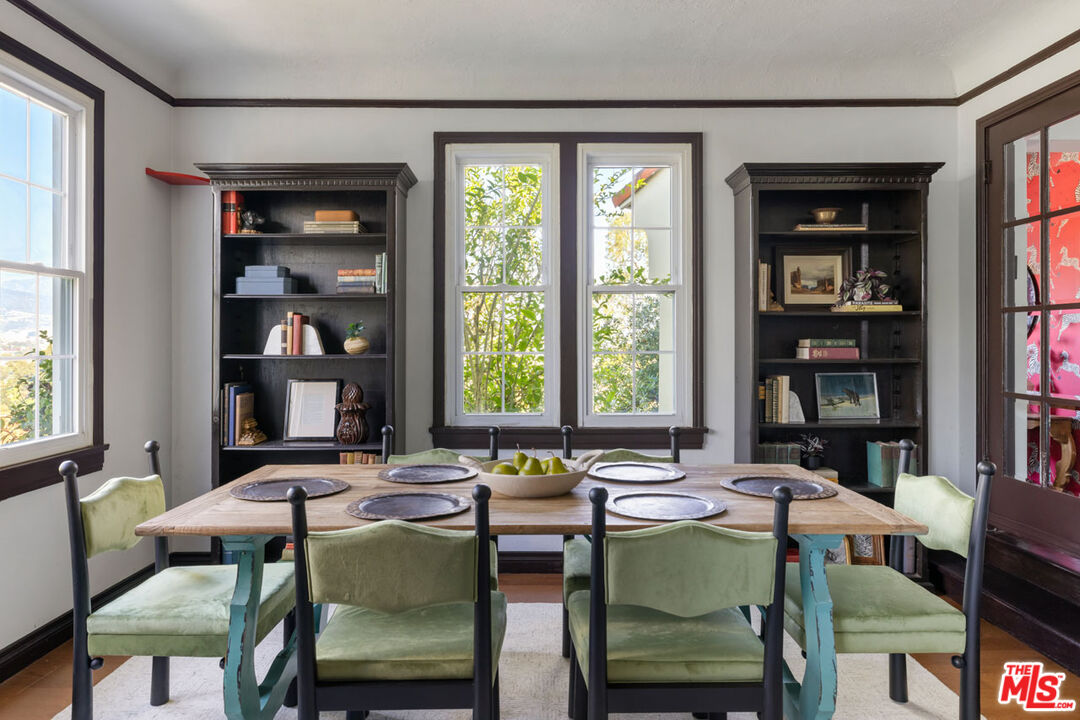 Your majestic home in Silver Lake, an exquisite 1926 Spanish by Cramer & Wise, architects of Hollywood Tower, nestled on a lush corner lot with a sculptural stair rising to the turret entry. The living room is breathtaking, a soaring space composed of arched volumes, with a decorative fireplace and a statement window that takes in sweeping mountain views. French doors open to the bright dining room connecting to a galley kitchen finished with light blue tile and stainless appliances. Three bedrooms include one that captures the views toward Silver Lake hills, and there is a flex space/study with glass sliders. A sparkling heated pool sets the scene for year-round entertaining with a patio overlooking Silver Lake Reservoir, Griffith Observatory and Hollywood sign, and pathways weave between picturesque gardens and planting beds. Amenities include laundry room, AC/heat, and solar panels. A rarefied example of LA's romance and craft, the property puts you within the coveted Ivanhoe Elementary boundary and moments from the Reservoir.
