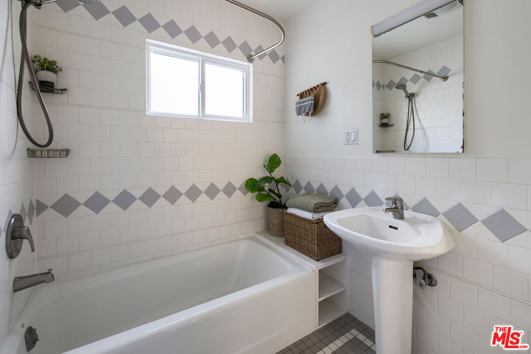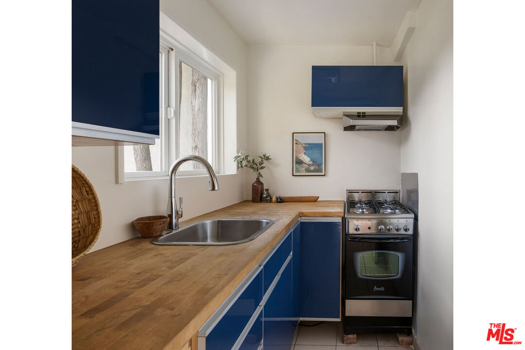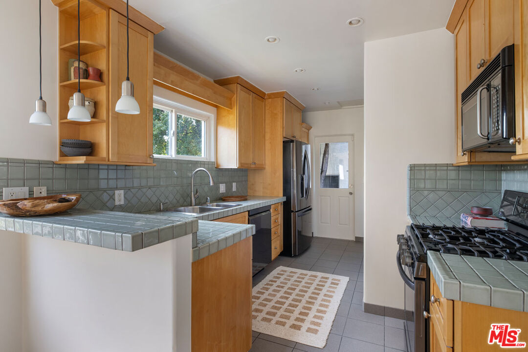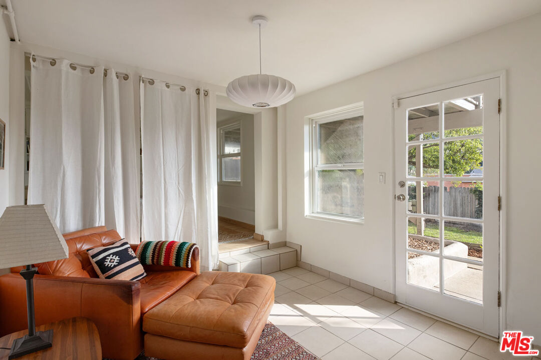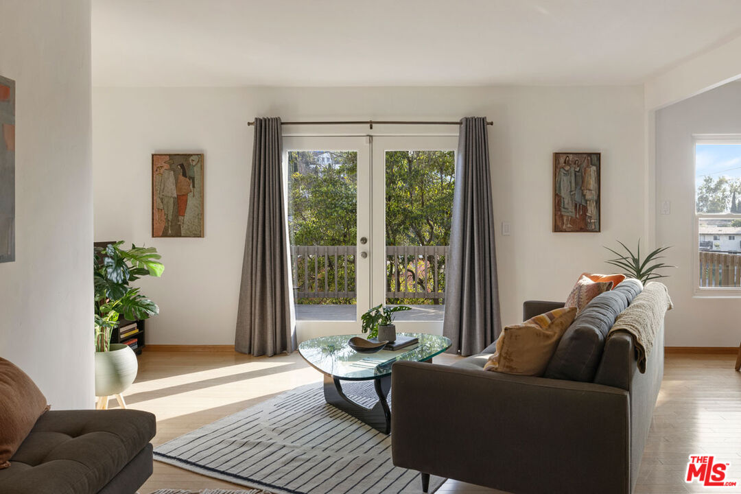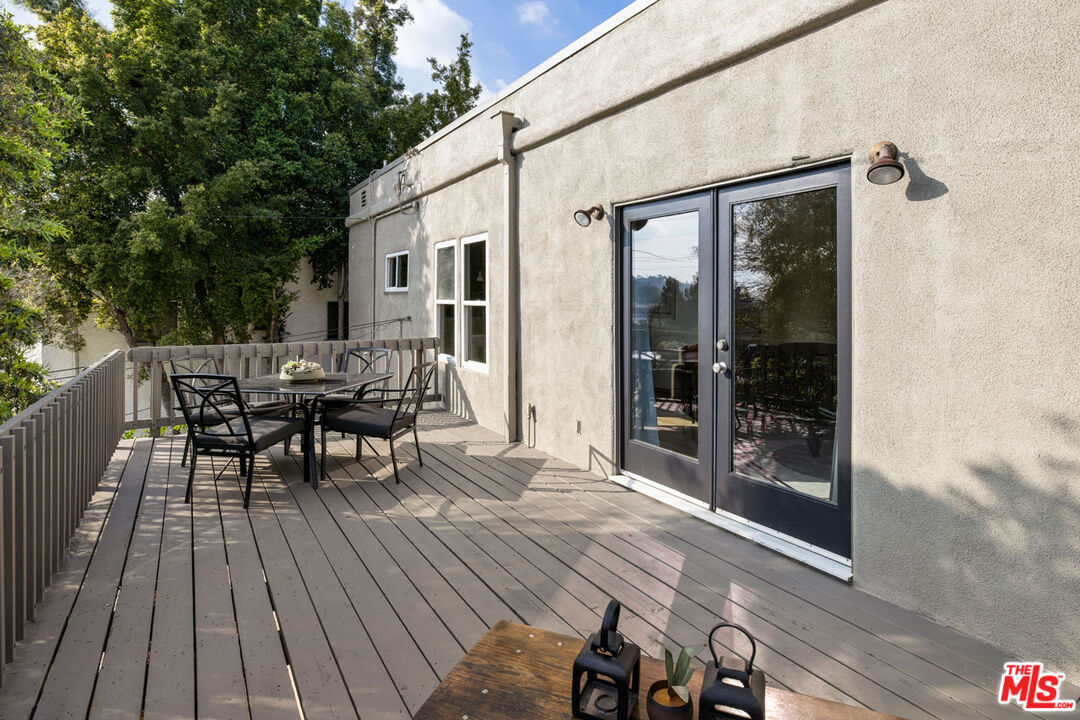 In Silver Lake, this hillside home is nestled in privacy on a quiet street, delivering a flat yard, canyon views, and additional unit with its own address. The main residence is awash in sunlight, an open-plan living space with curved walls and a glass block divider that evoke the Art Deco era. French doors open to a large deck, a breezy perch for dinner and cocktails against the backdrop of colorful sunsets and city lights. The kitchen is finished with sage green tile counters and wood cabinetry, and both bedrooms enjoy leafy views. The lower-level unit features a blue kitchen and a colorful bathroom, a versatile setup for rental income or creative use. The grassy backyard feels serene and private; the front yard is beautifully landscaped and hedged by mature trees. Amenities include AC, laundry, agarage with direct access, and driveway parking. R2 zoning holds future potential, in a great location moments from the Reservoir, Whole Foods, Constellation Coffee, and more.