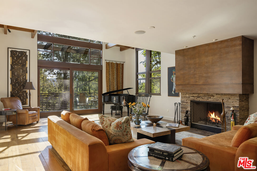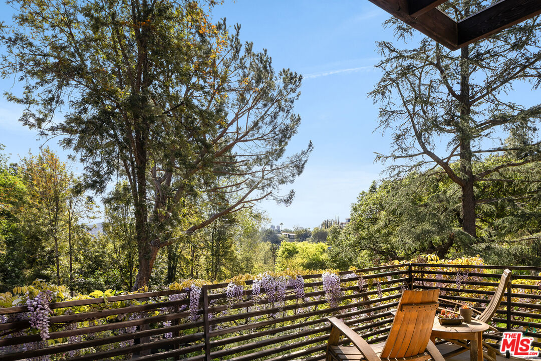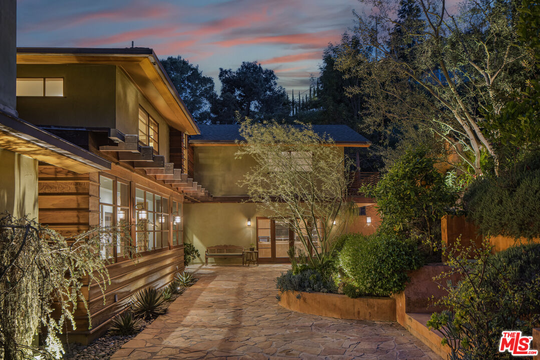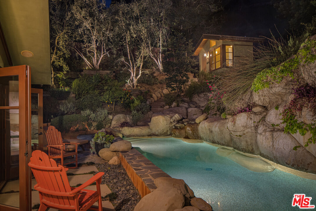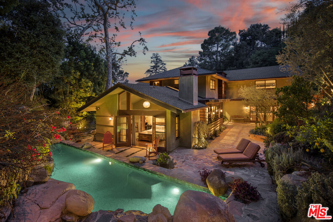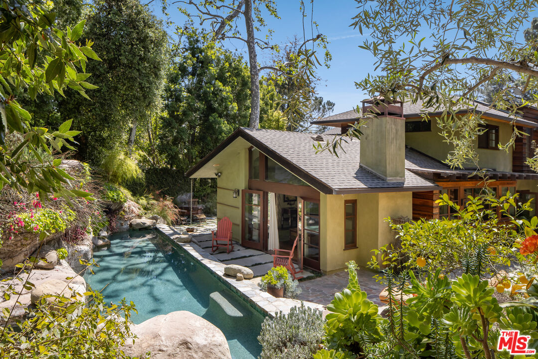 Exceptionally private and tucked at the end of a quiet cul-de-sac, this architectural retreat unfolds at the top of a long drive, surrounded by a breathtaking landscape of wild florals, mature trees, and layered landscaping. The setting feels like an enchanted garden, with a sense of peace that only deep nature and thoughtful design can provide. Floor-to-ceiling glass and large-scale windows create a seamless transition between indoors and out, allowing natural light and greenery to become a living part of the home's design. A stained-glass front entry greets with a kaleidoscope of color, leading to the grand living room boasting soaring ceilings and a dramatic sky-high gable window that creates ever-shifting light patterns as the day progresses. Wood beam accents and natural textures evoke the calm of a luxury mountain lodge, offering a true sense of escape.Nearby, the formal living room anchors the space with a wood-burning fireplace and opens through glass doors to a magical Wisteria-wrapped patio, offering treetop views and a quiet place to retreat. The dining room flows seamlessly into a warm, open kitchen centered around a handcrafted teak island and outfitted with Sub-Zero and Thermador appliances. The layout is designed for effortless connection, with the kitchen blending naturally into the home's main entertaining spaces.A glass lined gallery leads to the primary suite, offering a serene perch that looks out onto the lush gardens beyondan idyllic nook for reading or reflection. The primary bedroom is deeply tranquil, enveloped by the sound of cascading water from the nearby waterfall feature and the dappled shade of woodland-like greenery just beyond its doors. With its own fireplace, vaulted ceiling, and direct access to the backyard grounds, it functions as a private haven within the home. The spa-like en-suite bath includes dual vanities, a soaking tub with backyard views, separate shower and bidet, and a generous walk-in closet. Upstairs, a secondary suite offers sweeping views of the hillside and surrounding treetops, while two additional guest rooms, one with a balcony, share a large jack-and-jill bath. A lofted office above the living room serves as an inspiring perch, with treetop views, library shelving, and a soft soundtrack of birdsong that turns everyday tasks into a moment of calm.Outside, the home unfolds into a layered garden experience, with distinct spaces for dining, lounging, and quiet conversationevoking the timeless romance of Tuscany. A tall, ivy-draped wall frames a volcanic-stone fireplace with a custom heat-reflecting metal surround, anchoring the outdoor entertaining area with warmth and ambiance. Nearby, a built-in barbecue, alfresco dining table, and relaxed seating lounge complete the setting. The pool and spa are framed by natural rockwork and thoughtful landscaping, accompanied by a treehouse-inspired cabana with a full bathroom and sunbathing terraces tucked into private corners along the property. A lower-level garage offers two-car parking and connects discreetly beneath the home through a separate entry.Every detail from the tactile richness of the materials to the way light drifts through glass and foliagehas been composed to honor the landscape and evoke a sense of peace throughout the home. There's a transportive quality, as though it exists slightly outside of time: serene, enveloped, almost dreamlike.