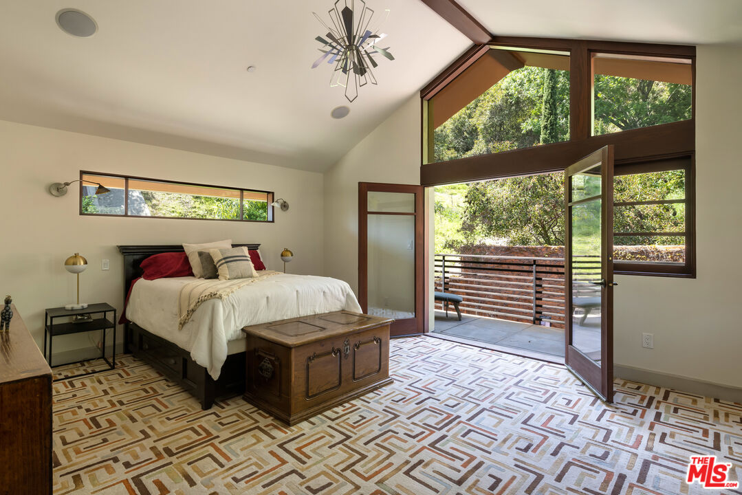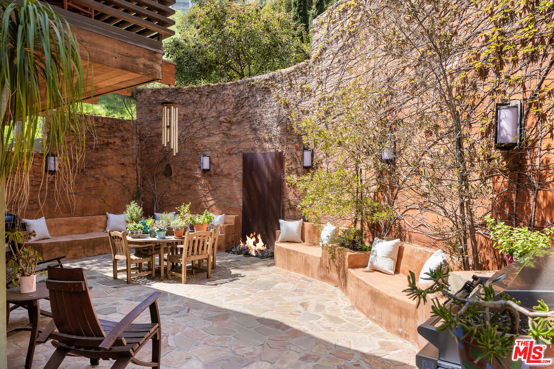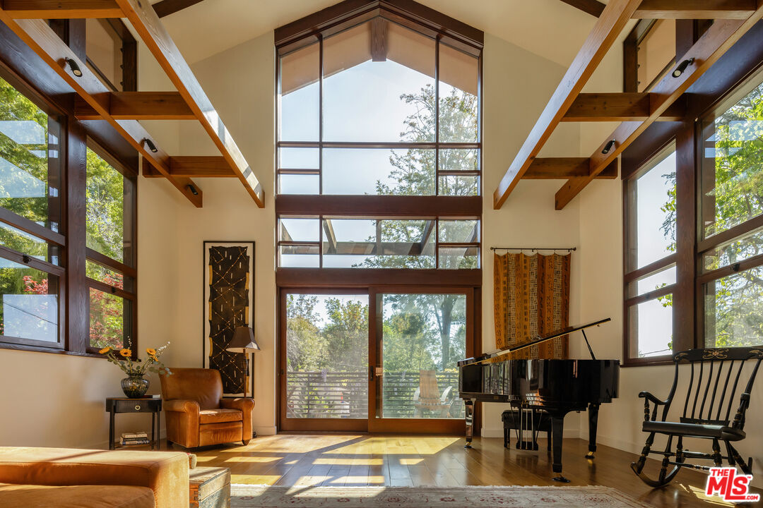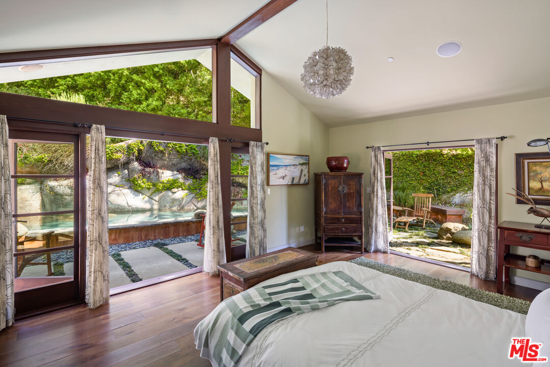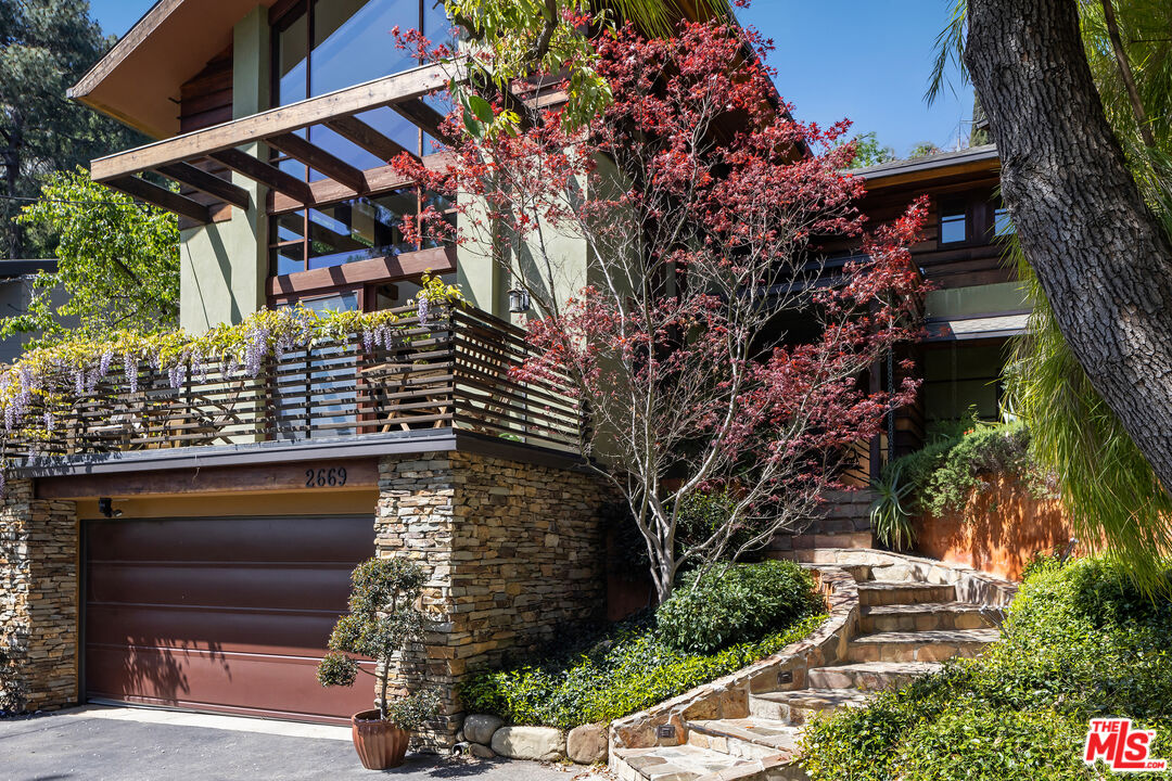 Exceptionally private and tucked at the end of a quiet cul-de-sac, this architectural retreat unfolds at the top of a long drive, surrounded by a breathtaking landscape of wild florals, mature trees, and layered landscaping. The setting feels like an enchanted garden, with a sense of peace that only deep nature and thoughtful design can provide. Floor-to-ceiling glass and large-scale windows create a seamless transition between indoors and out, allowing natural light and greenery to become a living part of the home's design. A stained-glass front entry greets with a kaleidoscope of color, leading to the grand living room boasting soaring ceilings and a dramatic sky-high gable window that creates ever-shifting light patterns as the day progresses. Wood beam accents and natural textures evoke the calm of a luxury mountain lodge, offering a true sense of escape.Nearby, the formal living room anchors the space with a wood-burning fireplace and opens through glass doors to a magical Wisteria-wrapped patio, offering treetop views and a quiet place to retreat. The dining room flows seamlessly into a warm, open kitchen centered around a handcrafted teak island and outfitted with Sub-Zero and Thermador appliances. The layout is designed for effortless connection, with the kitchen blending naturally into the home's main entertaining spaces.A glass lined gallery leads to the primary suite, offering a serene perch that looks out onto the lush gardens beyondan idyllic nook for reading or reflection. The primary bedroom is deeply tranquil, enveloped by the sound of cascading water from the nearby waterfall feature and the dappled shade of woodland-like greenery just beyond its doors. With its own fireplace, vaulted ceiling, and direct access to the backyard grounds, it functions as a private haven within the home. The spa-like en-suite bath includes dual vanities, a soaking tub with backyard views, separate shower and bidet, and a generous walk-in closet. Upstairs, a secondary suite offers sweeping views of the hillside and surrounding treetops, while two additional guest rooms, one with a balcony, share a large jack-and-jill bath. A lofted office above the living room serves as an inspiring perch, with treetop views, library shelving, and a soft soundtrack of birdsong that turns everyday tasks into a moment of calm.Outside, the home unfolds into a layered garden experience, with distinct spaces for dining, lounging, and quiet conversationevoking the timeless romance of Tuscany. A tall, ivy-draped wall frames a volcanic-stone fireplace with a custom heat-reflecting metal surround, anchoring the outdoor entertaining area with warmth and ambiance. Nearby, a built-in barbecue, alfresco dining table, and relaxed seating lounge complete the setting. The pool and spa are framed by natural rockwork and thoughtful landscaping, accompanied by a treehouse-inspired cabana with a full bathroom and sunbathing terraces tucked into private corners along the property. A lower-level garage offers two-car parking and connects discreetly beneath the home through a separate entry.Every detail from the tactile richness of the materials to the way light drifts through glass and foliagehas been composed to honor the landscape and evoke a sense of peace throughout the home. There's a transportive quality, as though it exists slightly outside of time: serene, enveloped, almost dreamlike.
