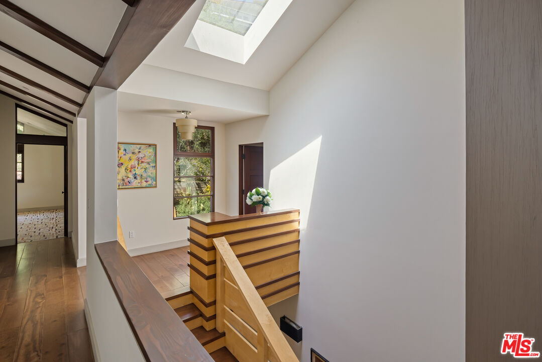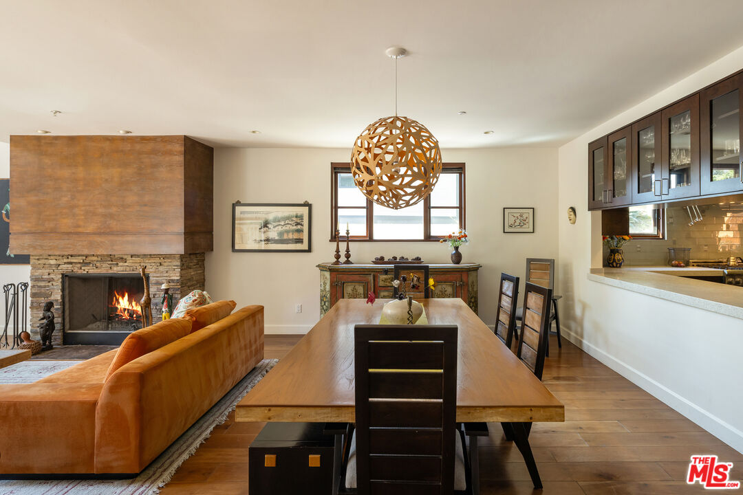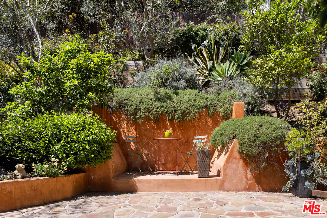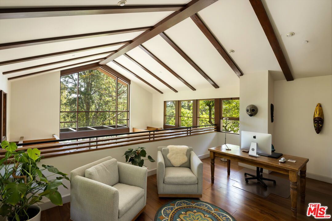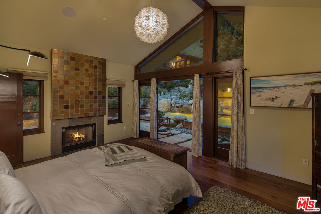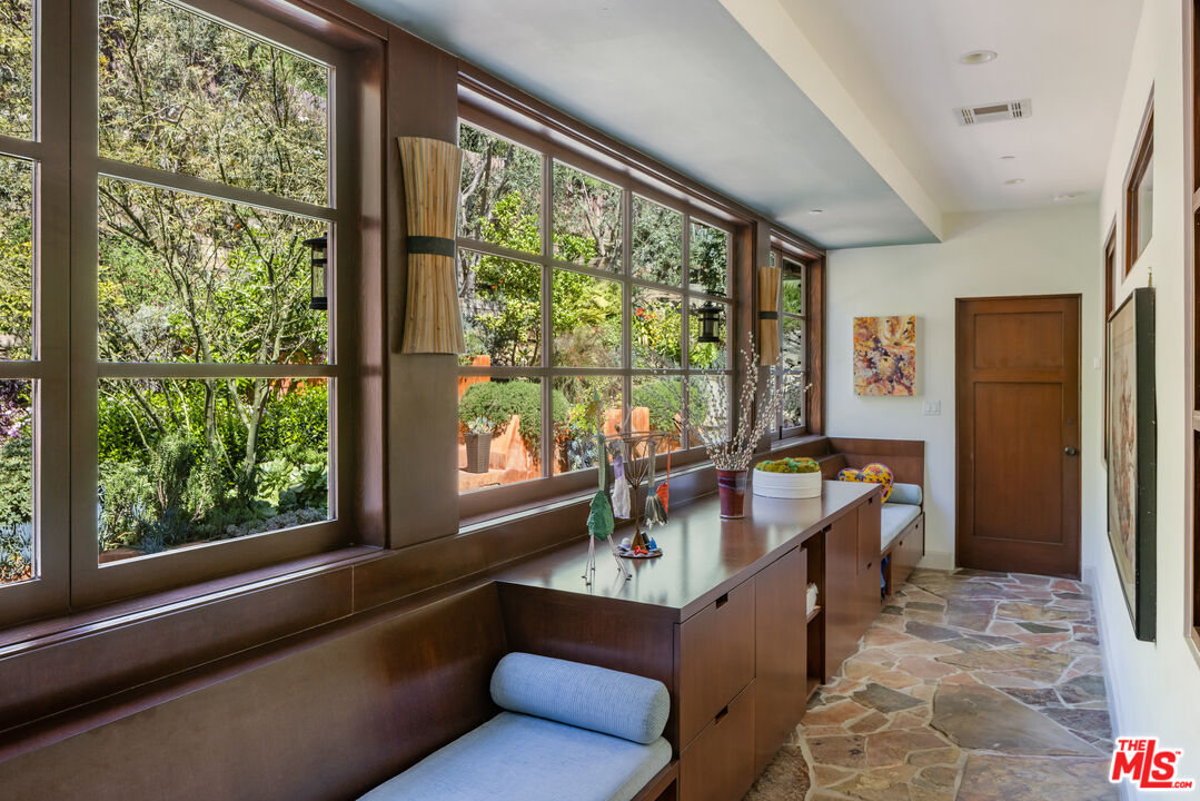 Exceptionally private and tucked at the end of a quiet cul-de-sac, this architectural retreat unfolds at the top of a long drive, surrounded by a breathtaking landscape of wild florals, mature trees, and layered landscaping. The setting feels like an enchanted garden, with a sense of peace that only deep nature and thoughtful design can provide. Floor-to-ceiling glass and large-scale windows create a seamless transition between indoors and out, allowing natural light and greenery to become a living part of the home's design. A stained-glass front entry greets with a kaleidoscope of color, leading to the grand living room boasting soaring ceilings and a dramatic sky-high gable window that creates ever-shifting light patterns as the day progresses. Wood beam accents and natural textures evoke the calm of a luxury mountain lodge, offering a true sense of escape.Nearby, the formal living room anchors the space with a wood-burning fireplace and opens through glass doors to a magical Wisteria-wrapped patio, offering treetop views and a quiet place to retreat. The dining room flows seamlessly into a warm, open kitchen centered around a handcrafted teak island and outfitted with Sub-Zero and Thermador appliances. The layout is designed for effortless connection, with the kitchen blending naturally into the home's main entertaining spaces.A glass lined gallery leads to the primary suite, offering a serene perch that looks out onto the lush gardens beyondan idyllic nook for reading or reflection. The primary bedroom is deeply tranquil, enveloped by the sound of cascading water from the nearby waterfall feature and the dappled shade of woodland-like greenery just beyond its doors. With its own fireplace, vaulted ceiling, and direct access to the backyard grounds, it functions as a private haven within the home. The spa-like en-suite bath includes dual vanities, a soaking tub with backyard views, separate shower and bidet, and a generous walk-in closet. Upstairs, a secondary suite offers sweeping views of the hillside and surrounding treetops, while two additional guest rooms, one with a balcony, share a large jack-and-jill bath. A lofted office above the living room serves as an inspiring perch, with treetop views, library shelving, and a soft soundtrack of birdsong that turns everyday tasks into a moment of calm.Outside, the home unfolds into a layered garden experience, with distinct spaces for dining, lounging, and quiet conversationevoking the timeless romance of Tuscany. A tall, ivy-draped wall frames a volcanic-stone fireplace with a custom heat-reflecting metal surround, anchoring the outdoor entertaining area with warmth and ambiance. Nearby, a built-in barbecue, alfresco dining table, and relaxed seating lounge complete the setting. The pool and spa are framed by natural rockwork and thoughtful landscaping, accompanied by a treehouse-inspired cabana with a full bathroom and sunbathing terraces tucked into private corners along the property. A lower-level garage offers two-car parking and connects discreetly beneath the home through a separate entry.Every detail from the tactile richness of the materials to the way light drifts through glass and foliagehas been composed to honor the landscape and evoke a sense of peace throughout the home. There's a transportive quality, as though it exists slightly outside of time: serene, enveloped, almost dreamlike.