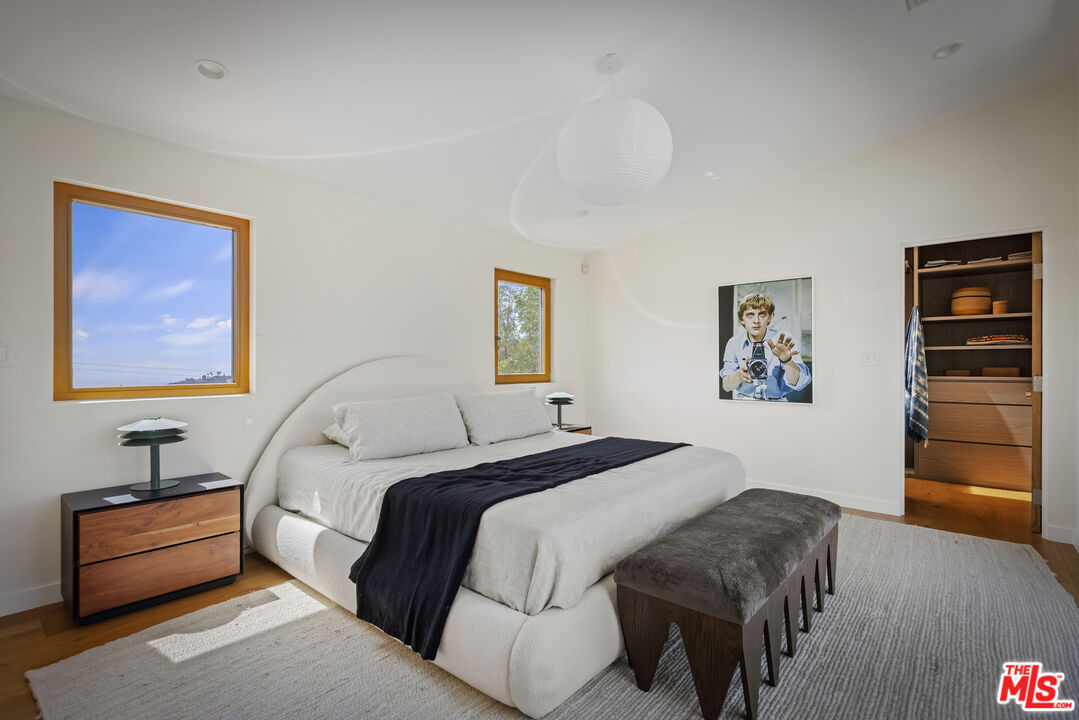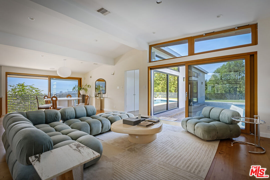 Single-story mid-century perched atop the hills of Nichols Canyon, offering privacy and sweeping 360-degree views: canyon ridgelines in every direction, city lights below, and on clear days, the ocean beyond. Renovated with a commitment to quality and environmental responsibility, the home features high-end, eco-conscious, and energy-efficient upgrades, including an owned solar energy system. The architecture stays true to its mid-century modern origins, designed for connection and visibility. Thoughtfully arranged, the primary suite sits on one side, with three additional bedrooms and two bathrooms on the other, all oriented around a pool and a flat grassy backyard. The primary suite features a walk-in closet and a spa-inspired ensuite with a soaking tub, all three spaces framed by breathtaking views. The kitchen has been updated with sustainably sourced wood cabinetry and Miele appliances. It opens onto the dining and living areas and extends to a south-facing deck with sunset views. Floor-to-ceiling Gaulhofer windows and sliding doors crafted from premium Austrian wood, double-paned for energy efficiency and acoustic comfort, bring in natural light while framing the surrounding landscape. Skylights soften and diffuse daylight throughout. Every detail, down to the finely finished closets, reflects a dedication to both form and function. Gated and secured by a Hikvision CCTV system and Turbolock digital entry, the property also includes a two-car garage and four additional parking spaces, with outdoor areas thoughtfully arranged for relaxing and entertaining. A rare offering that balances architectural integrity, environmental mindfulness, and understated luxury, this residence is designed for those who value quality, privacy, and a thoughtful way of living.