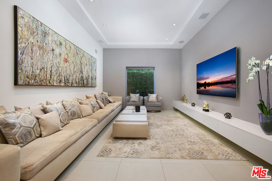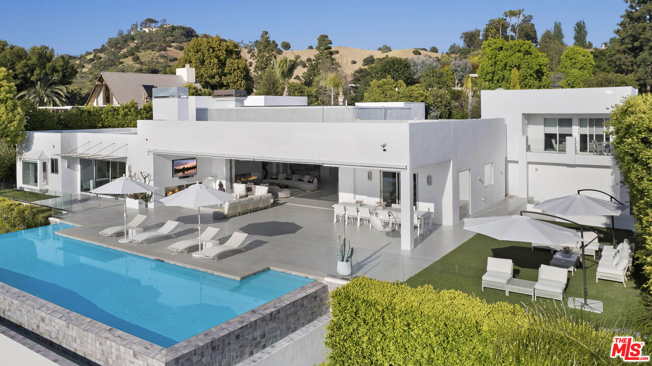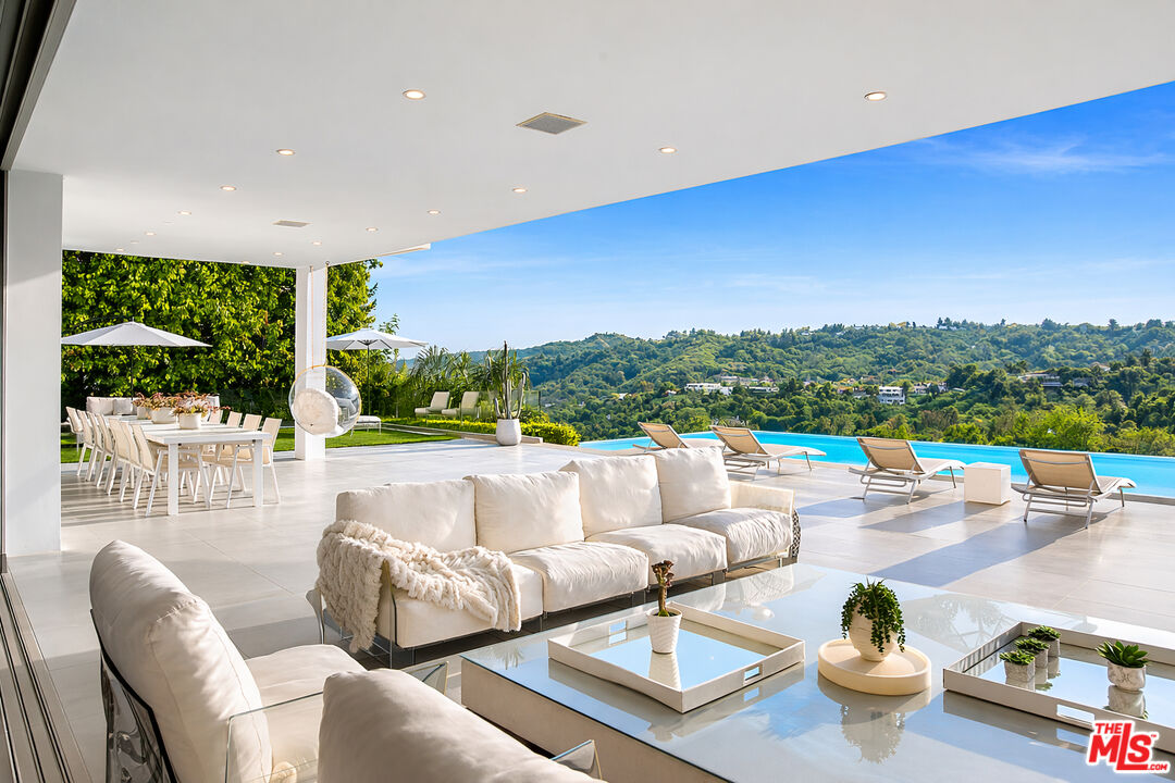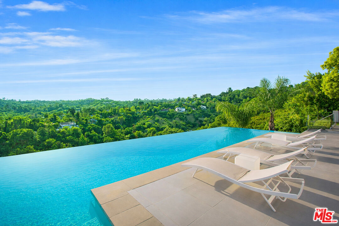 Privately gated and positioned at the top of a quiet Beverly Hills cul-de-sac, this refined architectural contemporary residence offers exceptional privacy, with sweeping 180-degree panoramic canyon and sunset views with no roofline obstruction. Soaring approximately 15-foot ceilings open seamlessly through Fleetwood pocket doors to an infinity-edge pool and expansive outdoor living areas, creating a true indoor-outdoor experience with direct access from every principal space. Designed for both elegant entertaining and everyday living, the home captures natural light, air, and expansive views throughout, enhanced by a retractable skylight in the hallway. The home offers two primary suites. The primary suite features two full bathrooms, two separate walk-in dressing rooms, and dual sitting areas, serving as a private retreat with motorized blackout and daytime shades. Four additional en-suite bedrooms are thoughtfully positioned for comfort and discretion, including a separate guest wing and lower-level suites. Additional highlights include a powder room, custom chef's kitchen with professional-grade Miele appliances, media room, executive office, entertaining bar, staff quarters, multiple covered outdoor living and dining areas complete with a fireplace, and two solar panel systems. The infinity-edge pool, grassy terrace, and covered loggia are perfectly oriented to maximize the serene hillside setting and unobstructed sunset outlooks. Finished with custom limestone and hardwood flooring, curated designer details, and a state-of-the-art security system with cameras and alarm, this architectural estate offers a rare combination of privacy, views, and refined modern living just minutes from Rodeo Drive, The Beverly Hills Hotel, and the city's most prestigious dining and shopping destinations.