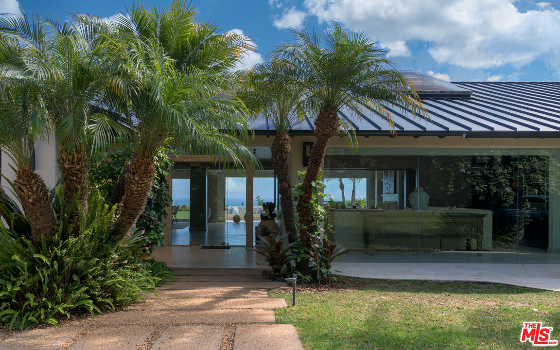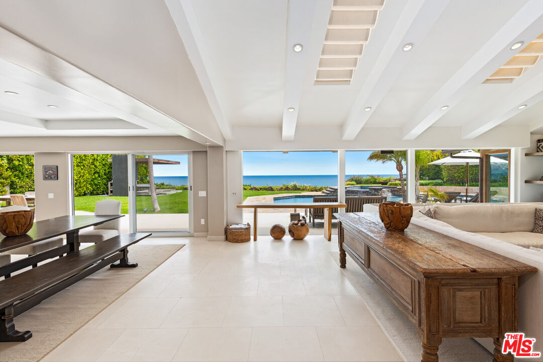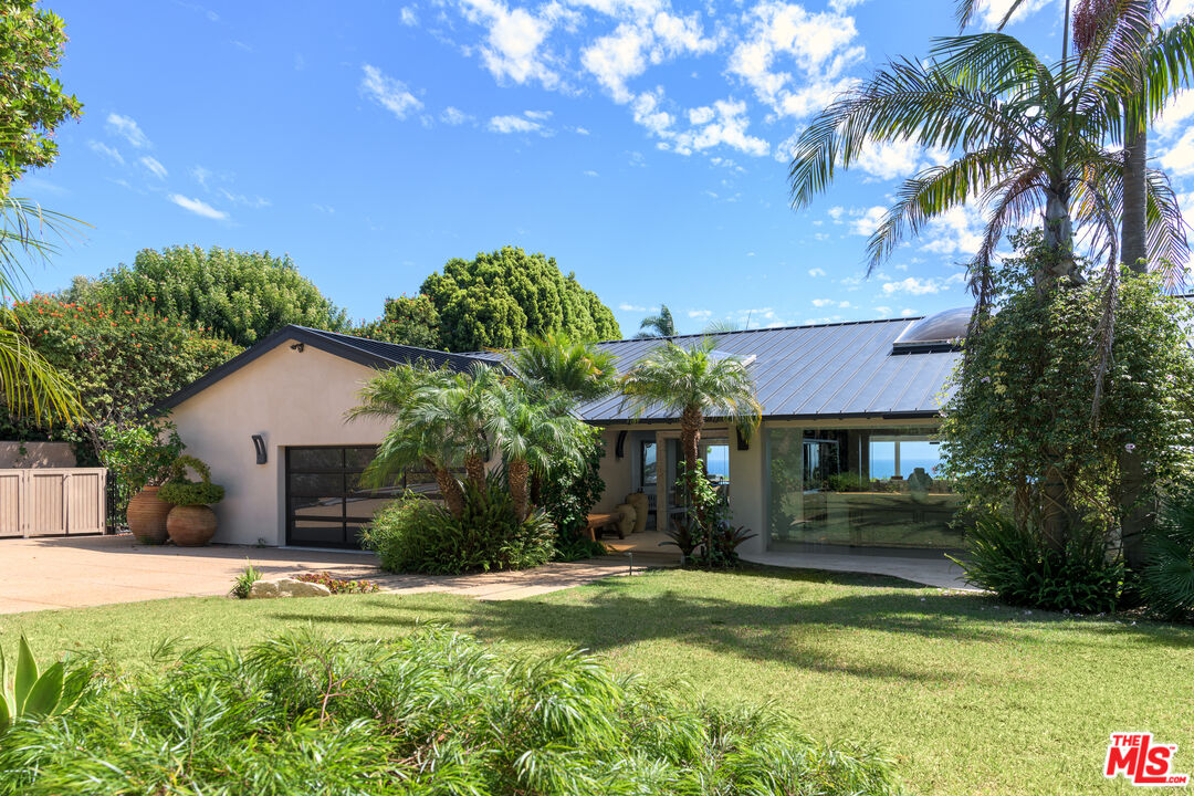 Exceptionally private and awash with natural light, this gated Point Dume blufftop estate provides over an acre of indoor-outdoor living with absolutely spectacular ocean, island, and Queen's Necklace views. Surrounded by expansive lawns and manicured landscaping, the single-level home has a large swimming pool and a huge entertaining deck overlooking the shoreline and the sea. Gracious, open interiors with high ceilings, many skylights, generous built-ins, picture windows, and wraparound walls of glass offer wonderful sight lines to the pool, gardens, and views. Furnished for elegant comfort, the main living area flows seamlessly between the large living room with a fireplace, the dining area with a tray ceiling and service bar, the spacious media room/library with a wall of book shelves, and the marvelous chef's kitchen. Equipped with top-quality appliances and an island with bar seating, the kitchen enjoys backyard, pool, and ocean views, and opens to the patio for poolside al-fresco dining. The home's four bedrooms include a private guest suite with kitchenette and bath. The primary suite is a tranquil, ocean-view retreat with a walk-in closet and an amazing spa-like bath complete with skylights, gorgeous stonework, a spectacular garden-view sauna, and enormous windows facing the pool and ocean views. In addition to the huge front lawn, with a garden bench and swing-set, the home's resort-like backyard is the perfect setting for large and small gatherings, dining, recreation, and undisturbed relaxation. With its amazing views, the backyard centers around the large waterfall pool and spa with a flagstone pool deck. There is a partially covered patio lounging area, a pergola with built-in couches, a step-up seating area with a fire pit, a barbecue, an outdoor shower, and a stunning blufftop entertaining deck with benches and views, views, views. Additional features include a mud room, a two-car garage with a washer and dryer plus an extra refrigerator and freezer, guest parking for six cars, and lifestyle amenities such as a full-house sound system and camera security, plus a coveted beach key.