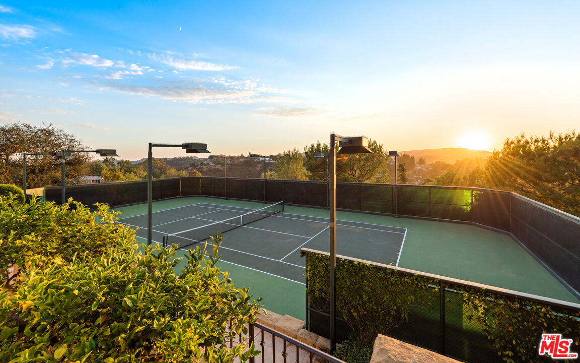 The Antelo View Estate stands as one of Los Angeles' most distinguished and irreplaceable residences, tucked away at the end of a secluded private road in Bel-Air. With nearly unmatched scale, privacy, and design pedigree, this exceptional compound encompasses two APNs and is secured behind double gates, unveiling a world entirely its own. A sweeping motor court welcomes guests with commanding views stretching from the glittering city skyline to the serene mountains and the Pacific Ocean beyond. Graceful fountains accent the arrival, their gentle flow enhancing the sense of tranquility and grandeur that defines the estate. Completely reimagined through an extensive, design-driven remodel, the estate masterfully fuses timeless sophistication with modern innovation. The 6-bedroom, 9-bath main residence is defined by grand-scale interiors, filled with abundant natural light and breathtaking views from nearly every room. Stately fireplaces throughout the home offer warmth, dramatic presence, and intimate gathering spaces, anchoring living areas with a sense of refined elegance. The lower level is a retreat for both leisure and entertainment, featuring a state-of-the-art theater with bar, a private gym with steam shower, wine storage, and flexible staff or wellness quarters. At the heart of the home lies a spectacular new chef's kitchen, curated with bespoke white oak cabinetry, hand-selected marble countertops, dual oversized sinks, and an array of Miele and Gaggenau appliances. An exquisite brass wine display, inviting fireplace, walk-in pantry, and breakfast nook with unobstructed views further elevate the space, transforming everyday living into an art form. The second floor reveals four gracious bedrooms, crowned by a primary suite of rare distinction. The suite features dual spa-inspired baths, expansive walk-in dressing rooms, a fireplace for quiet evenings, a private office, and a vast terrace that embraces the horizon. Beyond the main residence, two guest homes extend the estate's legacy of luxury. The upper two-story guest house presents nearly 3,000 square feet, complete with two bedrooms, three baths, a full kitchen, and a great room anchored by a dramatic fireplace. French doors open to garden terraces accompanied by gentle fountains and rolling lawns, crafting an atmosphere of serenity. The lower guest home, nestled under the tennis court, offers two bedrooms, two baths, a full kitchen, laundry, and wrap-around terraces immersed in tranquil treetop views perfect for long-stay guests or staff. Outdoors, the grounds unfold in true resort style: a dramatic swimming pool with cabana, a tennis court with viewing pavilions, manicured gardens, and a romantic loggia designed for alfresco dining or intimate wine tastings. Fountain features dot the landscape, blending the soothing sound of flowing water with the natural beauty of the gardens. Interwoven pathways and a private golf cart circuit encircle the entire estate, underscoring its rare sense of scale and seclusion. The Antelo View Estate is more than a home it is a private sanctuary of architectural beauty and natural majesty. With its many fireplaces, enchanting fountains, unrivaled vistas, world-class amenities, and a level of craftsmanship seldom seen, this legacy compound represents one of the most important and prestigious offerings to ever arrive on the market in Bel-Air.