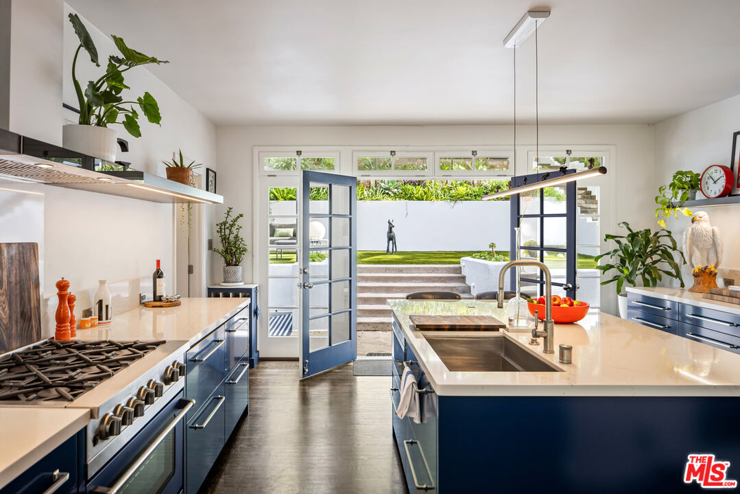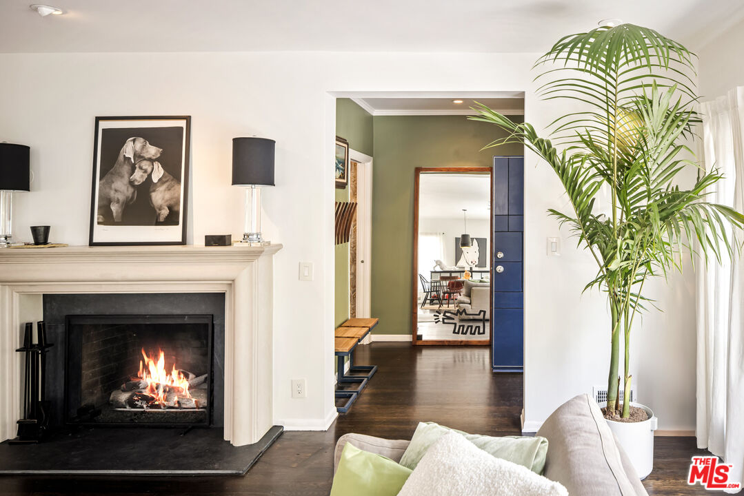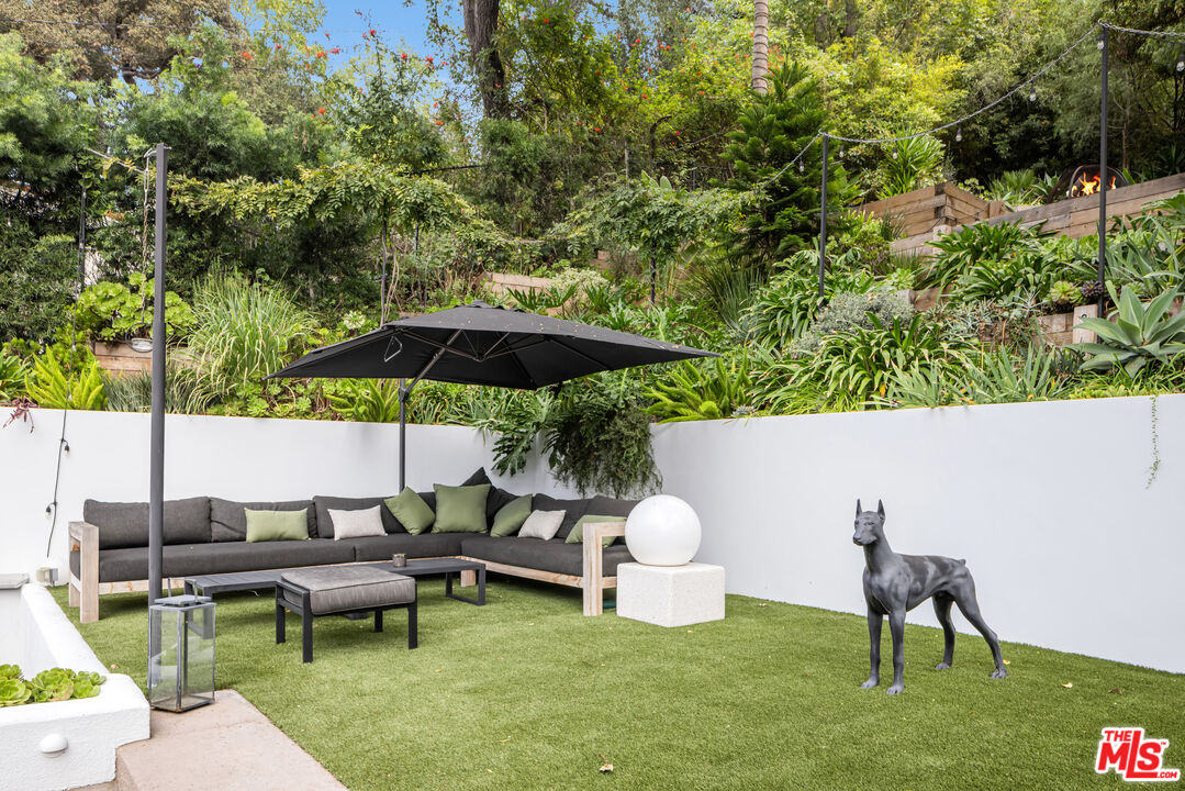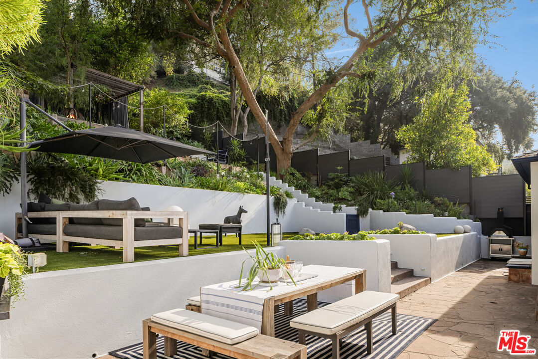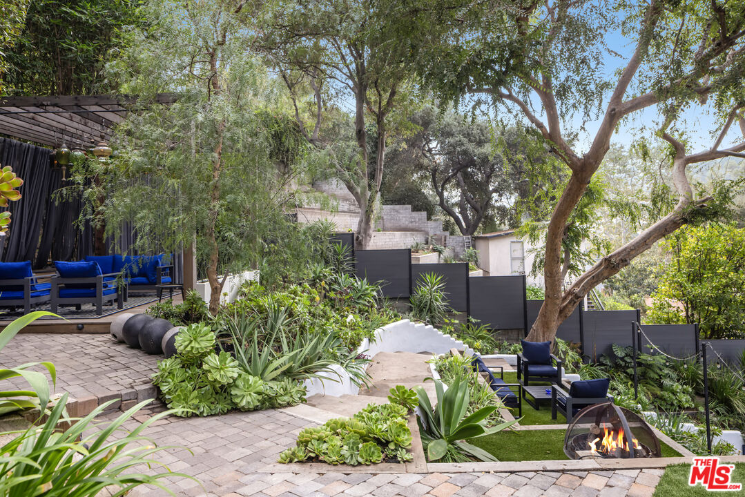 Gated, Traditional with mid-century modern influences on large, wooded lot nestled in upper Beachwood Canyon. Formerly celebrity-owned and set back from the street, this property brings the peace and tranquility of nature to everyday living. Oversized windows create an airiness throughout the living space which is centered around a custom fireplace. Main level includes 4 bedrooms and 3 baths including an oversized primary suite with Walnut built-ins and opulent chandelier. Luxury appliances appoint the remodeled kitchen and separate laundry/utility room. Hardwood floors throughout. Rear French doors open to a lush park-like entertainer's rear yard complete with multiple seating/lounging areas, landscaped terraces, fire pit, winding paths, and a hilltop pergola set among succulent gardens, Meyer lemon and banana trees. The lower level has a guest suite and bedroom/office with independent entrances, private yard, kitchenette, and bath. Two car garage features storage cabinets & utility sink. Close to hiking trails, Beachwood market, city night life and Warner Brothers, Universal and Disney studios.