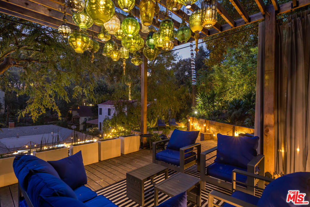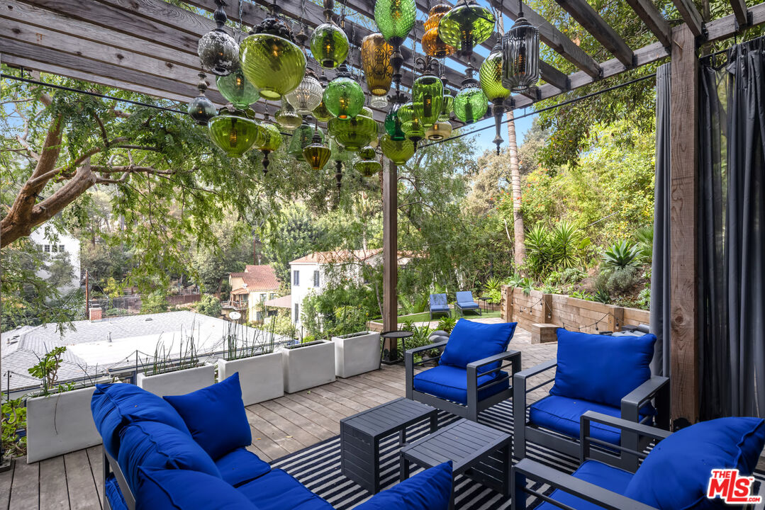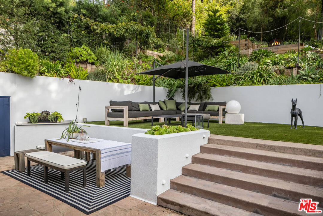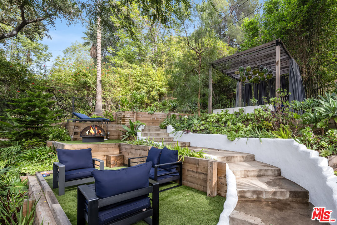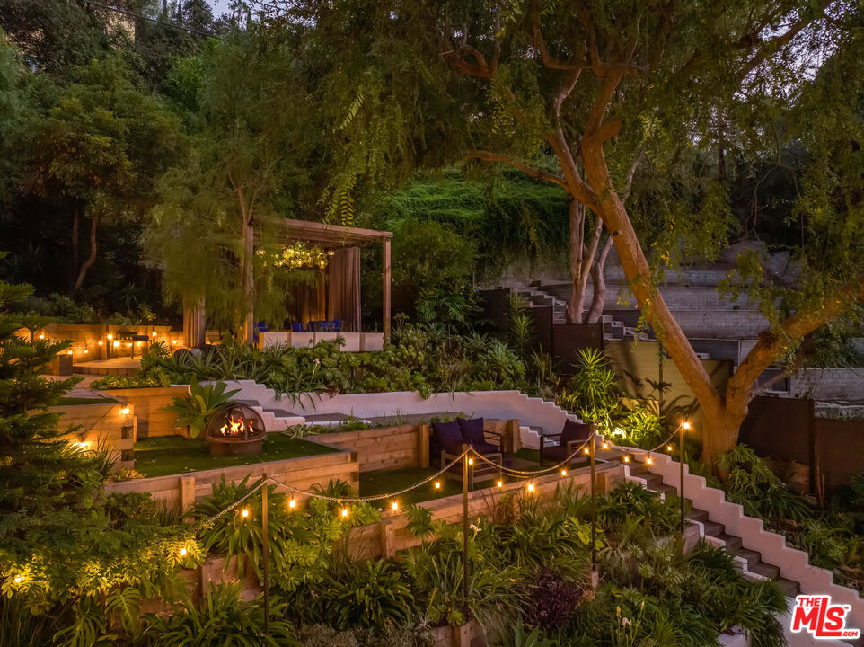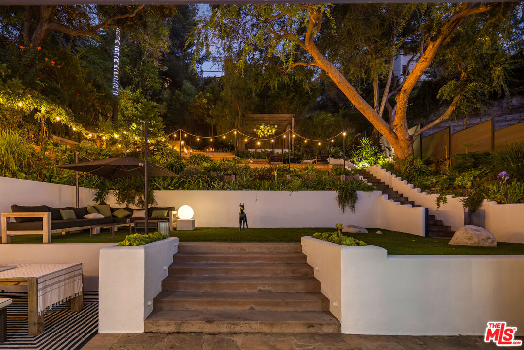 This gated Traditional home and PRIVATE GUEST SUITE have mid-century modern influences and sits on a large, wooded lot in upper Beachwood Canyon. Formerly celebrity-owned and tucked back from the street, this home's expansive rear yard is an outdoor sanctuary bringing the tranquility of nature to everyday living. Green canyon views can be seen from the oversized windows creating an airiness throughout the living space, anchored by a renovated kitchen which seamlessly joins both interior living and the outdoors. The kitchen is outfitted with built-in, luxury appliances, a large island, and plentiful countertop prep space. Whether you prefer entertaining or quiet fireside moments, this home offers the space for your household to sprawl on the 4 bedroom, 3 bath main level inclusive of an oversized, primary suite with custom Walnut built-in's and dedicated laundry/utility room. Rear French doors open to your own secluded park-like garden designed for entertaining. Winding paths of the curated grounds showcase its succulent gardens, professionally landscaped terraces, several lounging areas, banana and Meyer lemon trees, and private hilltop pergola illuminated by a masterfully designed light installation. Out of town guests can enjoy the privacy of a PRIVATE GUEST SUITE on the lower level with its own kitchenette, bathroom, bedroom/office and private garden. The two-car garage features built-in cabinets & utility sink. Close to hiking trails, Beachwood market, city night life, and major studios. Experience the magic of this private sanctuary in iconic Beachwood Canyon.