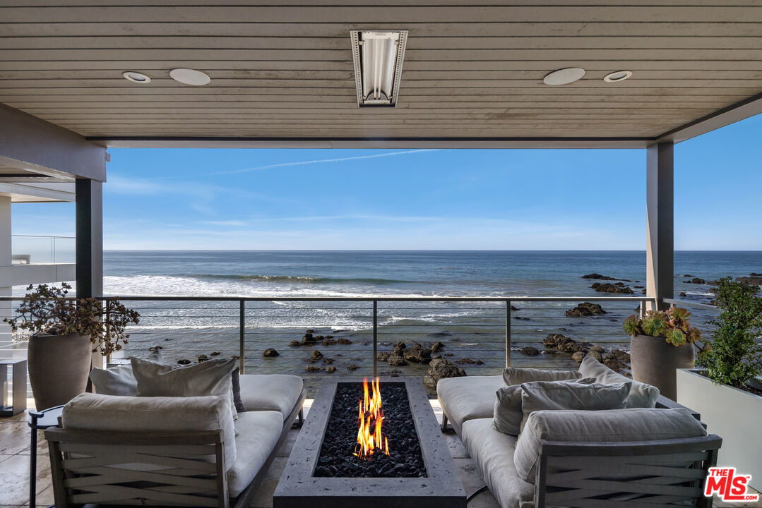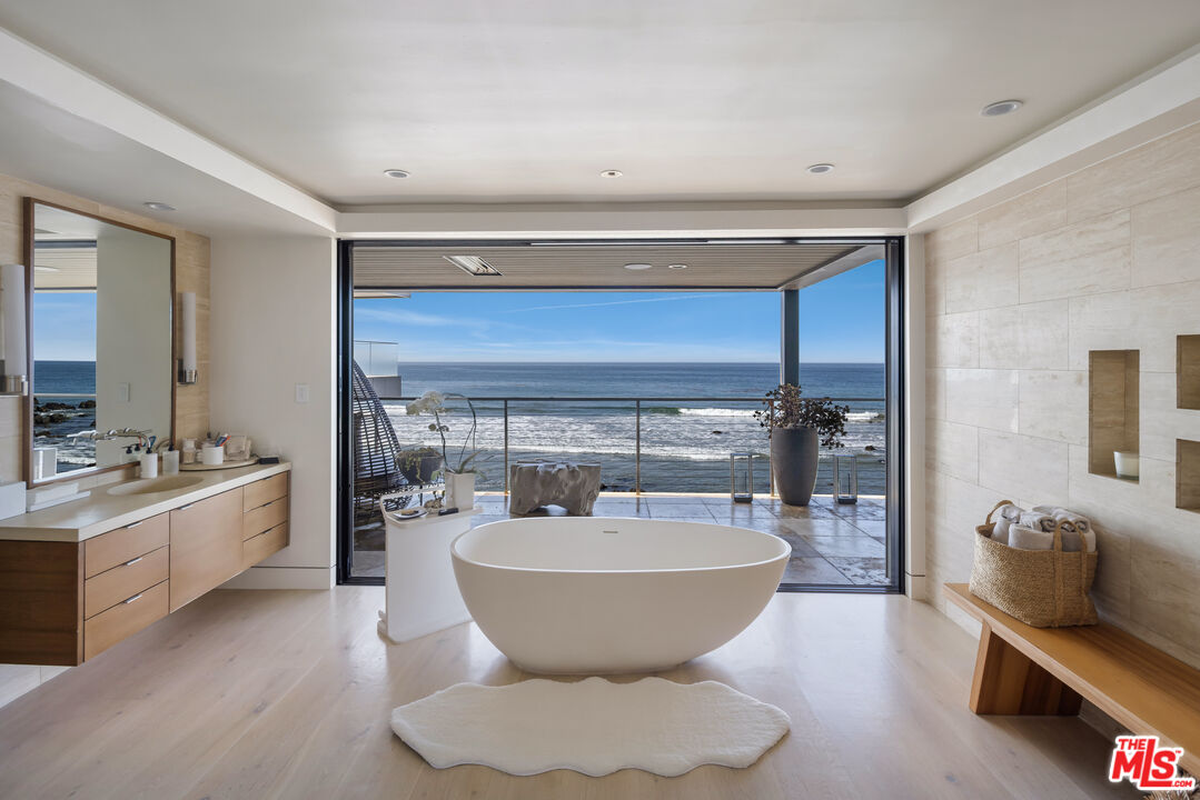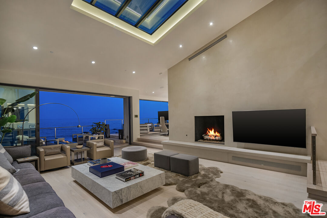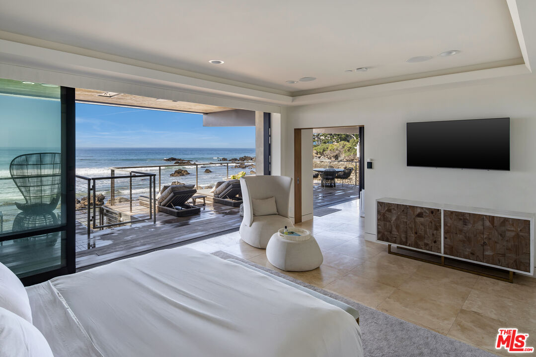 Set at the end of a private cul-de-sac on an ultra-exclusive gated street just off Broad Beach Road, this extraordinary Malibu residence offers a rare combination of seclusion, architecture, and panoramic oceanfront living. Set above the sand in one of Malibu's most coveted coves, the property unfolds in layers beginning with a tranquil entry garden and outdoor lounge that immediately sets a tone of intimacy and retreat. Behind the gate, the reimagined contemporary beach house spans four bedrooms and six thoughtfully designed bathrooms across multiple light-filled levels, all accessed by elevator and fully integrated into a state-of-the-art smart home system. From the moment of entry, the ocean view foyer hints at the scale and intention of the interiors: tray ceilings with soffit lighting, dramatic skylights, and sky-high volumes that usher in golden daylight. Expanses of French oak flooring guide the flow through a series of grand entertaining spaces including a dramatic formal living room with soaring double-height ceilings, an oceanfront dining area framed by disappearing walls of glass, and generous outdoor decks that capture unobstructed views of the coastline, Catalina, and every sunset in between. A separate ocean-facing family room doubles as a bar and lounge space, complete with fireplace, while the main living areas open to an expansive terrace equipped for full-day enjoyment a built-in outdoor kitchen, barbecue, fire pit, flatscreen television, and plenty of seating for open-air dining or movie nights by the sea. The chef's kitchen is enveloped in Calacatta marble and backdropped by endless blue sea, appointed with professional-grade stainless steel appliances. An additional entertaining level is dedicated to leisure, with a plush media room anchored by a wine showcase wall, a full bar, and lounge seating all flowing out to a lower terrace featuring a spa and sundeck. A private guest suite on this level offers a luxuriously appointed bath and sliding glass doors with direct access to the sandy beaches below. The primary suite is a study in beachfront serenity, elevated to maximize the view and designed to evoke a personal retreat. A wall of glass offers uninterrupted sight lines to the cove beyond, while the ensuite bath featuring dual vanities, walk-in closets, and a soaking tub positioned to overlook the shoreline brings spa-level luxury into everyday living. Additional amenities include a dedicated wellness loft with massage and exercise space, a library, and an upstairs office/bonus area framed by vaulted ceilings and skylights, offering an inspiring perch above the main living areas. Outdoor moments continue throughout the home, from private bedroom balconies to layered garden terraces and expansive decks that seamlessly extend each interior space into the sun and sea air. A 2-car garage with a car lift for additional vehicle storage completes this spectacular property. Meticulously reimagined and designed for both privacy and presence, this coastal sanctuary delivers the ultimate in contemporary Malibu living.