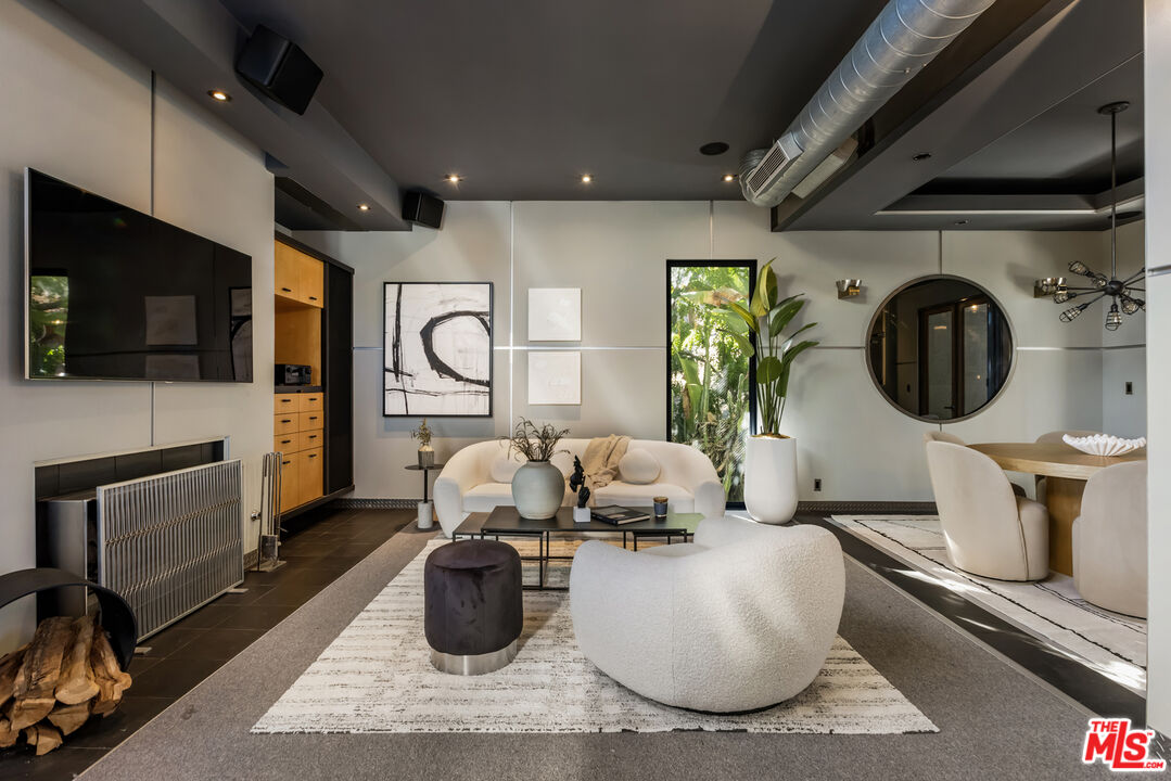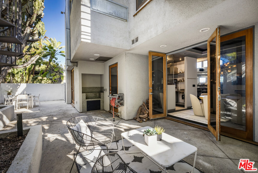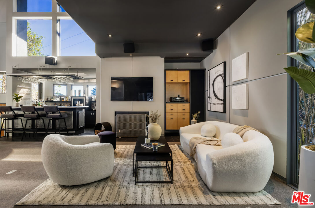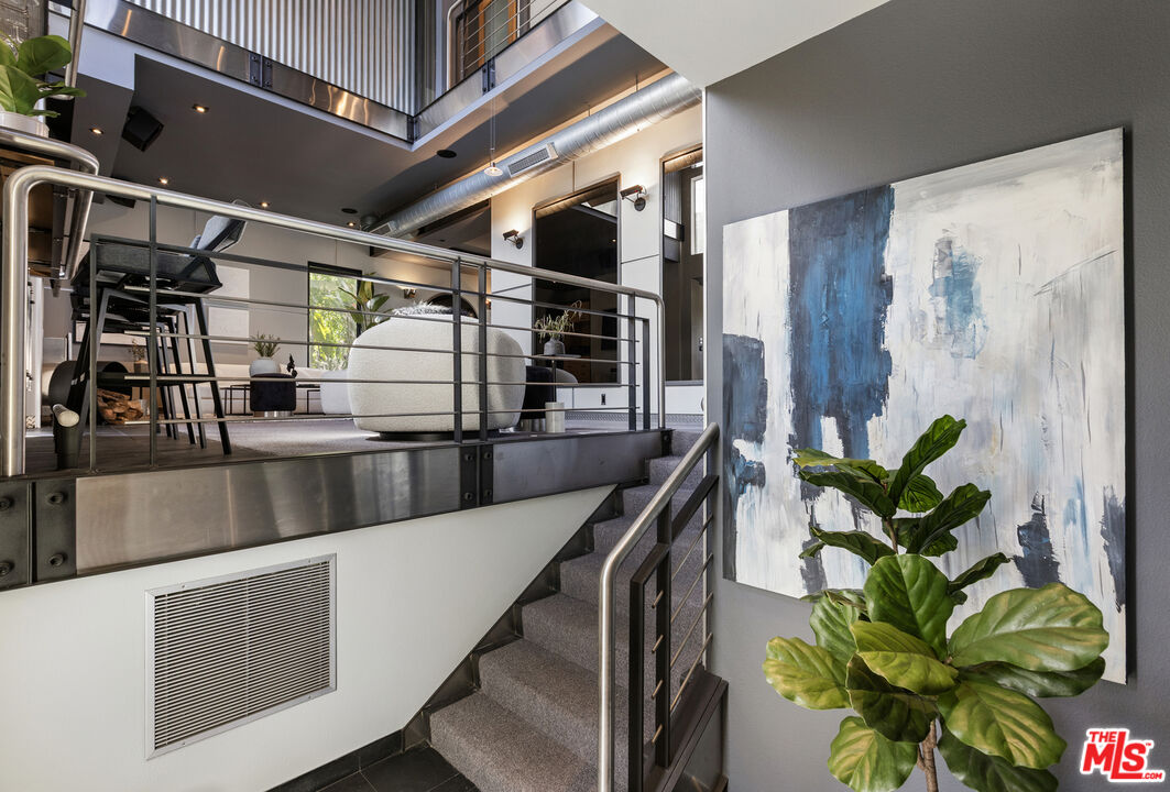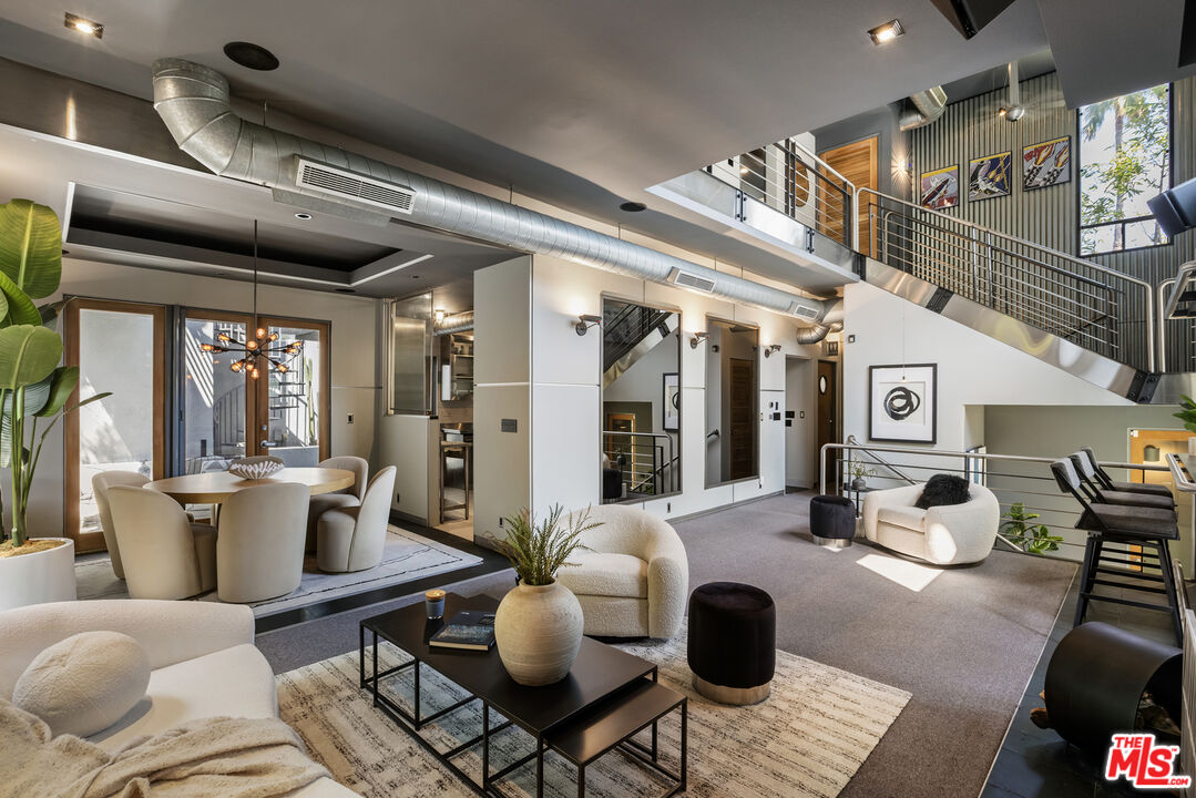 Originally designed and built in 1991 by A. Kiyohara, Moffitt & Shaver as an Architectural Showcase, this one-of-a-kind home combines striking industrial style with sustainable living. From its solid, mindful construction and low carbon footprint, to its drought-tolerant landscaping of cacti and native vegetation, the property reflects a commitment to both design and eco-consciousness. Inside, the open-concept living area features soaring ceilings, exposed ductwork, a custom fireplace, a built-in 5.1 surround sound system, and unique lighted ceiling fans. Entertain with ease thanks to GraficEye and Lutron lighting controls, a built-in bar, and a seamless flow into the dining space. The chef's kitchen is a true showpiece, boasting a Garland six-burner stove, a commercial-grade Traulsen refrigerator with a glass door, stainless steel and glass cabinetry, abundant storage, and a sleek breakfast nook. Beautiful wood-framed doors open to a large private patio, ideal for morning coffee or relaxed outdoor dining. Upstairs, the primary suite offers a spacious dressing room, a second fireplace, and a spa-like ensuite bathroom with LED lighting, a Kohler eight-jet soaking tub, a separate shower, and a double vanity. Sliding wood doors lead to an open-air bridge that connects to a private upper-level patio with sweeping views of DTLA-perfect for evening breezes and cocktails. A second bedroom with an adjacent guest bath provides comfort and flexibility. With its Murphy-style pull-down bed, it easily doubles as a home office. The home also includes a versatile flex space, ideal as an office, gym, or recording studio, along with direct access to the two-car garage, which offers additional storage and driveway parking. Located on a quiet cul-de-sac in the heart of Silver Lake, this unique industrial-inspired residence enjoys a high walk score and is just moments from scenic parks, the Silver Lake Reservoir, and an eclectic mix of local restaurants and shops.