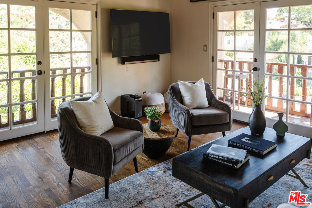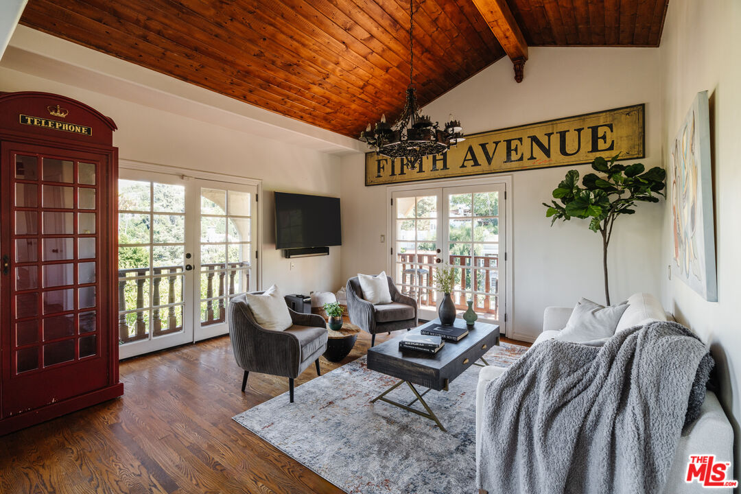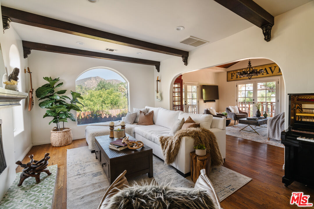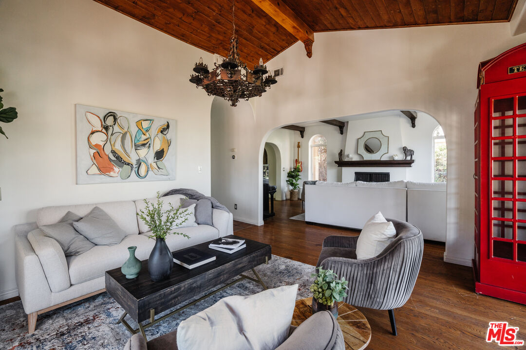 Seduction meets sophistication in this fully gated 1920s Spanish compound nestled in the coveted Hollywood Hills. A seamless blend of old-world romance and modern refinement, the residence showcases rich hardwood and tile floors, smooth stucco walls, and lush, greenery-lined outdoor spaces framing tranquil mountain and treetop views. Some cosmetic upgrades needed to this 4 bedroom and 4 bathroom residence offering 3235sf of living space plus an additional 750sf, 4 car garage. Sunlight pours through expansive picture windows, casting a warm glow across thoughtfully designed living spaces. Enter on the upper level where a chef's kitchen anchors elegant formal living, dining, and family rooms each designed for effortless entertaining and intimate gatherings alike. The second level hosts three bedrooms, including a sumptuous primary suite complete with a cedar-lined closet, private view deck, and spa-inspired bath featuring a deep soaking tub for indulgent evenings. The lower level transforms into a dramatic flex space ideal as a cinematic screening room, art studio, or executive retreat. With its own private entrance, the attached one-bedroom casita offers a stylish living area and kitchenette perfect for guests or additional income potential. Outdoors, custom fountains and a private hot tub create a resort-like escape, complemented by multiple dining terraces and decks designed to capture the California breeze. A rare street-to-street lot with dual entrances and ultimate privacy elevate the offering. Moments from iconic restaurants, boutique shopping, scenic hiking trails, the Hollywood Bowl, and major studios, this secluded hillside sanctuary delivers timeless allure with modern luxury.