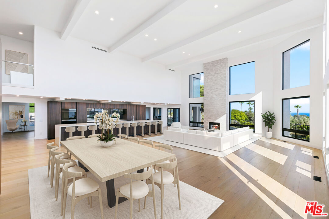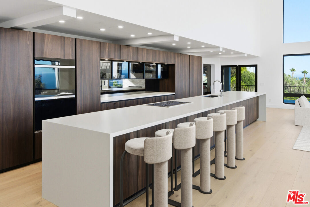 Set behind gates on five private acres overlooking Malibu's Encinal Bluffs, this substantial coastal estate offers a rare combination of land, privacy, and ocean orientation just moments from the Pacific. Properties of this scale with established grounds and panoramic views are increasingly difficult to find this close to the coastline. A long private drive leads to more than 10,000 square feet under roof, where soaring cathedral ceilings and walls of glass frame sweeping ocean vistas from nearly every room. Designed for both comfortable daily living and large-scale gatherings, the residence includes six bedrooms and five full plus two half bathrooms, including two ocean-view primary suites. The expansive open-concept kitchen connects seamlessly to multiple living and dining areas centered around a dramatic great room. An approximately 2,000-square-foot finished lower level provides flexible space for a private office, wine storage, gym, media room, or additional storage, along with direct drive-in access ideal for collectors, hobbyists, or secure vehicle storage. Outdoor amenities include multiple terraces positioned for sunset views, a resort-style pool and spa, generous lawns, and a mature orchard that enhances the property's park-like character. Garage parking for up to nine vehicles, together with a large motor court accommodating additional cars, underscores the estate's scale and versatility. Fully gated and approached by a long private drive, the property offers a high degree of privacy and security while remaining close to beaches, shopping, and central Malibu amenities. The combination of acreage, established landscaping, panoramic ocean views, and substantial living space makes this a rare offering for those seeking a true Malibu estate with both privacy and proximity to the ocean.