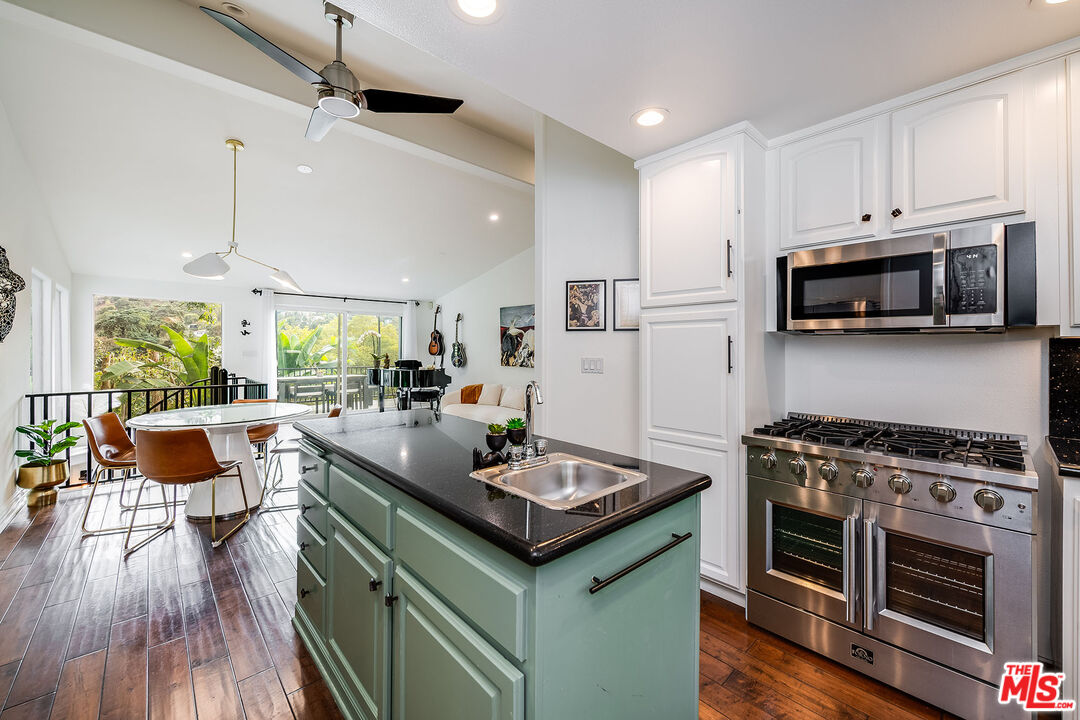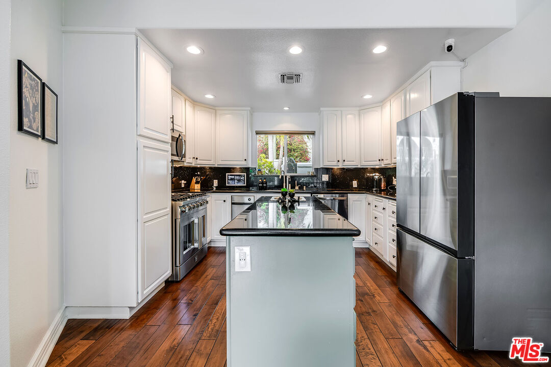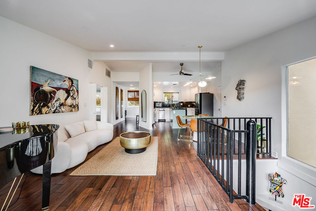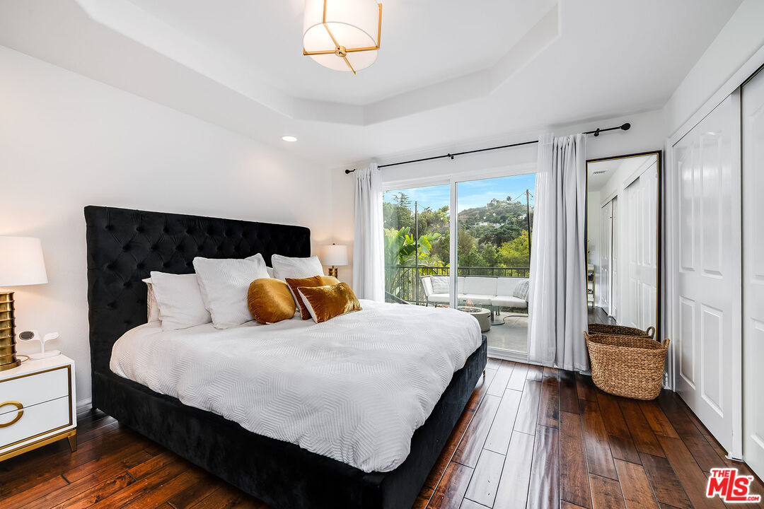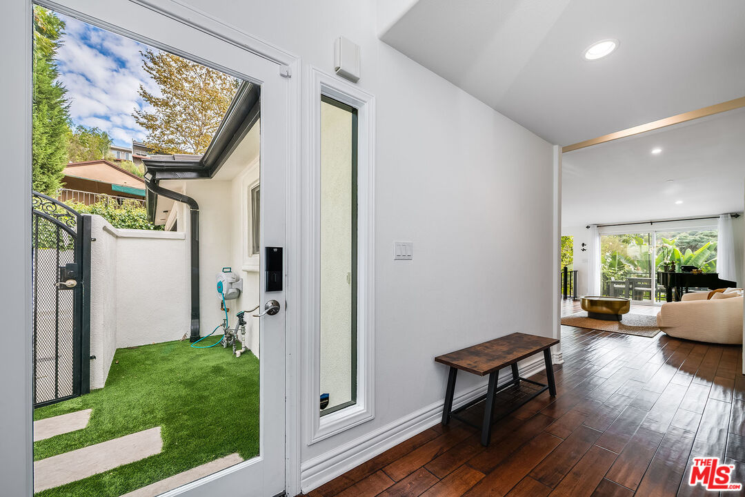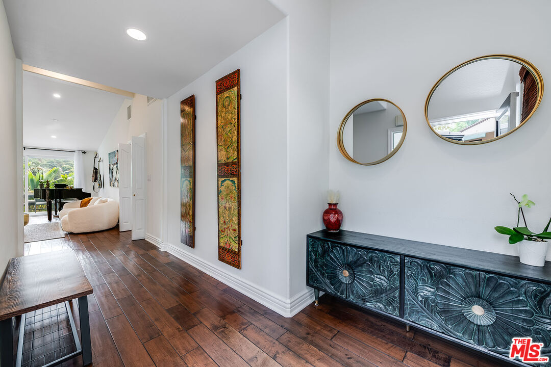 Tucked away in the desirable Lake Hollywood Knolls, this beautifully updated Hollywood Hills residence combines modern comfort with picturesque hillside views. Inside, rich hardwood floors, soaring ceilings, and an abundance of natural light create an inviting and elevated atmosphere. The open-concept chef's kitchen features new stainless steel appliances, a center island, and generous cabinetry ideal for both everyday living and entertaining. Spanning approximately 2,100 square feet, the flexible floor plan offers 4 bedrooms and 3 bathrooms, providing ample space to live, work, and unwind. The primary suite and main living area open onto a private balcony with sweeping mountain views, while the lower-level family room with its own bar, sink, and dishwasher flows seamlessly into a serene backyard oasis. Outside, enjoy a Zen fountain, built-in smoker, and BBQ perfect for relaxing or hosting guests. Additional highlights include custom closet systems, a spacious two-car attached garage with built-in cabinetry and overhead storage, smart home upgrades, an EV charger, and a new 2023 roof backed by a 15-year warranty. Gated for privacy and nestled on a quiet cul-de-sac, the property also features multiple outdoor living spaces designed for year-round enjoyment. Located just minutes from Hollywood, Studio City, Burbank, Downtown LA, and other top destinations, this tranquil retreat offers style, space, and exceptional access to the heart of Los Angeles.