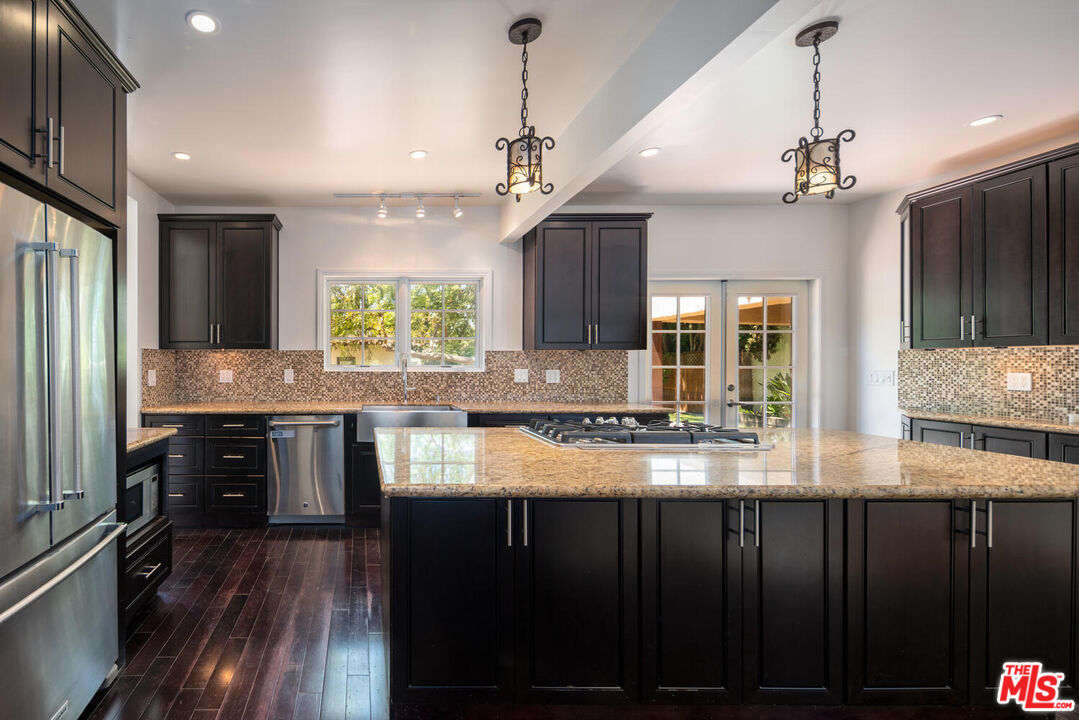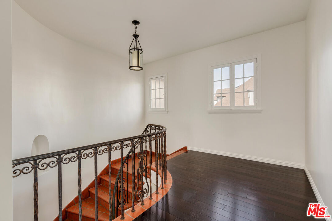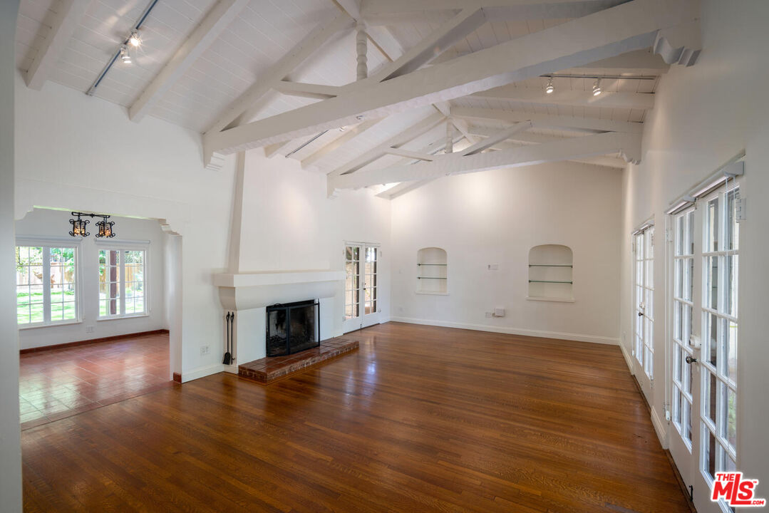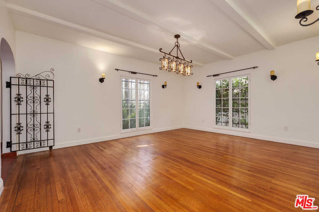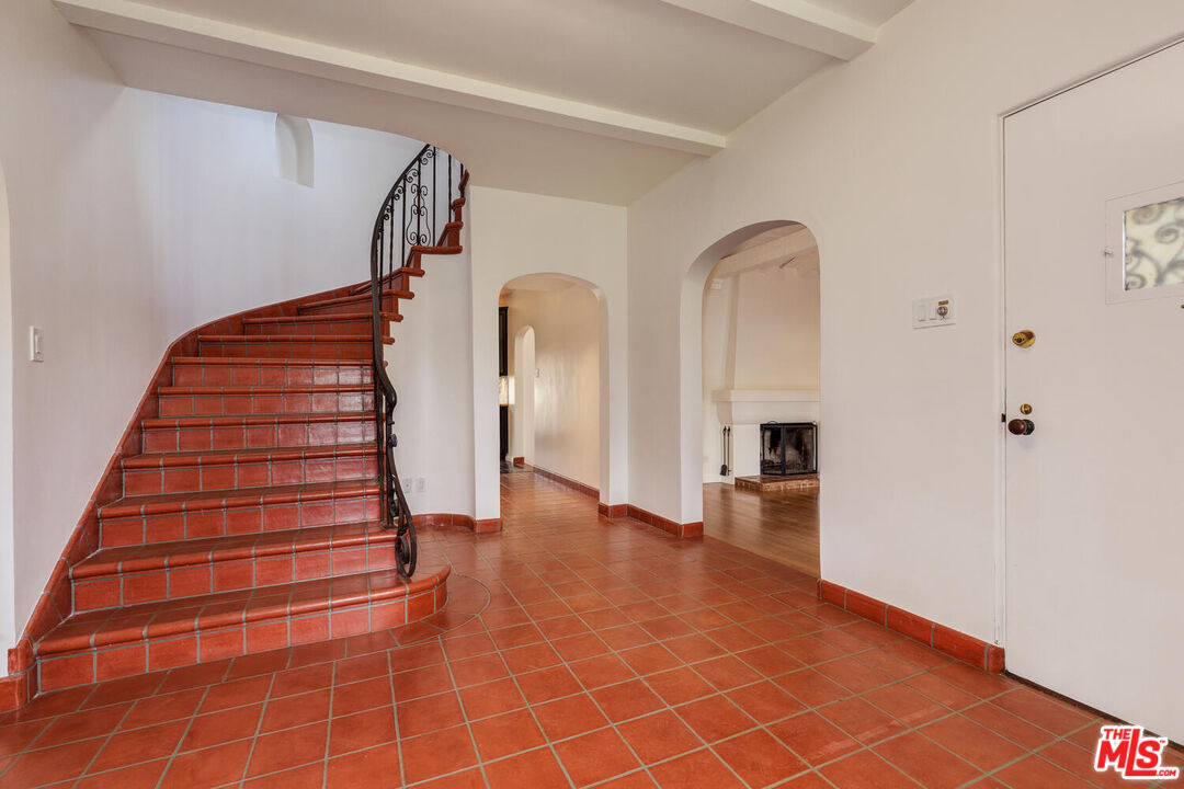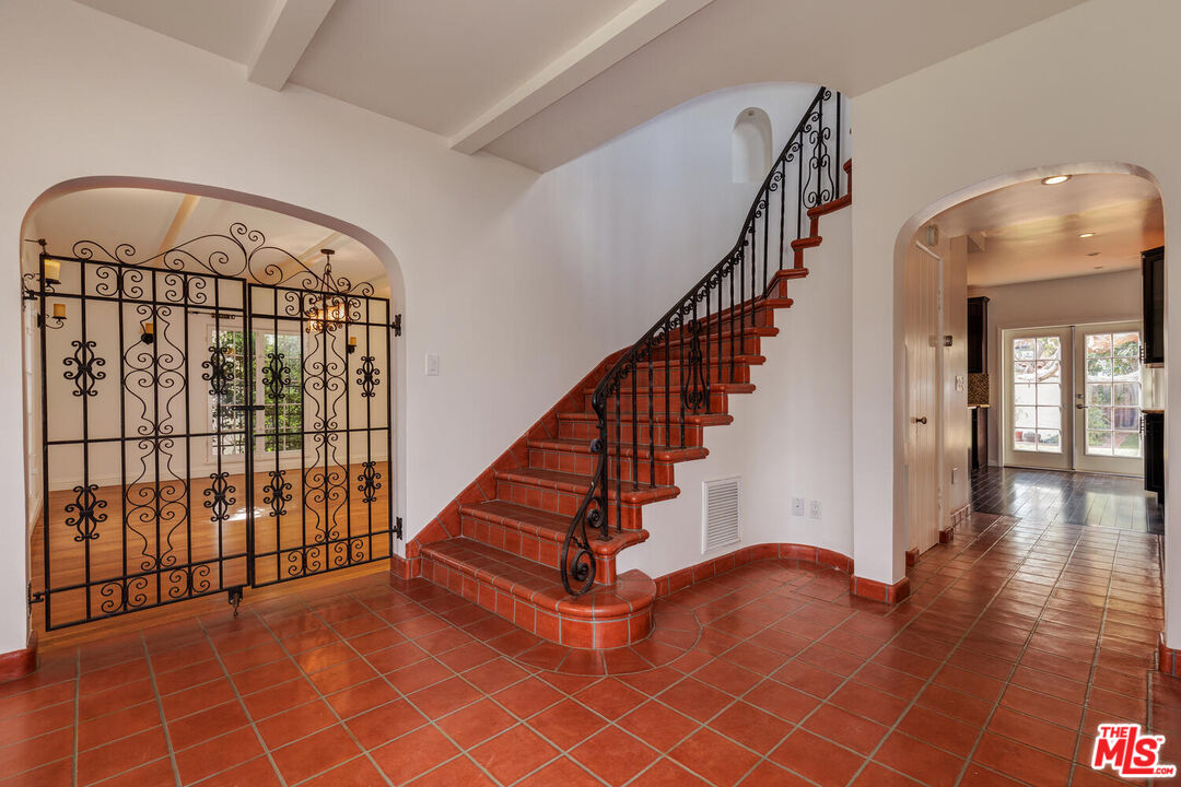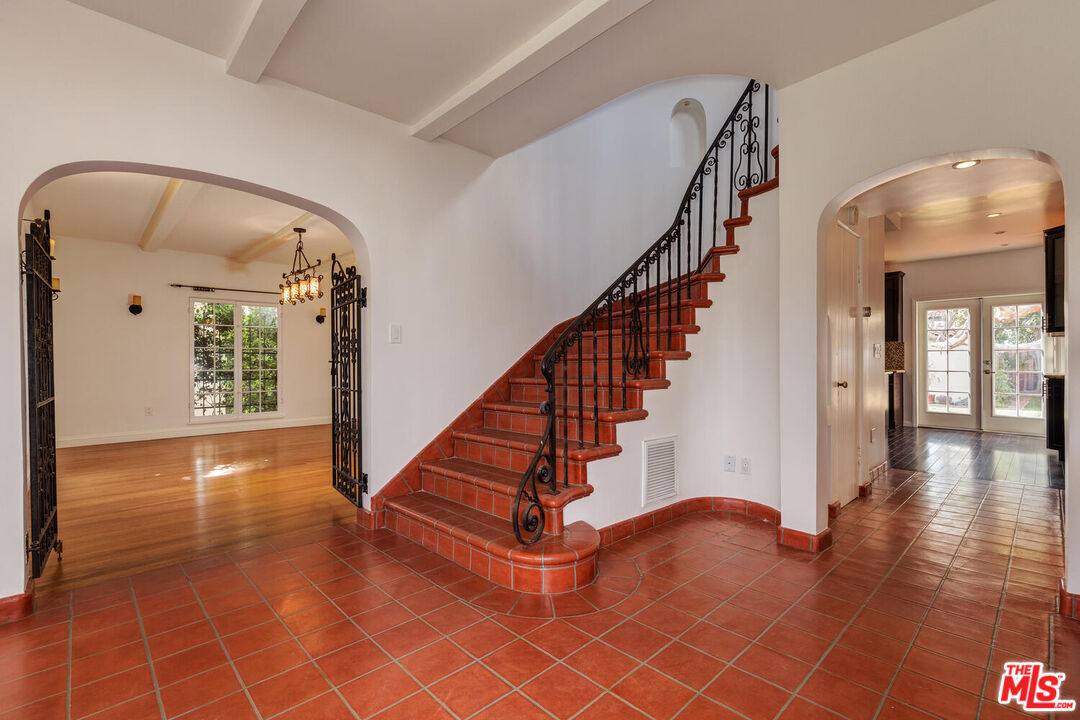 1920's Spanish-style residence with generous front porch, in renowned Hancock Park! A perfect blend of authentic character and designer redone kitchen and baths. Formal entry into a dramatic foyer with a graceful winding staircase and decorative wrought iron. Beautiful tile and polished hardwood floors flow throughout. Spacious cathedral-ceiling living room featuring exposed beams and a big fireplace. Soft recessed lighting enhances the warm ambiance. Large dining room capable of accommodating intimate or grand entertaining. Four good sized bedrooms and three and a half tastefully renovated bathrooms. Elegant primary suite offers an expansive walk-in closet and a luxurious ensuite bathroom. Additional space upstairs suitable for an office or playroom. Convenient maid's quarters, additional bathroom, and bright breakfast room. The Modern chef's kitchen is large with a generous center island and abundant storage. Separate laundry room. Serene, lush green yard is like a park with a beautiful mature Elm tree and complete privacy. Rear garage now finished as an office, gym, or playroom with yet one more smaller room both with separate entrances. Outdoor deck accessible from the kitchen and the living room provides intimate space for outdoor entertaining and dining. Equipped with a Ring security system, electric vehicle charging station, and alarm system. The converted garage is not included in the square footage. The property is located in the Hancock Park Historic Preservation Overlay Zone. Trust sale, as is.