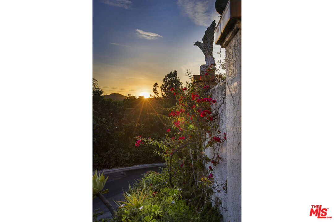 Casa de Manana- Spanish Colonial Revival. Timeless Spanish Colonial Revival residence set on a private canyon lot with sweeping western sunset and city views. Lovingly restored with exceptional attention to detail, blending classic Mediterranean warmth with artisanal craftsmanship. Features include a traditional red clay tile roof, arched entryways, lath-and-plaster walls, handmade tile accents, and beautifully preserved original details throughout. Charming courtyard entry with fountain and magnolia tree leads to a romantic portico and below-ground wine bodega. Interior highlights include tongue-and-groove oak and mahogany floors, stained wood doors, leaded stained-glass windows, original light fixtures and hardware. Elegant living room with gas fireplace adorned with rare Spanish tiles opens via French doors to a serene patio, koi pond, and manicured gardens beneath a century-old oak. Spacious chef's kitchen with canyon views, stone countertops, breakfast bar, rich cabinetry, Wolf range, and breakfast nook flows seamlessly into dining and family areas. Additional upgrades include a new electrical panel, sewer, and all water pipes replaced with copper. Private deck with hot tub and fire pit provide the perfect setting to enjoy unforgettable sunsets. A rare and beautifully preserved architectural offering.