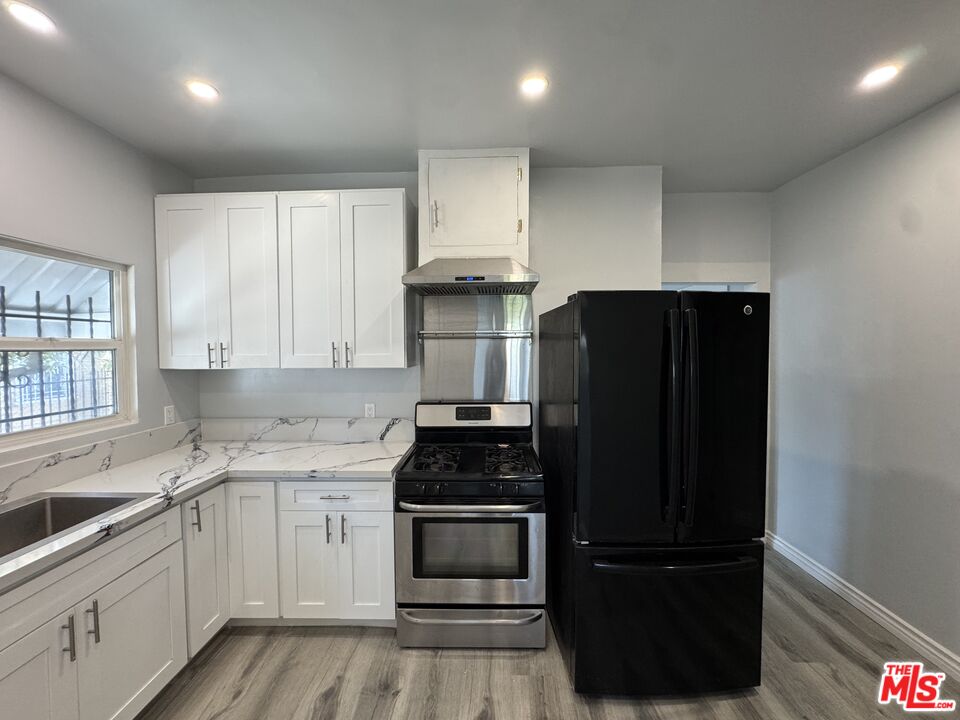Once in a lifetime opportunity! Own a house completely redone for the modern buyer, all from top to bottom! This newly redone 3 bedroom, 1 bath property is a true gem in LA! Brand new plumbing, brand new electric, brand new recess lighting, brand new floors, new windows, brand new and exquisitely designed kitchen with brand new quartz countertops and appliances, brand new kitchen cabinets, new hood, brand new living room, brand new bathroom & shower, brand new vanity, brand new appliances, spacious rooms with closets, & much more complete the interior and welcome you into this amazing property. Backyard with fruit trees (lemon and orange), covered patio, garage and driveway, and basement all complete the property. Property is down the street from school, shops, & entertainment. Public records shows that the property is a 2 bedroom/1 bath, however, it is functioning as a 3 bedroom/1 bath and has more square footage than what public records show. Don't miss this opportunity!