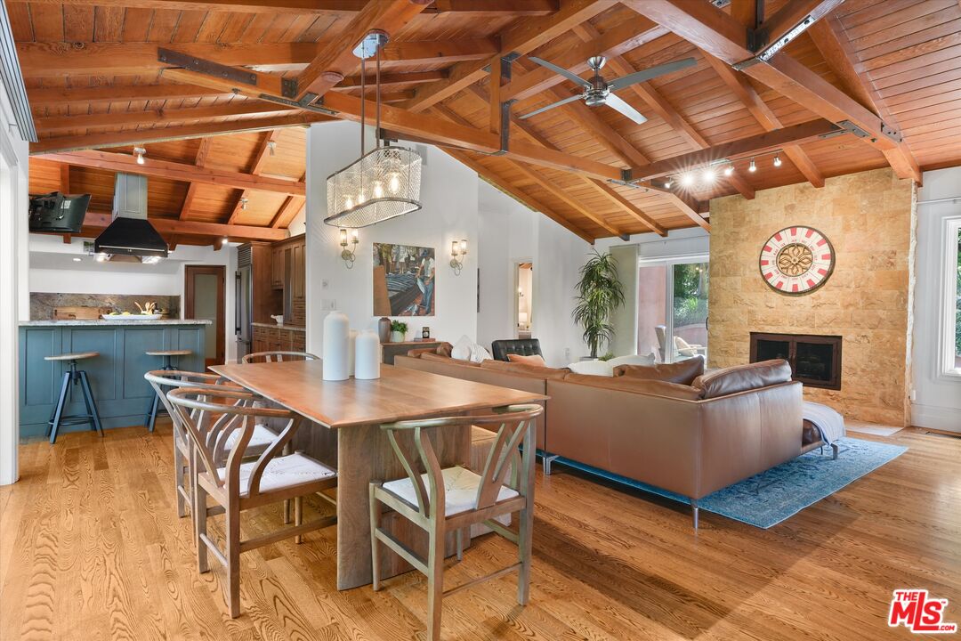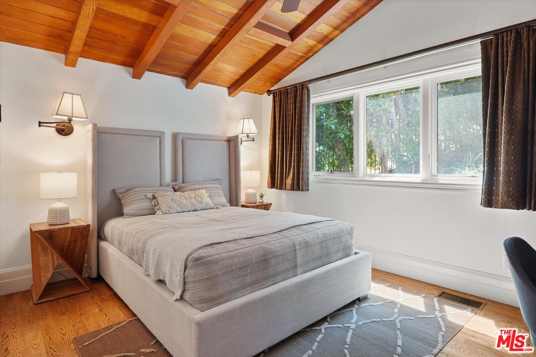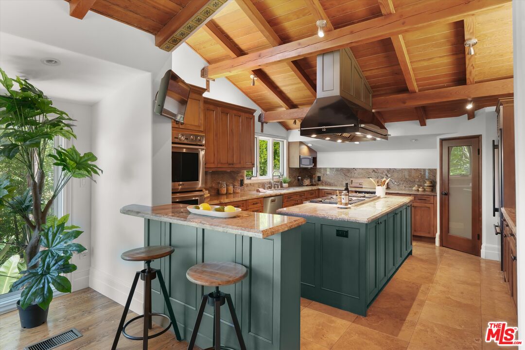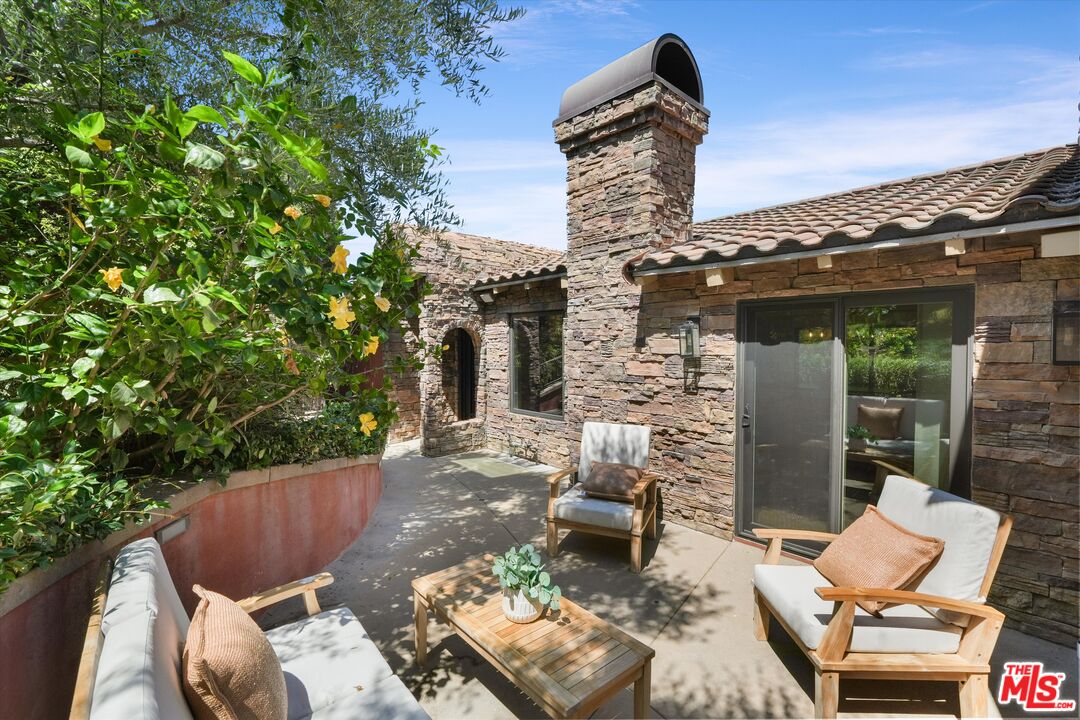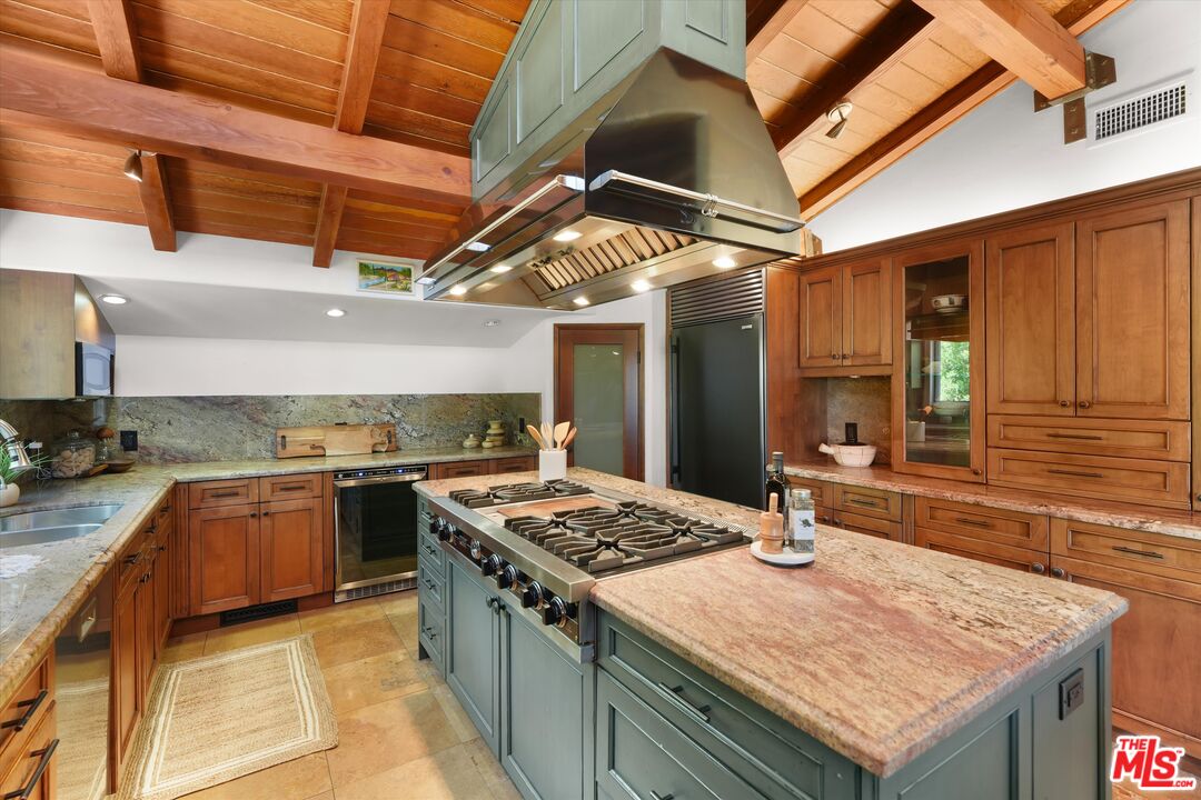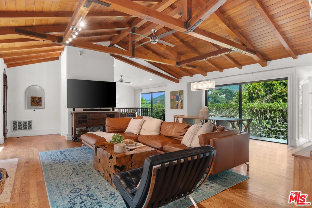 Perched in the Hollywood Hills, this Tuscan-inspired retreat blends timeless character with modern comfort. Vaulted wood-beam ceilings, rich hardwood floors, and an airy open layout create a warm, inviting atmosphere throughout. The spacious living room centers around a stunning stone fireplace, while the chef's kitchen impresses with Viking, Thermador, and Sub-Zero appliances, stone countertops, a wine fridge, and abundant cabinetry. Spa-like bathrooms feature deep soaking tubs, walk-in showers, and skylights that fill the space with natural light. The primary suite offers a peaceful escape with a private balcony, large walk-in closet, and a cozy sitting area or office. A downstairs guest suite with patio access provides comfort and privacy for visitors or extended family. A true highlight of the property, the custom-built professional sound studio features Canadian white oak floors, acoustic wall treatments, and LED-lit ceiling clouds, designed for world-class soundproofing and creative inspiration. Multiple outdoor patios with lush landscaping and a fireplace offer perfect settings for entertaining or relaxing under the stars. Just minutes from iconic Hollywood landmarks, Griffith Observatory, Universal Studios, and the Sunset Strip, this home combines privacy, character, and the magic of Hollywood Hills living.