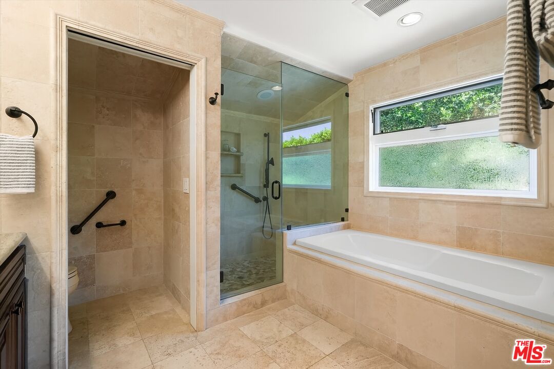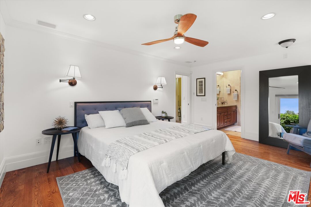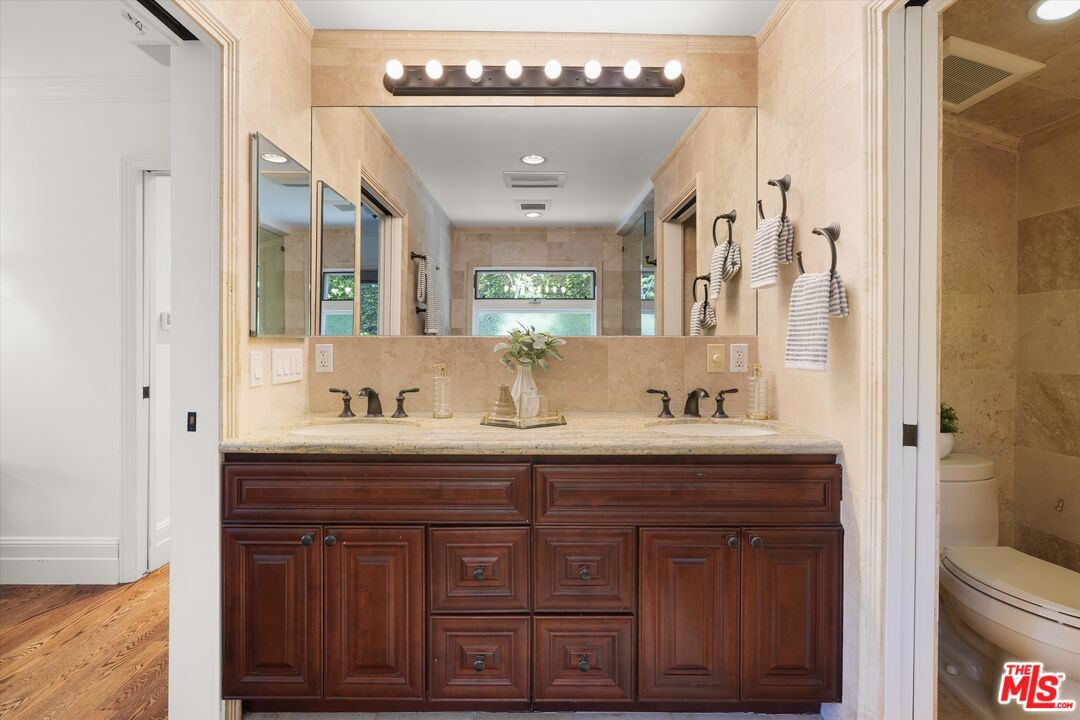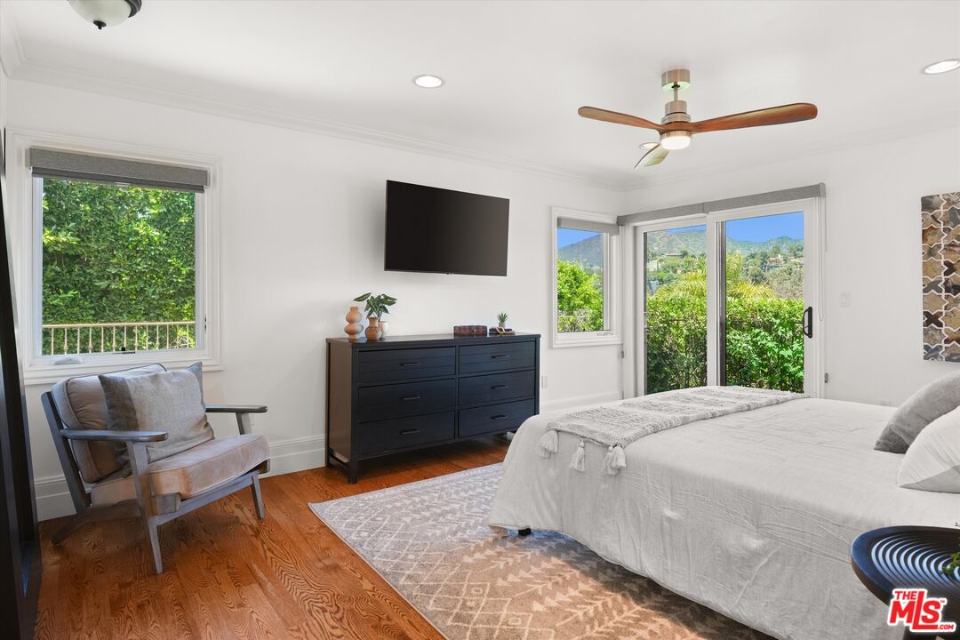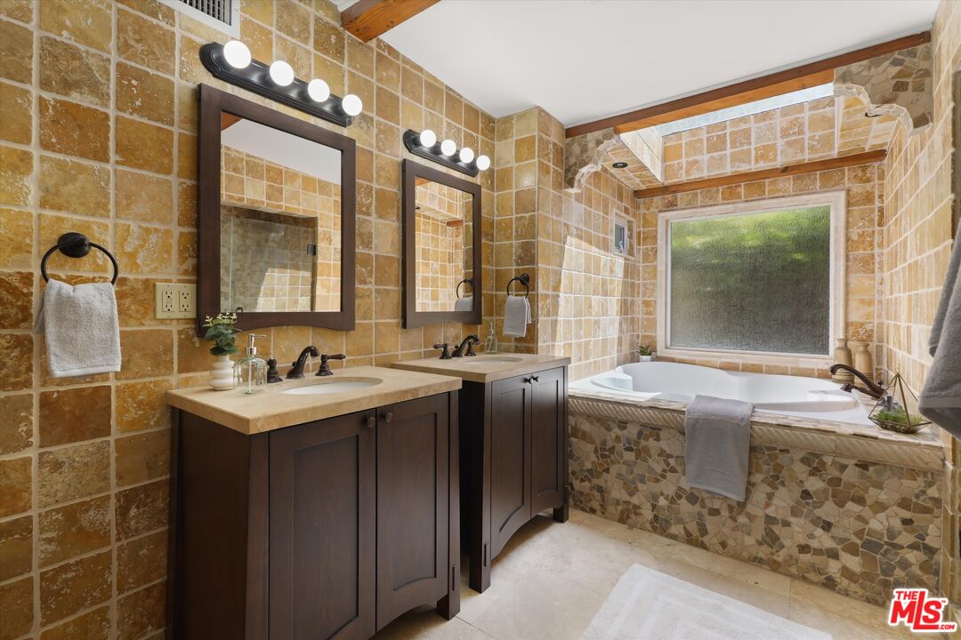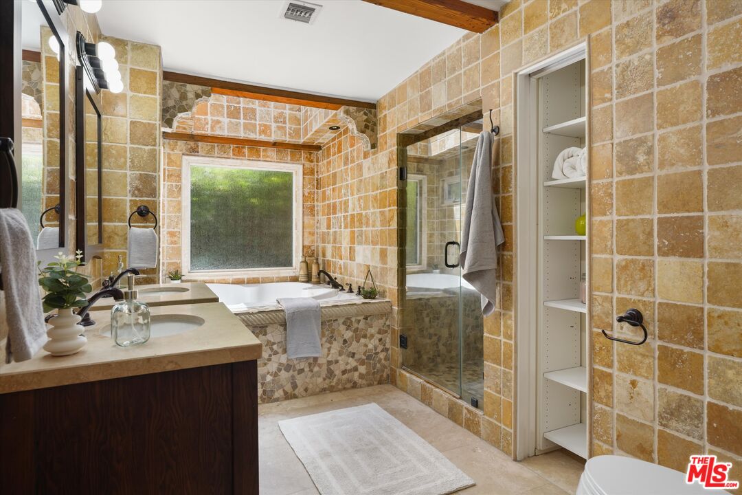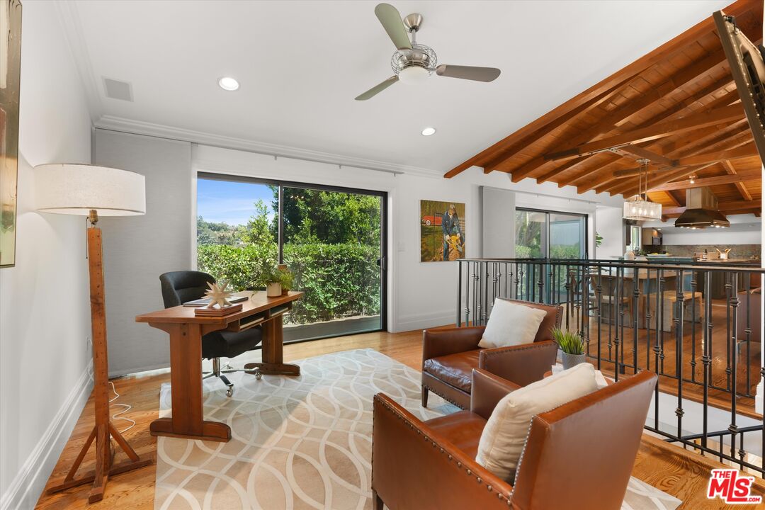 Perched in the Hollywood Hills, this Tuscan-inspired retreat blends timeless character with modern comfort. Vaulted wood-beam ceilings, rich hardwood floors, and an airy open layout create a warm, inviting atmosphere throughout. The spacious living room centers around a stunning stone fireplace, while the chef's kitchen impresses with Viking, Thermador, and Sub-Zero appliances, stone countertops, a wine fridge, and abundant cabinetry. Spa-like bathrooms feature deep soaking tubs, walk-in showers, and skylights that fill the space with natural light. The primary suite offers a peaceful escape with a private balcony, large walk-in closet, and a cozy sitting area or office. A downstairs guest suite with patio access provides comfort and privacy for visitors or extended family. A true highlight of the property, the custom-built professional sound studio features Canadian white oak floors, acoustic wall treatments, and LED-lit ceiling clouds, designed for world-class soundproofing and creative inspiration. Multiple outdoor patios with lush landscaping and a fireplace offer perfect settings for entertaining or relaxing under the stars. Just minutes from iconic Hollywood landmarks, Griffith Observatory, Universal Studios, and the Sunset Strip, this home combines privacy, character, and the magic of Hollywood Hills living.