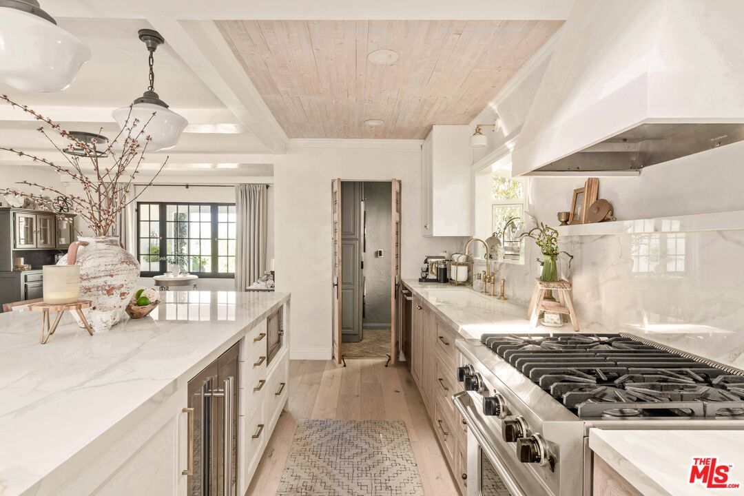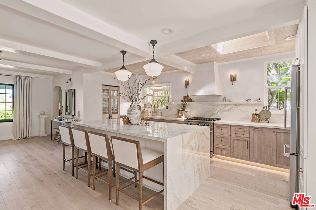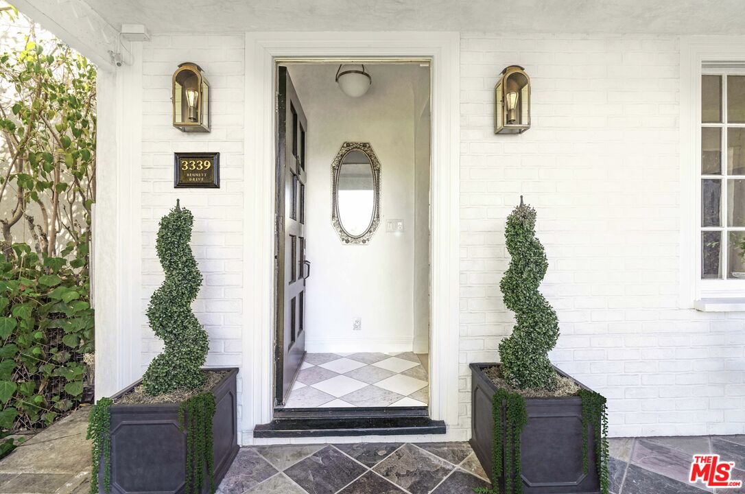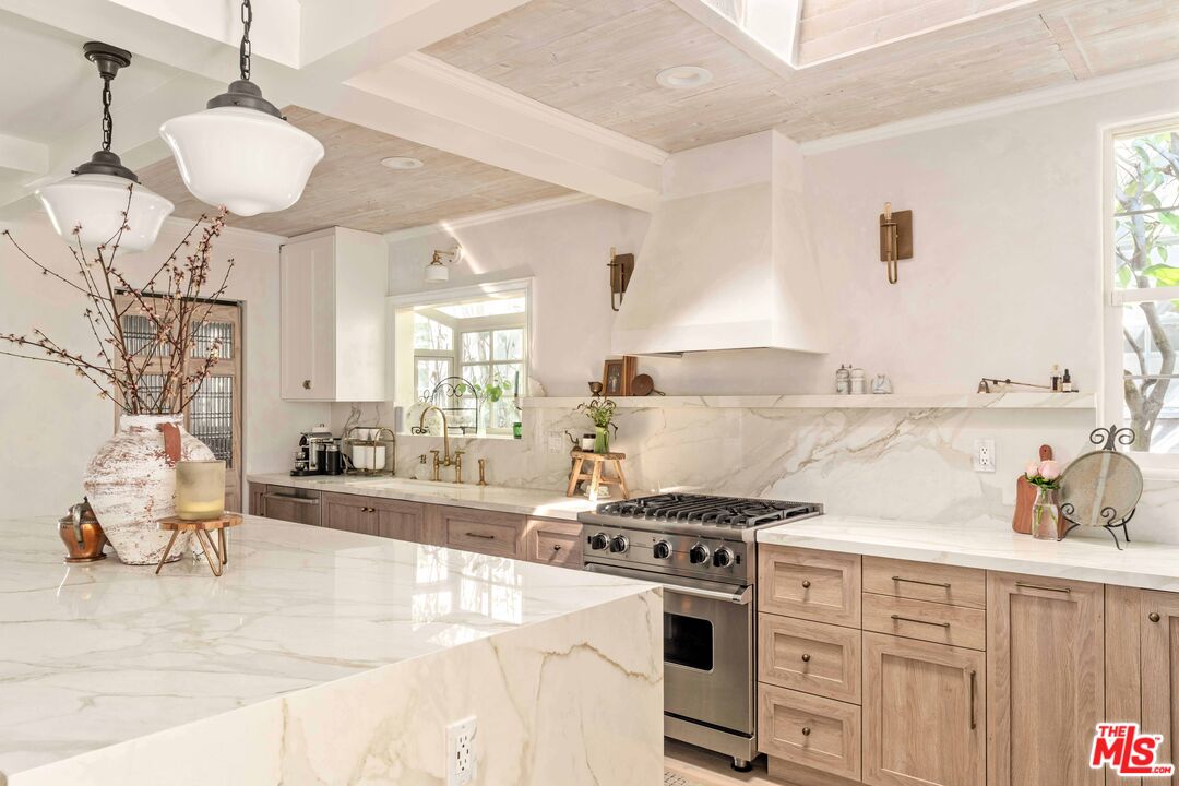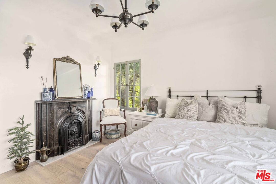 Nestled in the Hollywood Hills on a corner lot is this elegant 1934 traditional gated home surrounded by serene canyon vistas offering 4 bedrooms and 3 bathrooms with 2,352 of interior square footage spanning over two-stories. This sophisticated residence tastefully combines the modern conveniences of today and timeless old-world charm that will have you feeling like you're on a European getaway. Beamed ceilings, decorative archways, new hardwood floors, Mullion windows, original doors and imported hardware seamlessly meld together to create an alluring ambience. The main level is comprised of a reimagined open living space that includes a newly remodeled eat-in kitchen with an oversized waterfall island accommodating seating for four, top of the line stainless steel appliances including a wine fridge, wood paneled ceilings, custom lighting and pantry. Adjacent to the kitchen is an inviting den featuring an adobe fireplace, and French doors that open to lush gardens, meandering pathways, lily pad dotted pond, mature fruit trees, multiple seating and dining areas plus an expansive roof top deck perfect al fresco dining or hosting a lavish party under the stars on the magical sprawling grounds. All three guest bedrooms also on the main level are drenched in sunlight and enjoy beautiful vistas of the hills. The lower level offers its own separate entrance and consists entirely of a spacious primary suite with new Chevron white oak floors, a chic updated bathroom with dual vanity, separate shower and tub, a flexible office/sitting area, built-in vanity area and extra storage. Conveniently located near Universal Studios, the iconic Hollywood Bowl, hiking trails, popular restaurants and shops in both Studio City and Hollywood with several neighborhood eateries just blocks away. A detached three-car garage, hot tub and gated driveway with keypad security entrance complete this private Hollywood Hills oasis.