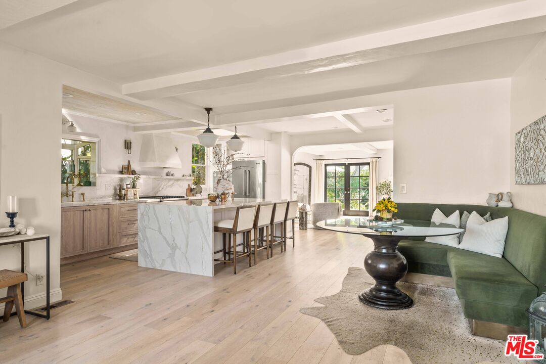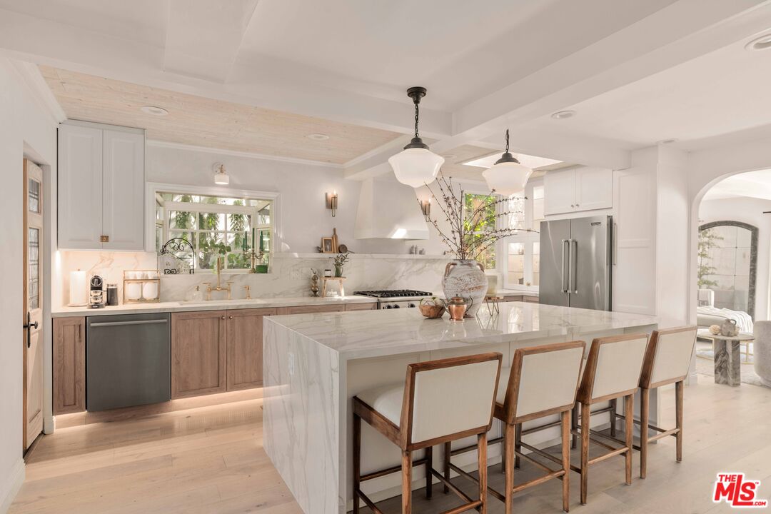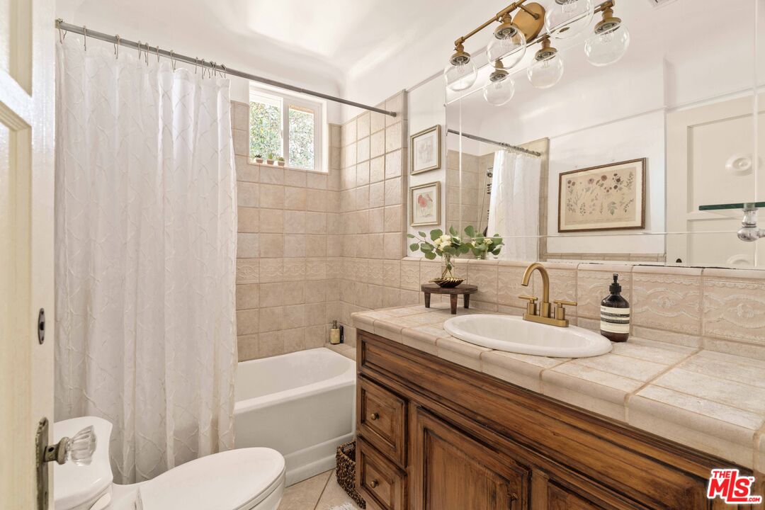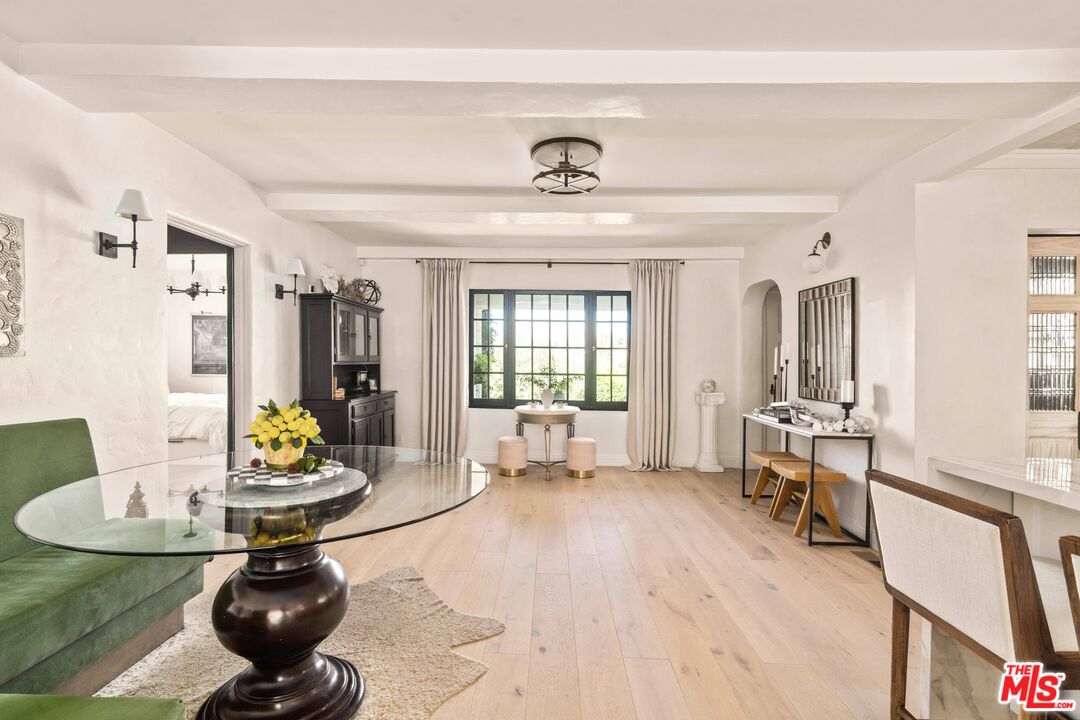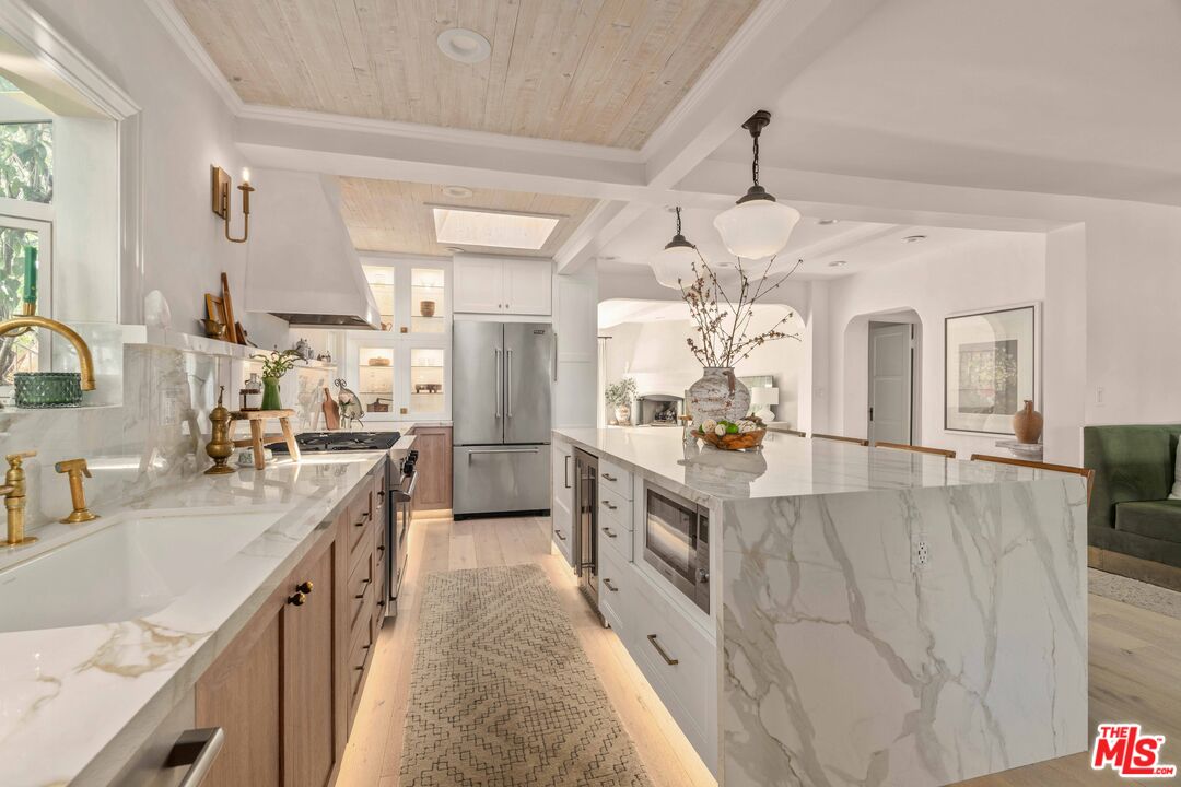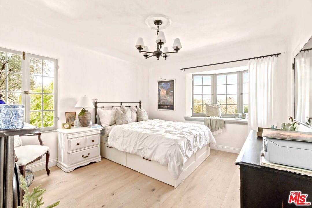 Nestled in the Hollywood Hills on a corner lot is this elegant 1934 traditional gated home surrounded by serene canyon vistas offering 4 bedrooms and 3 bathrooms with 2,352 of interior square footage spanning over two-stories. This sophisticated residence tastefully combines the modern conveniences of today and timeless old-world charm that will have you feeling like you're on a European getaway. Beamed ceilings, decorative archways, new hardwood floors, Mullion windows, original doors and imported hardware seamlessly meld together to create an alluring ambience. The main level is comprised of a reimagined open living space that includes a newly remodeled eat-in kitchen with an oversized waterfall island accommodating seating for four, top of the line stainless steel appliances including a wine fridge, wood paneled ceilings, custom lighting and pantry. Adjacent to the kitchen is an inviting den featuring an adobe fireplace, and French doors that open to lush gardens, meandering pathways, lily pad dotted pond, mature fruit trees, multiple seating and dining areas plus an expansive roof top deck perfect al fresco dining or hosting a lavish party under the stars on the magical sprawling grounds. All three guest bedrooms also on the main level are drenched in sunlight and enjoy beautiful vistas of the hills. The lower level offers its own separate entrance and consists entirely of a spacious primary suite with new Chevron white oak floors, a chic updated bathroom with dual vanity, separate shower and tub, a flexible office/sitting area, built-in vanity area and extra storage. Conveniently located near Universal Studios, the iconic Hollywood Bowl, hiking trails, popular restaurants and shops in both Studio City and Hollywood with several neighborhood eateries just blocks away. A detached three-car garage, hot tub and gated driveway with keypad security entrance complete this private Hollywood Hills oasis.