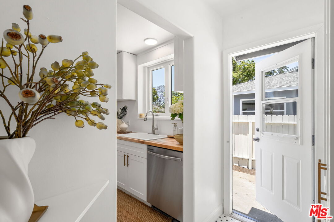 Welcome to this sunny and updated 3 bedroom (plus den/office), 2 bath traditional home in the highly sought after Castle Heights neighborhood, a perfect blend of classic charm and modern upgrades. Inside, you'll find original hardwood floors, crown moulding, beautiful updated light fixtures, and a picturesque bay window that adds warmth and character. The spacious, light filled living room features a fireplace with original charm, and the inviting dining area opens into a newly remodeled kitchen including butcher block countertops, a farmhouse sink, and tasteful finishes that combine functionality with timeless style. In addition to the three generously sized bedrooms, a bonus den or office connects to the private primary suite. The sunny primary bedroom includes French doors that open to the backyard, offering indoor outdoor flow. The home is equipped with a dual split system for efficient and customizable heating and cooling, along with an updated electrical panel and roof. Behind the detached two car garage, the additional approximately 208 square foot bonus room with French doors leading to the patio and backyard is perfect as a home office, gym, studio, playroom, or potential ADU. The main house public records show 1506 square footage. The flexible floor plan easily adapts to your lifestyle, whether you are working from home, entertaining, or enjoying quiet time in sunlit spaces. Located just one block from the shops and restaurants of Culver City and near award winning Castle Heights Elementary School, this home offers timeless appeal in an unbeatable location. We look forward to sharing it with you.