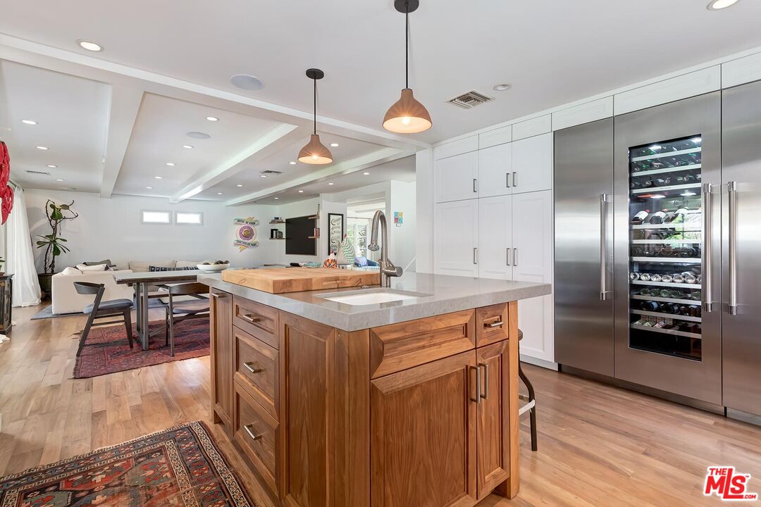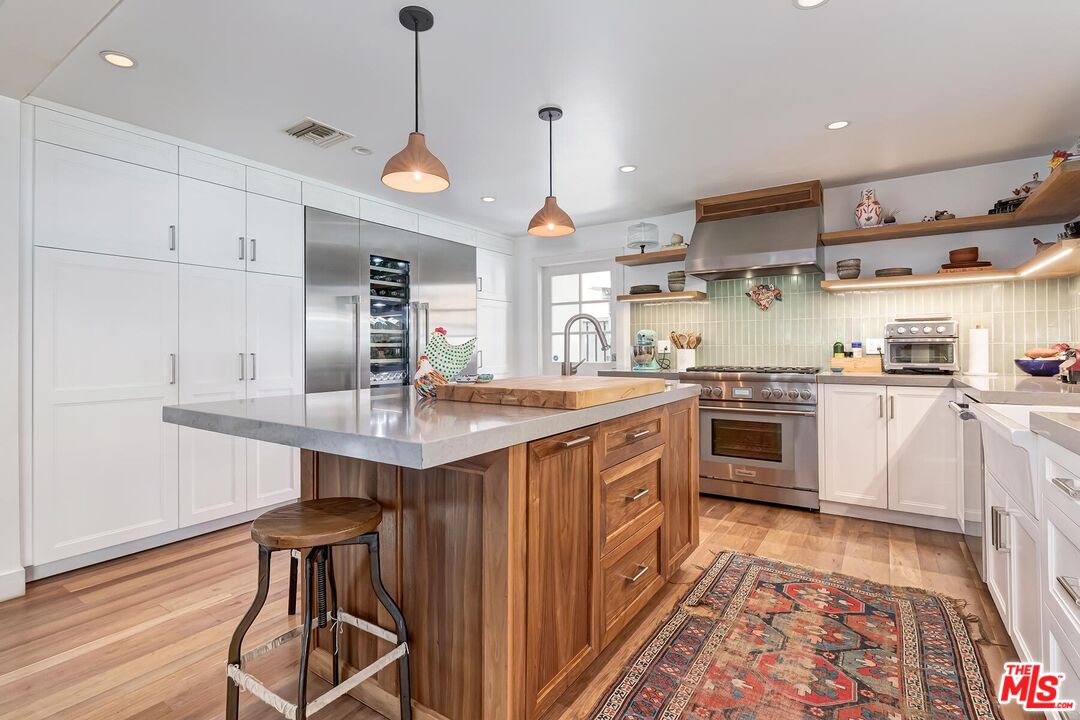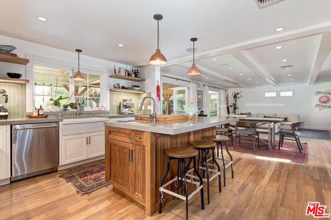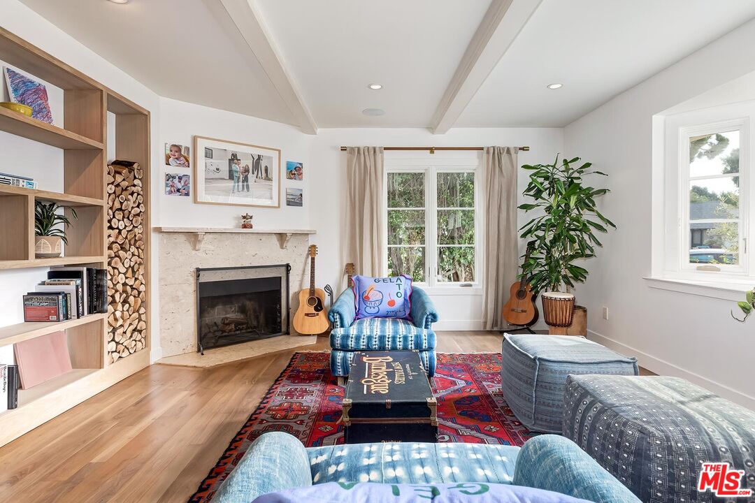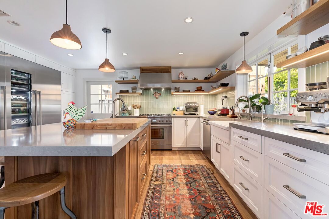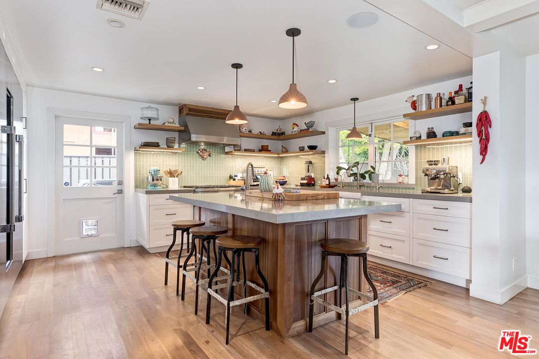 Tucked within the cradle of a tree-lined cul-de-sac on a quiet street in Cheviot Hills, this 4-bedroom/2.5-bath, 2,338 sq ft home is a designer's dream. The property features an awe-inspiring outdoor living extension, including an additional 600 sq ft covered patio with skylights, Basalt flooring, and a fire pit ideal to enjoy as is or easily enclosed to create an additional room for seamless indoor-outdoor living. A fully remodeled farmhouse with an open floor plan, the home offers warmth and elegance at every turn. Original walnut hardwood floors, a romantic bay window, a wood-burning fireplace, custom white oak shelving, and exposed beams create timeless character. The picturesque chef's kitchen features oak open shelving, a fire clay tile backsplash, stainless Thermador oven and range, refrigerator/freezer, wine fridge, and is anchored by a stylish eat-in island built from walnut with Caesarstone countertops. The private backyard is massive in scope, offering a vast expanse of grass, a hot tub, and a dizzying array of fruit-producing citrus trees including lime and Meyer lemon. Upstairs are the home's sleeping quarters, each bedroom generous in size with lovely natural light. The primary bedroom features a vaulted ceiling, an enormous walk-in closet, a large and beautiful bathroom, and a pretty view. Additional amenities include a new laundry area with stone counters, a new garage door (the converted garage has WiFi, heat/AC and is currently used as an artist's studio but can easily be returned to housing cars), new exterior paint, new windows, and a stone's throw to the Griffin Club, Expo Line, shops, and restaurants of Culver City and Cheviot Hills. An absolute jewel of a home on an especially family-friendly street, this one will not be on the market for long.
