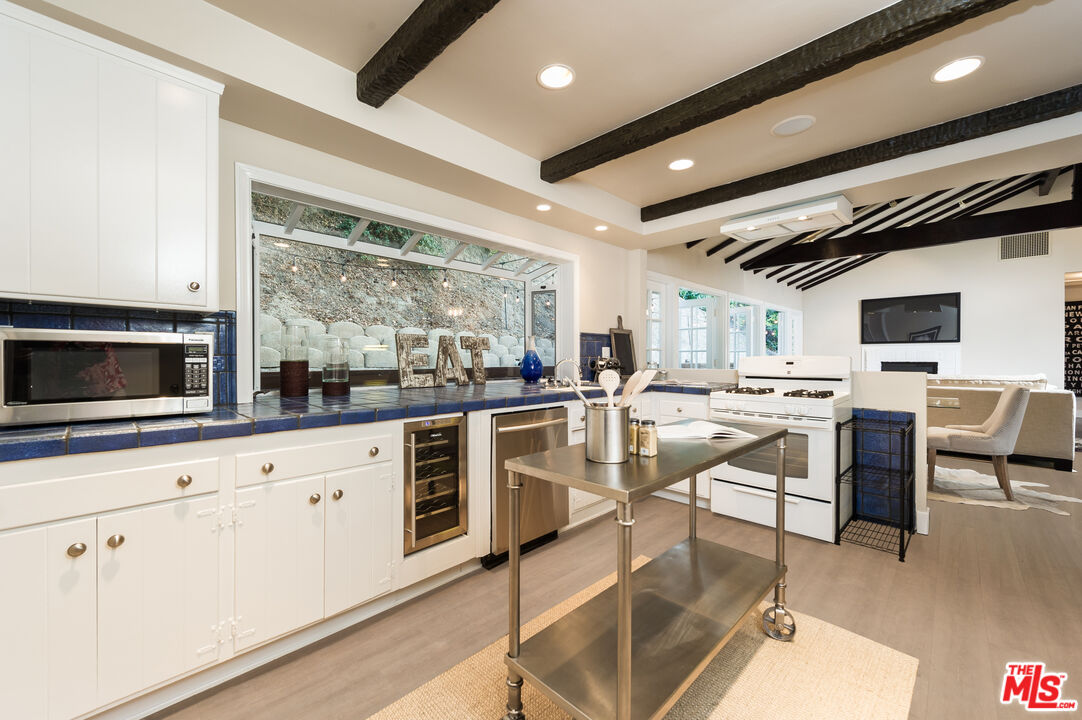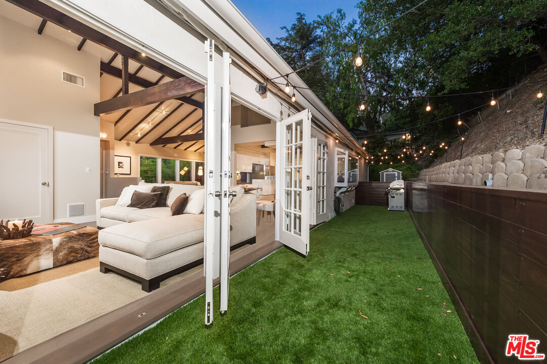 Stunning remodeled Traditional in Roscomare School District! Gated, private, and secure, this property is an oasis in a central location between Beverly Hills and the Valley. Upon entering through the controlled access gate you are greeted by a stone fountain, privacy hedge and expansive wrap-around grassy yard. The home has been extensively remodeled with newer baths, new plumbing, new sewer, new 200 amp panel, newer HVAC, newer doors and windows, newer appliances, fixtures, landscaping and drainage, and new floors. Enormous primary with en-suite bath and huge walk in closet and bay window with storage. Second bedroom with private full bathroom and 2 closets. Light and bright open floor plan with vaulted beamed ceilings and wall of floor-to-ceiling bookshelves with rolling library ladder. Large kitchen with extensive storage and counter space features a wine fridge. Great indoor/outdoor flow with 3 sets of French doors leading to the yard with cafe lighting, large sun shade, and built-in gas firepit. Come relax in your own private hideaway!