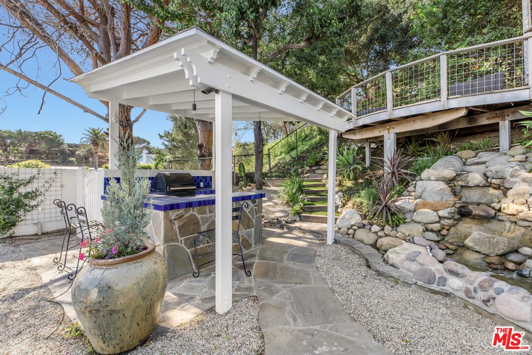 Nestled within the exclusive and thriving coastal enclave of Pacific View Estates, this sprawling single-level architectural home offers the rare combination of ocean views, modern comfort, and resort-style living on more than 20,000 square feet of private grounds. Located just moments from the beach and the Getty Villa, the residence is ideally positioned to take advantage of the serene coastal setting while remaining close to Palisades Village, Malibu, and the Westside. A dramatic skylit entry welcomes you into light-filled interiors where hardwood floors, vaulted ceilings, and French doors create a sense of scale and warmth. The expansive living room is anchored by a striking fireplace and opens seamlessly to outdoor entertaining areas, while the formal dining room is designed for gatherings both intimate and grand. The gourmet kitchen is a showpiece of form and function, featuring granite countertops, a center island, breakfast bay window, and an array of premium appliances: a Thermador range, GE Monogram refrigerator, GE microwave, Moen fixtures, and a Marvel wine fridge for curated storage. Skylights above flood the space with natural light, elevating both everyday meals and large-scale entertaining. The primary suite is a true retreat, complete with a sitting area, fireplace, dual walk-in closets, and a luxurious marble spa bath with dual sinks, a soaking tub, skylight, and glass shower. Additional bathrooms are appointed with Kohler fixtures and include an Axent.One C Plus intelligent toilet with full smart functionality. Secondary bedrooms offer versatility for guests, family, or office use, while a separate maid's or guest quarters adds privacy and convenience. Step outside to a backyard designed for leisure and entertainment. Multiple patios and decks frame a dramatic waterfall pool and spa, complemented by a built-in BBQ center, lush landscaping, and expansive lounge areas perfect for soaking in sunsets and coastal breezes. The generous lot size allows for both privacy and play, creating the feel of a personal resort. With its one-story design, high-end appointments, and seamless indoor-outdoor flow, this residence captures the essence of California living. Combining location, luxury, and lifestyle, it is an exceptional opportunity in one of the Westside's most desirable neighborhoods.