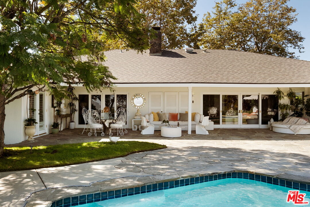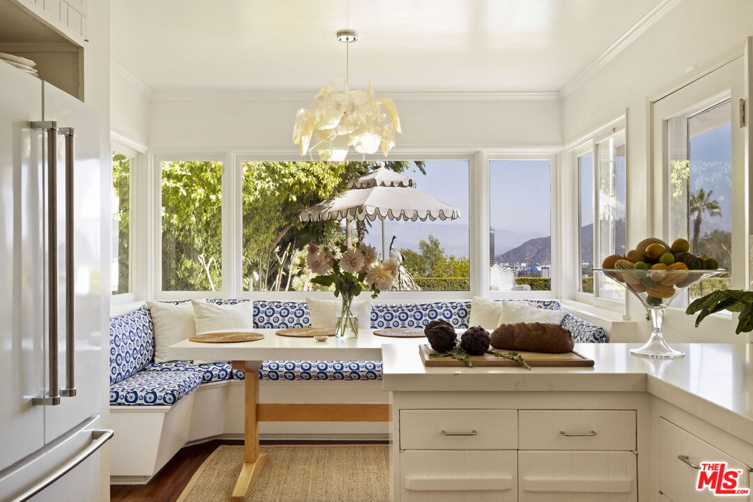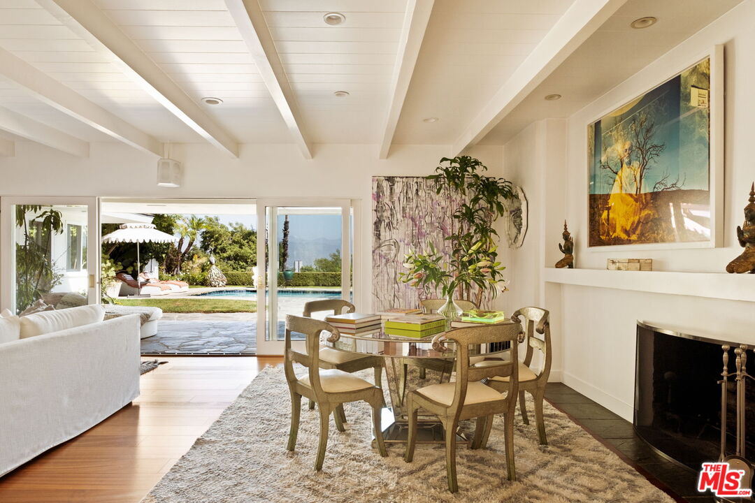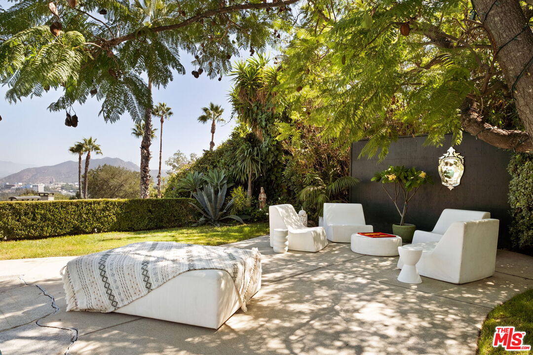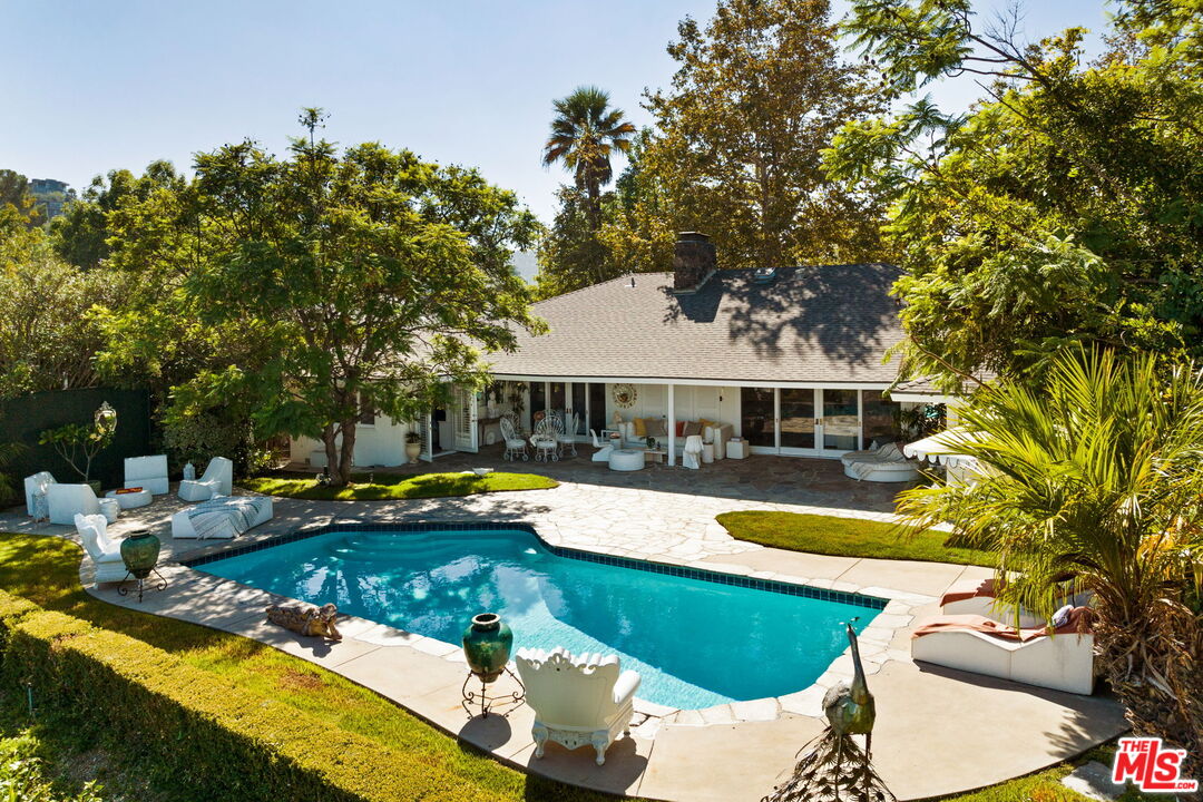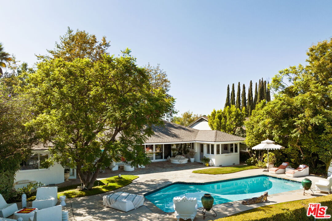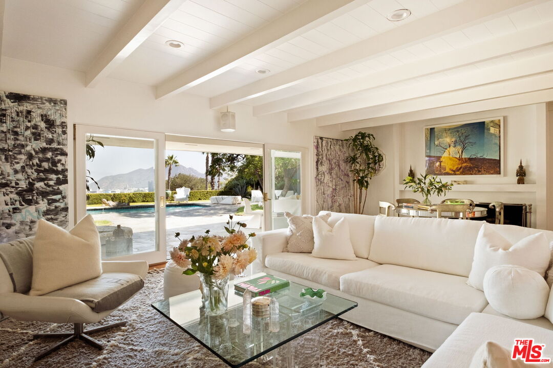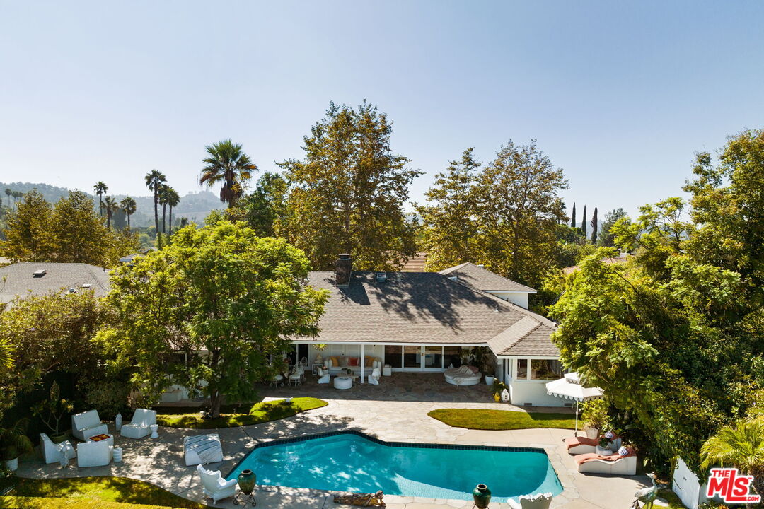 Tucked away on a rare, flat 11,000 SF lot in the Hollywood Hills, this expansive mid-century ranch radiates joy and calm in equal measure. The moment you pass through the privacy hedges and step inside the cheerful orange front door, the home's warm energy is unmistakable. At the heart of the home, a generous great room is anchored by a classic brick fireplace on one side, custom built-ins on the other, and sliding glass doors in the center that frame sweeping views of the hills, mountains, and Universal City. Just beyond, the large flat backyard with sparkling pool becomes a natural extension of the living space, inviting seamless indoor-outdoor living. The sunlit kitchen is equally inspiring, with crisp white cabinetry, Caesarstone counters, and a built-in banquette framed by bay windows that perfectly capture the view. A spacious laundry room and full bath sit conveniently adjacent. On the opposite wing, a large den with French doors opening to the backyard leads to three bedrooms, including two that share a Jack-and-Jill bath and the primary suite. The primary retreat is a sanctuary unto itself, with a custom walk-in closet, ensuite bath with dual sinks, soaking tub, and separate shower, plus French doors that open directly to the pool and garden. Above the converted garage discover a flexible fourth bedroom, once a recording studio, ideal as a creative workspace, private guest suite, or the perfect hideaway for a teenager in need of their own world. The backyard is nothing short of show-stopping: lush landscaping, a stone-flanked pool, and generous flat grassy areas offer endless opportunities to lounge, play, and entertain, all with dazzling views as your backdrop. With its rare combination of a thoughtful floor plan, expansive flat lot, serene views, and a central location, this home offers not just a place to live, but a place to truly exhale.