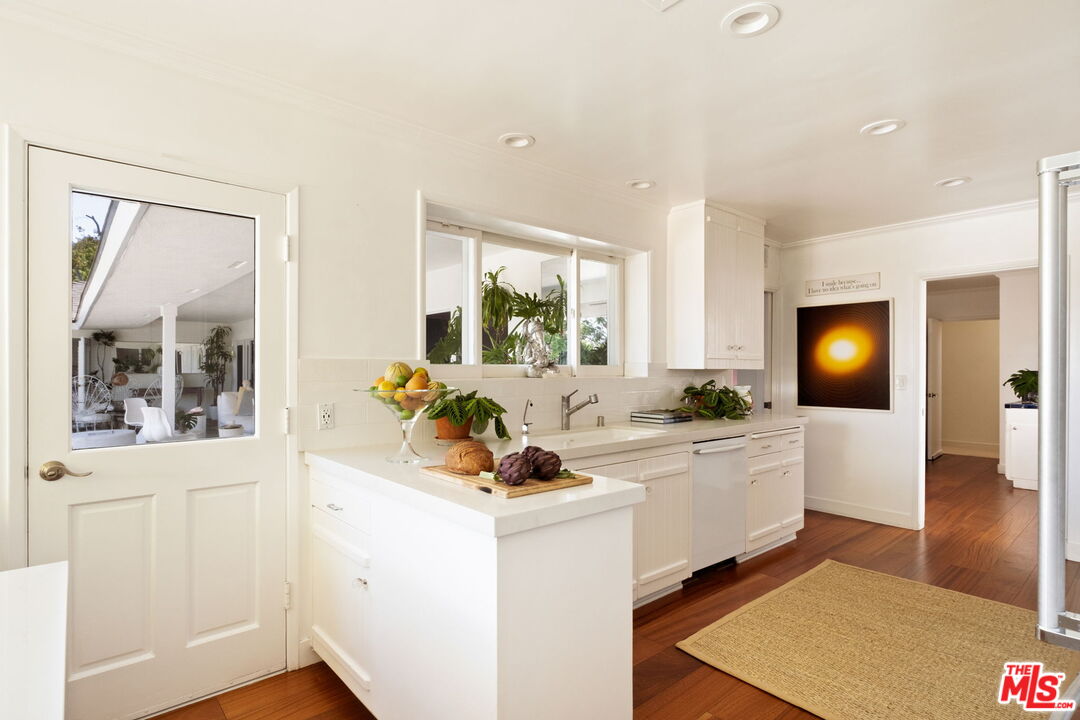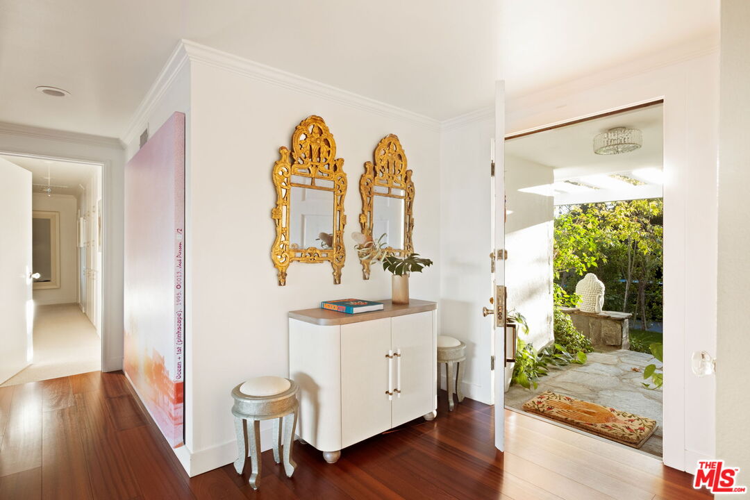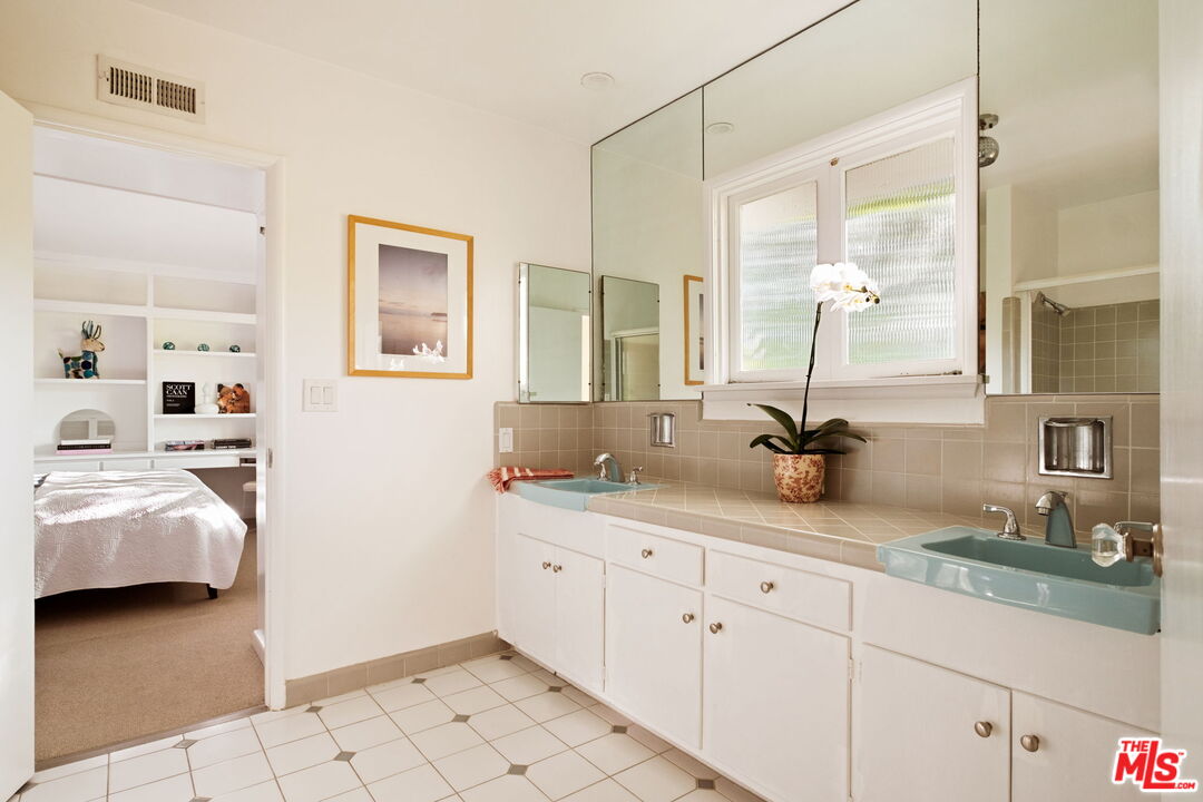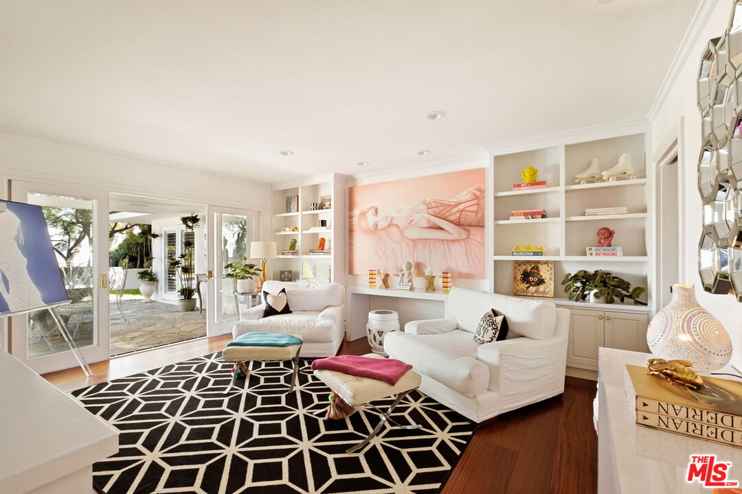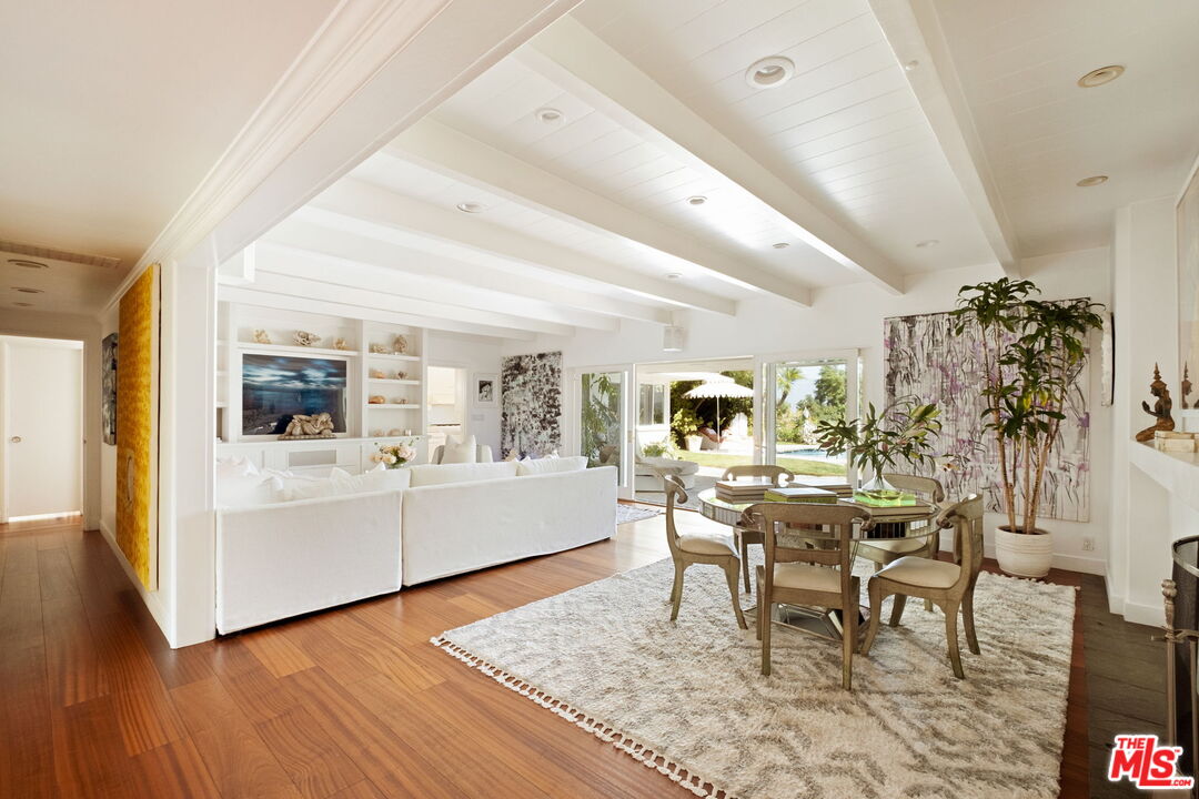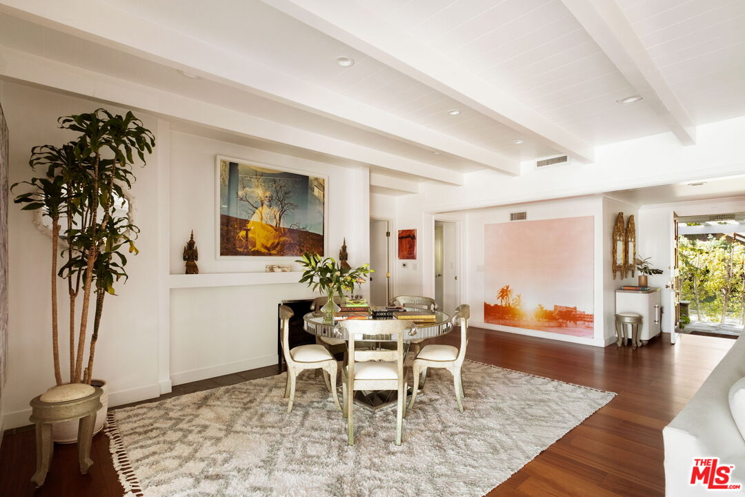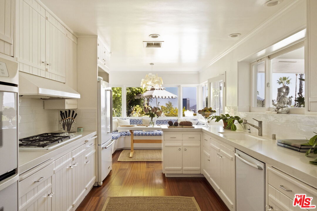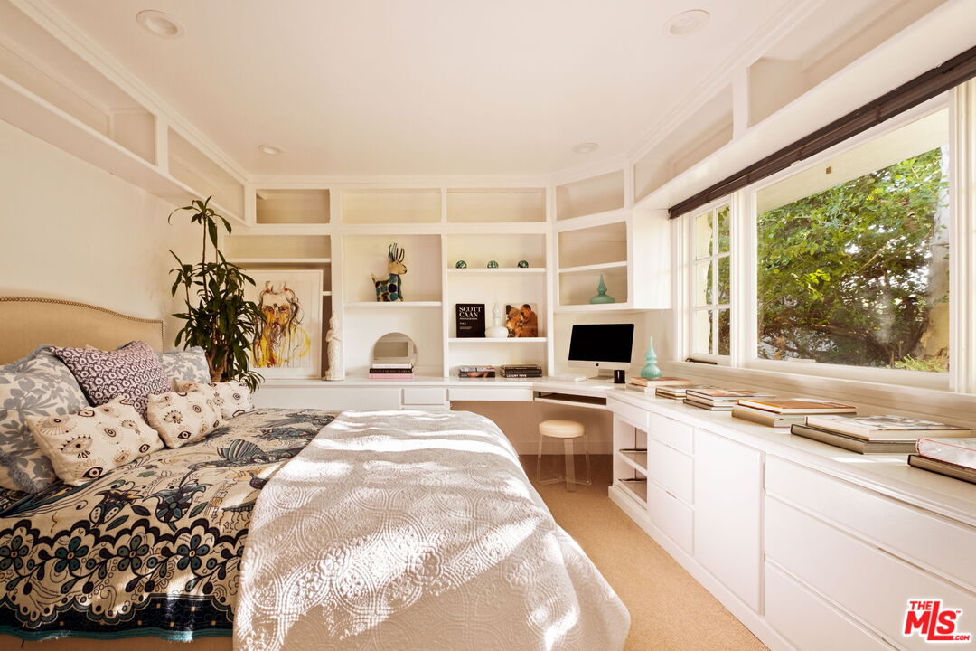 Tucked away on a rare, flat 11,000 SF lot in the Hollywood Hills, this expansive mid-century ranch radiates joy and calm in equal measure. The moment you pass through the privacy hedges and step inside the cheerful orange front door, the home's warm energy is unmistakable. At the heart of the home, a generous great room is anchored by a classic brick fireplace on one side, custom built-ins on the other, and sliding glass doors in the center that frame sweeping views of the hills, mountains, and Universal City. Just beyond, the large flat backyard with sparkling pool becomes a natural extension of the living space, inviting seamless indoor-outdoor living. The sunlit kitchen is equally inspiring, with crisp white cabinetry, Caesarstone counters, and a built-in banquette framed by bay windows that perfectly capture the view. A spacious laundry room and full bath sit conveniently adjacent. On the opposite wing, a large den with French doors opening to the backyard leads to three bedrooms, including two that share a Jack-and-Jill bath and the primary suite. The primary retreat is a sanctuary unto itself, with a custom walk-in closet, ensuite bath with dual sinks, soaking tub, and separate shower, plus French doors that open directly to the pool and garden. Above the converted garage discover a flexible fourth bedroom, once a recording studio, ideal as a creative workspace, private guest suite, or the perfect hideaway for a teenager in need of their own world. The backyard is nothing short of show-stopping: lush landscaping, a stone-flanked pool, and generous flat grassy areas offer endless opportunities to lounge, play, and entertain, all with dazzling views as your backdrop. With its rare combination of a thoughtful floor plan, expansive flat lot, serene views, and a central location, this home offers not just a place to live, but a place to truly exhale.
