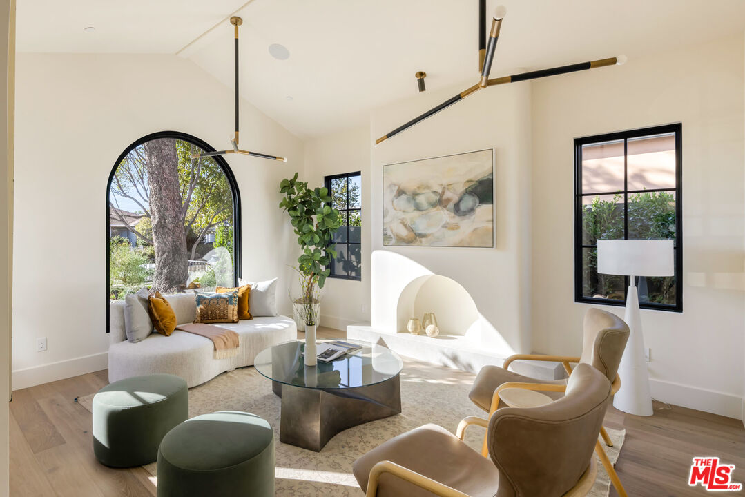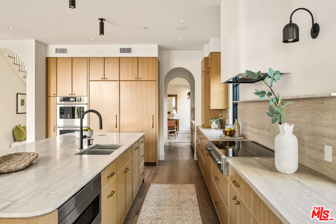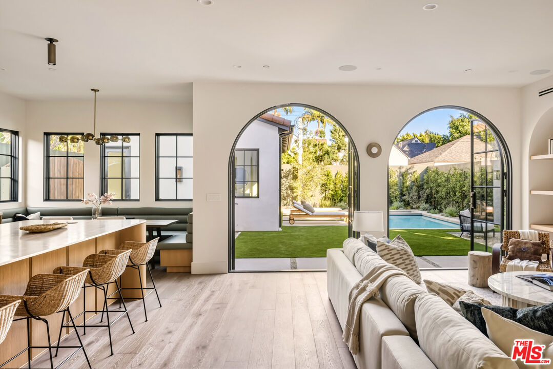 Experience bespoke luxury in this custom-built, modern Mediterranean estate, where exquisite craftsmanship meets timeless design. Sited on a 7,000+ SF lot near premier dining, shopping, and cultural destinations, this new construction residence offers a rare blend of elegance and functionality. A handcrafted wood entry door welcomes you into a grand double-height foyer, featuring checkerboard tile flooring, custom built-ins, and a stunning skylit staircase. Arched doorways lead to a formal living room with vaulted ceilings, while the adjacent dining room connects to a butler's pantry for seamless entertaining. The gourmet kitchen is a chef's dream, boasting a large island with Travertine counters, top-tier appliances, white oak cabinetry, and a built-in breakfast banquette. The open-concept den features arched steel doors that open to the entertainer's patio, complete with outdoor dining, a pool, spa, and a fully permitted ADU, perfect as a guest suite or private retreat. Conveniently located on the first level, a private bedroom with an ensuite bathroom offers flexibility for guests or multigenerational living. Upstairs, the primary suite impresses with vaulted ceilings, a spa-like bath (fluted cabinetry, slab walls, soaking tub), and dual closets. Two additional ensuite bedrooms, a laundry room, and a spacious office complete the upper level. Notable features: Gated entry, secured parking for 3 cars, designer lighting, artisanal tilework, rich wood accents, and a stately mature pine tree. This home is a true celebration of refined living.