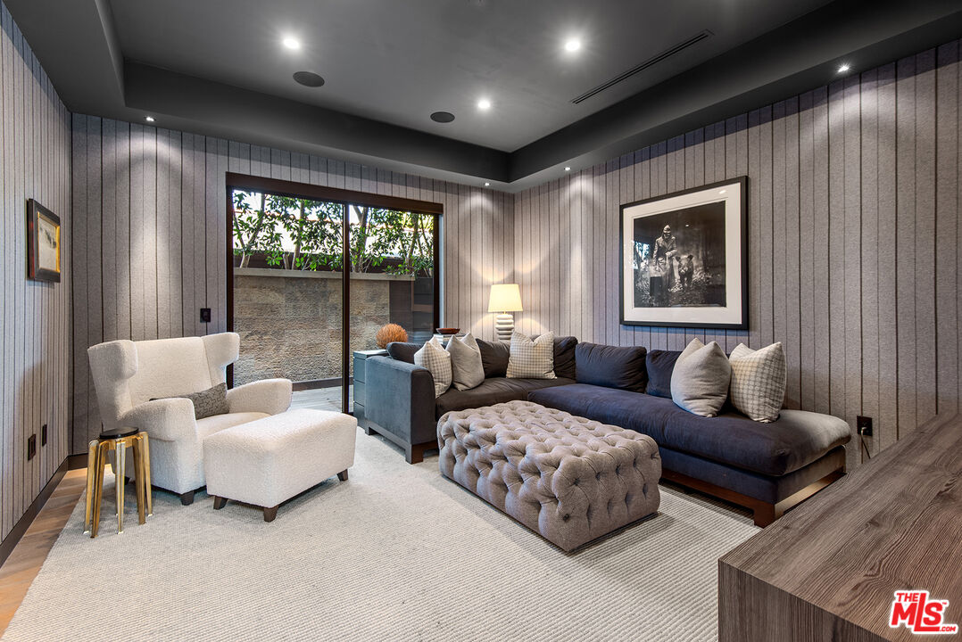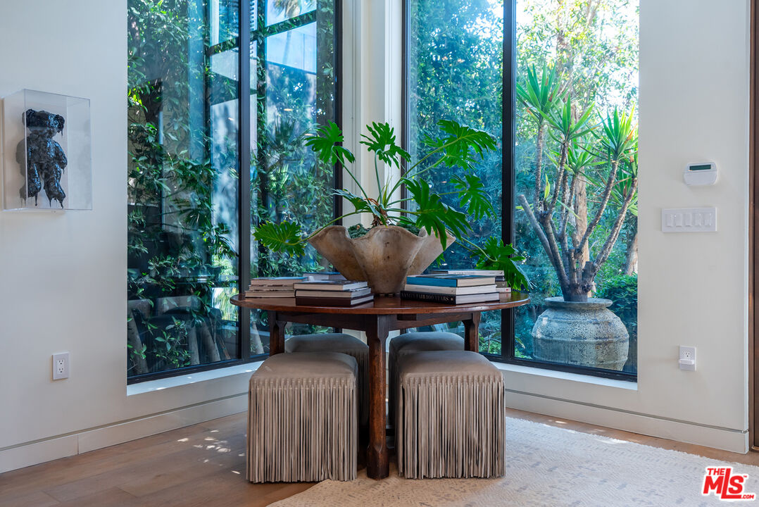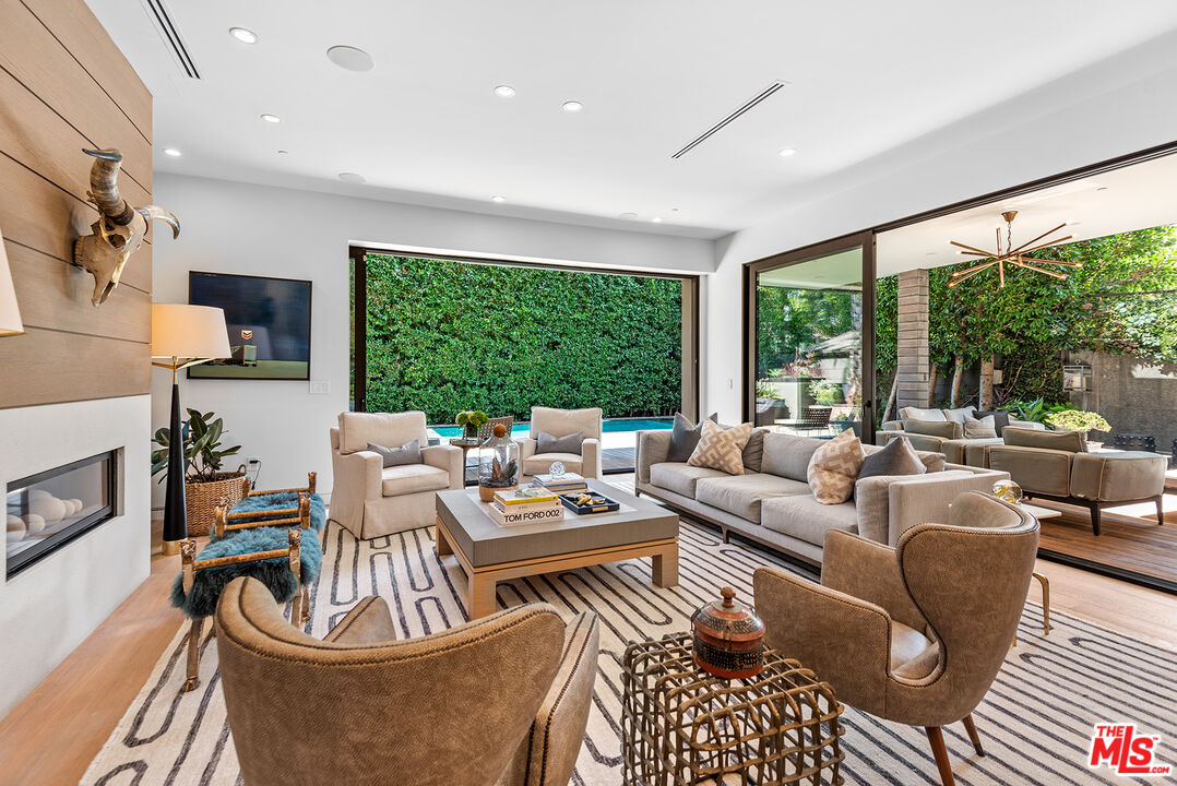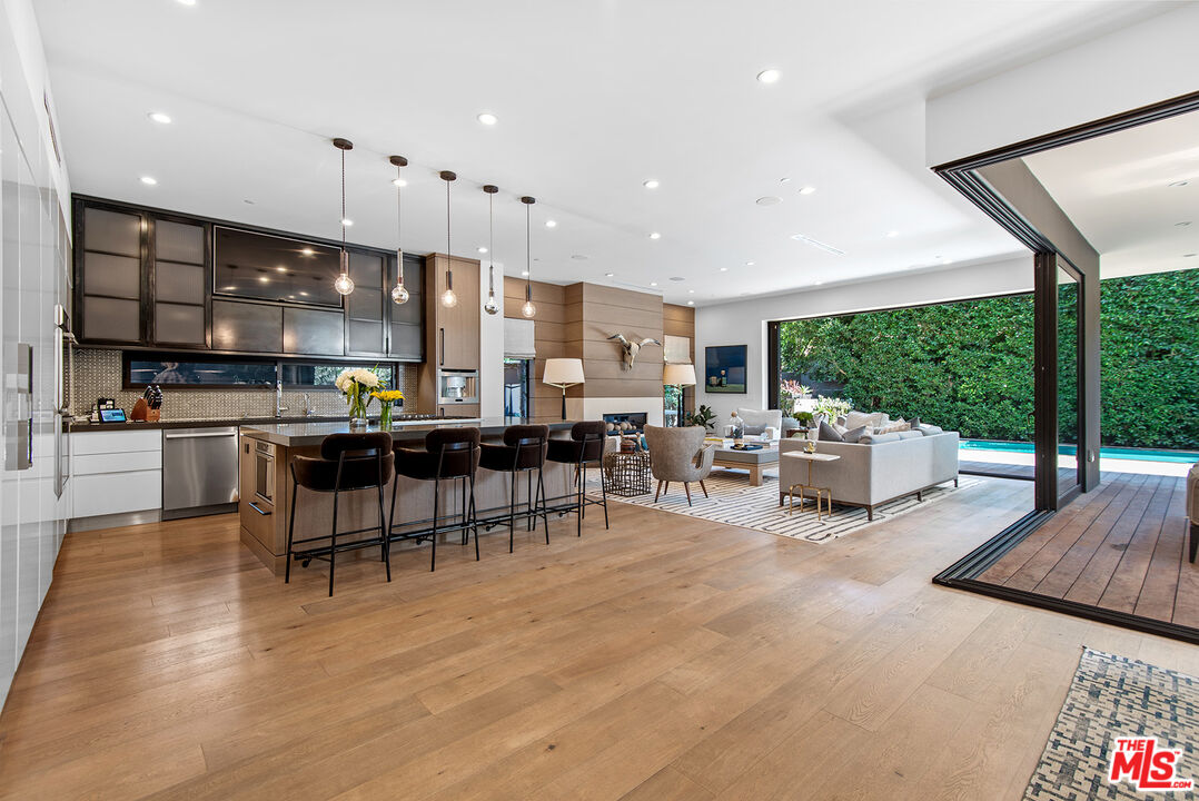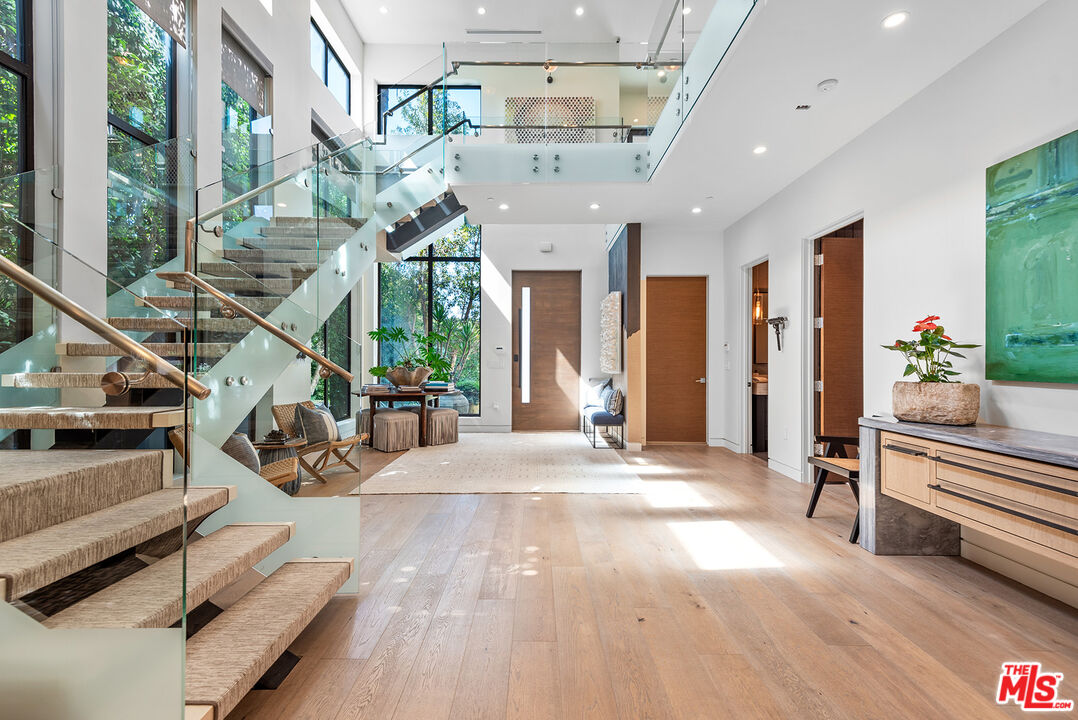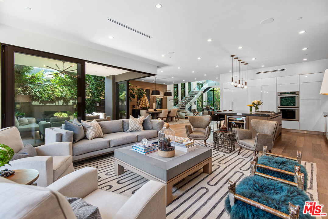 Set behind gates in prime West Hollywood, this designer done organic modern home blends refined design with effortless livability across approximately 4,000 square feet. The four bedroom plus den, five and one-half bath layout is anchored by soaring ceilings and walls of glass that flood the home with natural light and create a seamless indoor outdoor flow. The chef's kitchen is both striking and functional, featuring custom blackened steel cabinetry with integrated LED lighting, top tier appliances, and a clean, thoughtful layout. A mid transom window above the sink brings in soft air and light, reflecting beautifully off the glass Ann Sacks tile. A richly layered den offers a more intimate retreat, with embroidered wool wall coverings and a warm, moody palette that invites you to linger. Throughout the home, bespoke finishes including natural white oak cabinetry, Belgian oak plank flooring, and custom stone fireplaces add texture and quiet sophistication. The primary suite is a true sanctuary, complete with a sitting area, generous walk in closet, wraparound balcony, and a spa inspired bath with steam shower and Japanese bidet water closet. Upstairs, three additional bedrooms are well appointed with custom finishes and ample storage, along with a conveniently located laundry room.Outdoor living is equally considered, with a covered lounge area overlooking a zero edge infinity pool and spa, all surrounded by mature hedging for privacy. The detailed grounds, designed by Jerry Hirtz, enhance both the setting and the sense of seclusion. Sustainability meets comfort with a forty four panel, sixteen kilowatt solar system, while thoughtful upgrades throughout reflect a meticulous, design forward owner. Additional features include a basalt cobblestone driveway, custom clear cedar garage doors, EV charging station and Roman Clay walls ideal for art display. A rare offering in one of West Hollywood's most sought after pockets, this home delivers a polished, private lifestyle with a modern edge.