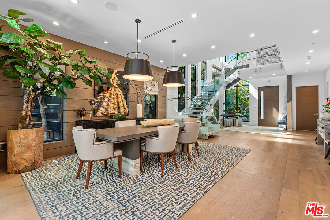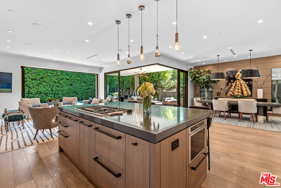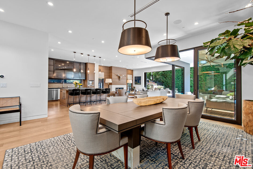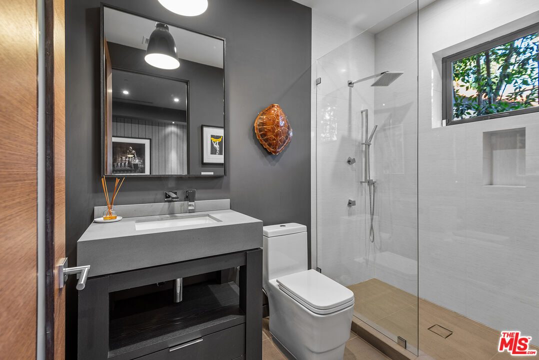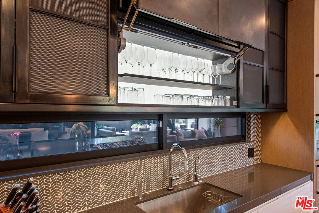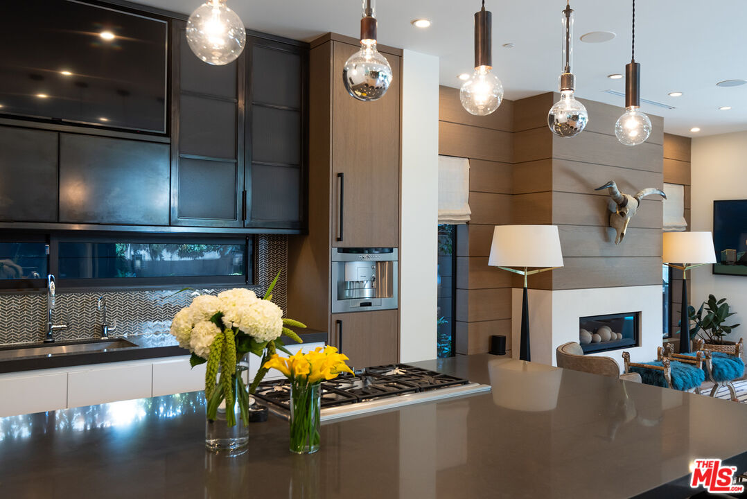 Set behind gates in prime West Hollywood, this designer done organic modern home blends refined design with effortless livability across approximately 4,000 square feet. The four bedroom plus den, five and one-half bath layout is anchored by soaring ceilings and walls of glass that flood the home with natural light and create a seamless indoor outdoor flow. The chef's kitchen is both striking and functional, featuring custom blackened steel cabinetry with integrated LED lighting, top tier appliances, and a clean, thoughtful layout. A mid transom window above the sink brings in soft air and light, reflecting beautifully off the glass Ann Sacks tile. A richly layered den offers a more intimate retreat, with embroidered wool wall coverings and a warm, moody palette that invites you to linger. Throughout the home, bespoke finishes including natural white oak cabinetry, Belgian oak plank flooring, and custom stone fireplaces add texture and quiet sophistication. The primary suite is a true sanctuary, complete with a sitting area, generous walk in closet, wraparound balcony, and a spa inspired bath with steam shower and Japanese bidet water closet. Upstairs, three additional bedrooms are well appointed with custom finishes and ample storage, along with a conveniently located laundry room.Outdoor living is equally considered, with a covered lounge area overlooking a zero edge infinity pool and spa, all surrounded by mature hedging for privacy. The detailed grounds, designed by Jerry Hirtz, enhance both the setting and the sense of seclusion. Sustainability meets comfort with a forty four panel, sixteen kilowatt solar system, while thoughtful upgrades throughout reflect a meticulous, design forward owner. Additional features include a basalt cobblestone driveway, custom clear cedar garage doors, EV charging station and Roman Clay walls ideal for art display. A rare offering in one of West Hollywood's most sought after pockets, this home delivers a polished, private lifestyle with a modern edge.