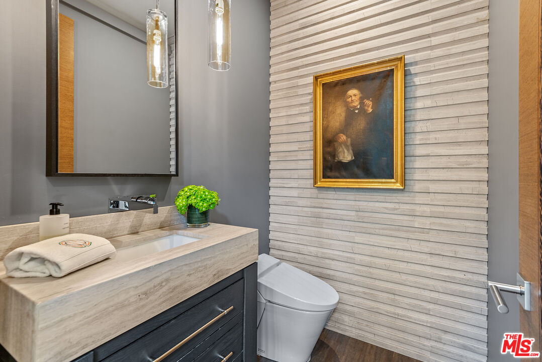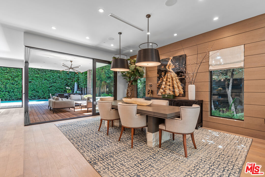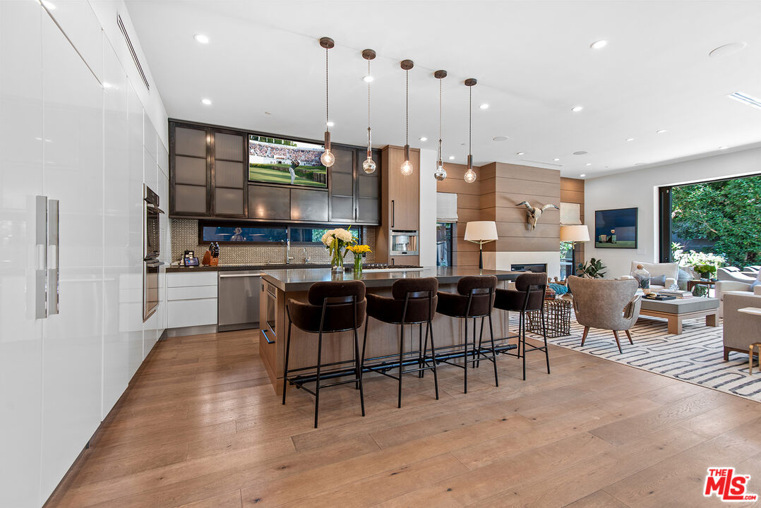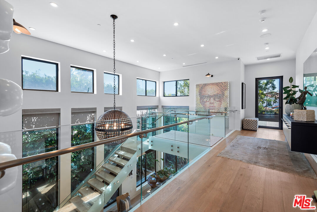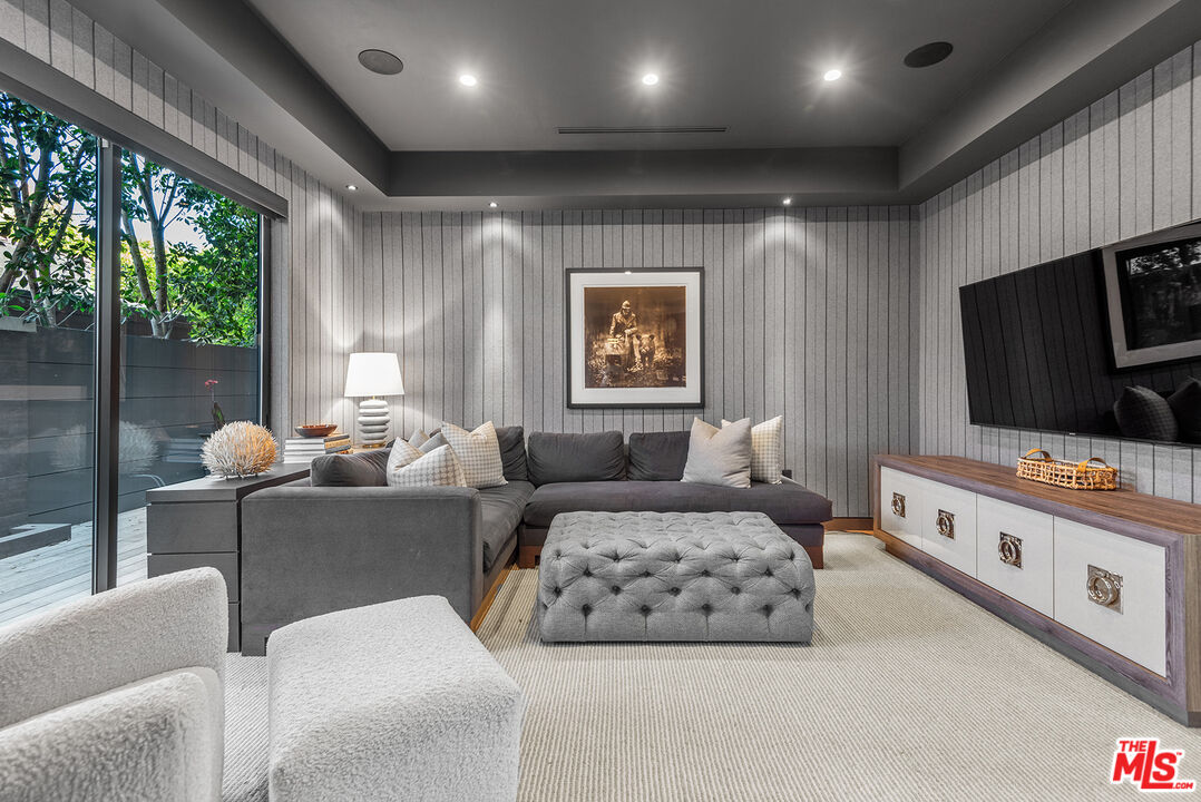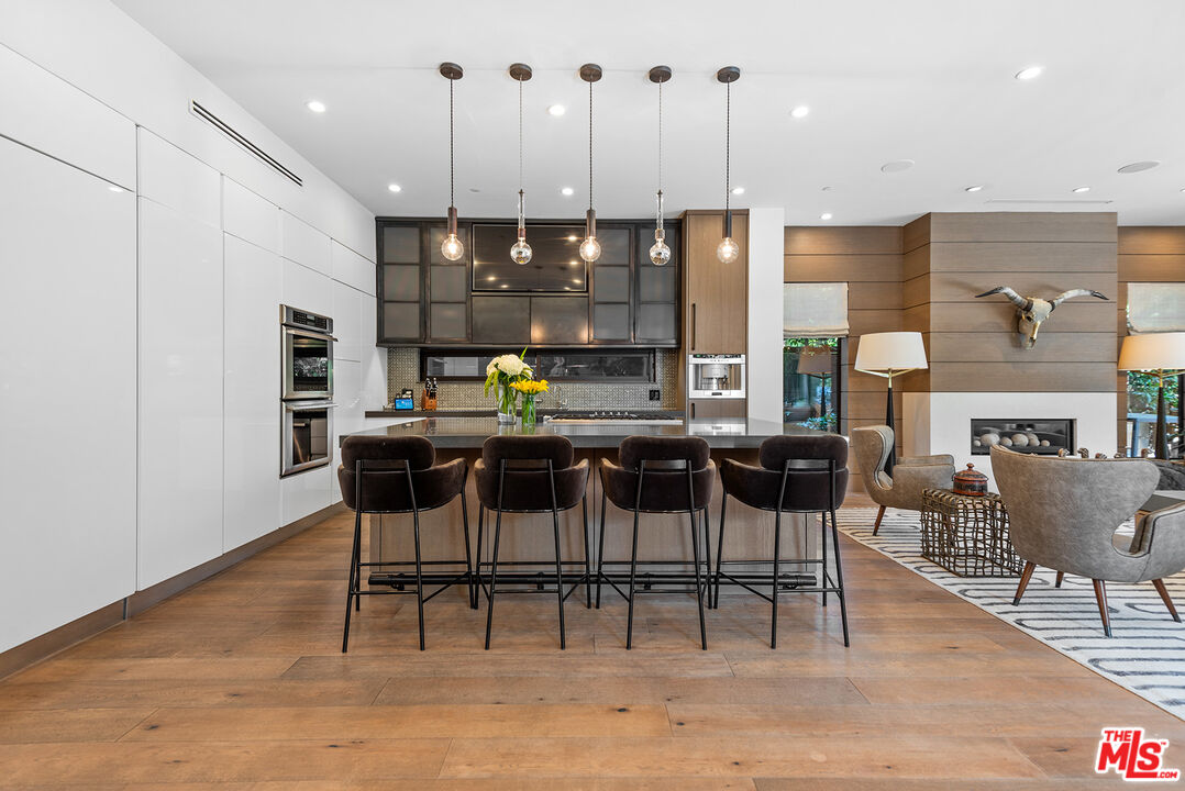 Set behind gates in prime West Hollywood, this designer done organic modern home blends refined design with effortless livability across approximately 4,000 square feet. The four bedroom plus den, five and one-half bath layout is anchored by soaring ceilings and walls of glass that flood the home with natural light and create a seamless indoor outdoor flow. The chef's kitchen is both striking and functional, featuring custom blackened steel cabinetry with integrated LED lighting, top tier appliances, and a clean, thoughtful layout. A mid transom window above the sink brings in soft air and light, reflecting beautifully off the glass Ann Sacks tile. A richly layered den offers a more intimate retreat, with embroidered wool wall coverings and a warm, moody palette that invites you to linger. Throughout the home, bespoke finishes including natural white oak cabinetry, Belgian oak plank flooring, and custom stone fireplaces add texture and quiet sophistication. The primary suite is a true sanctuary, complete with a sitting area, generous walk in closet, wraparound balcony, and a spa inspired bath with steam shower and Japanese bidet water closet. Upstairs, three additional bedrooms are well appointed with custom finishes and ample storage, along with a conveniently located laundry room.Outdoor living is equally considered, with a covered lounge area overlooking a zero edge infinity pool and spa, all surrounded by mature hedging for privacy. The detailed grounds, designed by Jerry Hirtz, enhance both the setting and the sense of seclusion. Sustainability meets comfort with a forty four panel, sixteen kilowatt solar system, while thoughtful upgrades throughout reflect a meticulous, design forward owner. Additional features include a basalt cobblestone driveway, custom clear cedar garage doors, EV charging station and Roman Clay walls ideal for art display. A rare offering in one of West Hollywood's most sought after pockets, this home delivers a polished, private lifestyle with a modern edge.