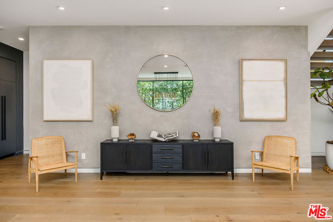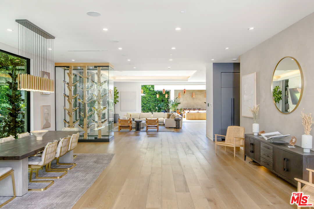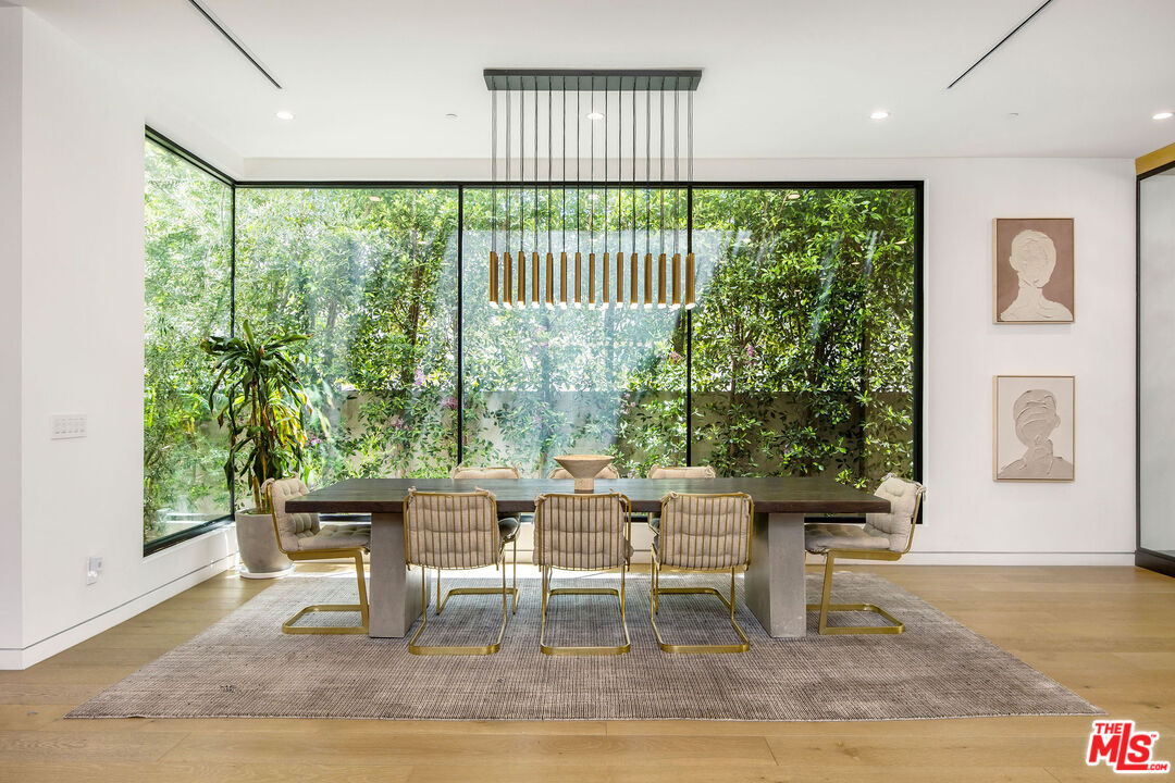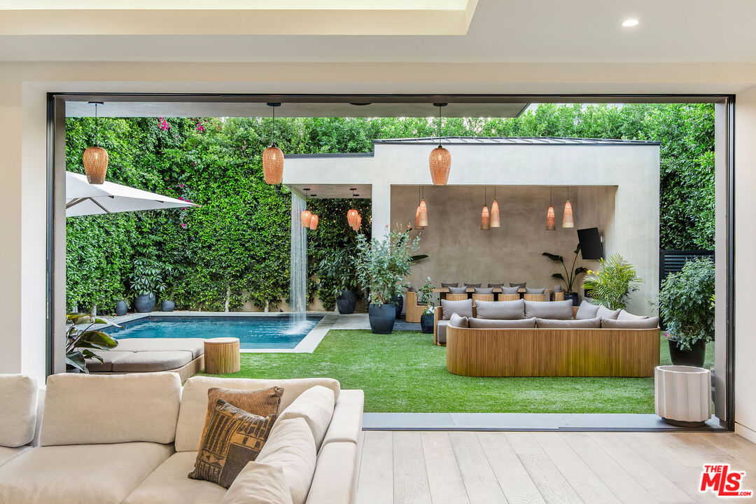 The Alfred residence is a masterpiece of organic contemporary design that balances indoor and outdoor living, located on one of the most coveted streets in West Hollywood. This home's expansive open-concept floor plan spans over 6,110 square feet on an oversized lot with 5 bedrooms, 5.5 bathrooms, an entertainer's backyard, a private movie theater, and 2-car garage. With 12-foot ceilings and floor-to-ceiling windows, natural light pours into every room. Open the living room's custom sliding glass pocket doors to blur the transition between indoor and outdoor when entertaining friends and family. The backyard evokes the beauty of Tulum, with tall and lush hedges providing serene privacy. The covered lime-wash outdoor lounge area includes an integrated sound system, designer pendant lighting, fireplace, and flat-screen TV, creating the ideal space for alfresco dining and entertainment. Spend your evenings preparing dinner in the kitchen while you watch the sunset pour in over stunning views of the backyard, pool, & waterfall. The custom-designed kitchen comes equipped with a massive oversized marble island, two dishwashers, two ovens, a walk-in pantry, and a full suite of Miele appliances including an in-wall fully automatic espresso machine. Moving upstairs, the Alfred's palatial double-sized primary suite is a true sanctuary, featuring a private balcony with floor-to-ceiling sliding glass doors overlooking the backyard, a luxurious walk-in closet, and cozy fireplace. The spa-inspired bathroom is outfitted with oversized marble slabs, a freestanding soaking tub, a frameless glass shower, a vanity, his and hers sinks, and a Toto toilet. The junior suite is comprised of a bedroom and en-suite, each with its own dedicated full bathroom, and a balcony overlooking tree-lined Alfred Street. This unique configuration offers ultimate practicality, with the en-suite being used as an office, den, creative space, playroom, or bedroom. Back downstairs, the Alfred's dedicated home theater is equipped with a cinematic projector and surround sound - subwoofer included - providing the ultimate at home entertainment experience. Additional amenities include, Control4 smart home system controlling lights, speakers, climate, and security, Motorized blackout roller blinds in all bedrooms, controllable via mobile app, Pool and spa heaters controllable via mobile app, Commercial grade wifi mesh network, Front door ring camera and 9-camera security surveillance system with remote live feed access and 24/7 recording to a local secure hard drive. Downstairs: living room, dining room, kitchen, movie theater, office, guest bathroom. Upstairs: primary suite, junior suite and en-suite, guest suite & laundry room. With this home's amazing location, you can easily walk to anything you need. Sushi Fumi, Urth Cafe, Great White Melrose, Alfred Coffee, Melrose Place, the Beverly Center, the list goes on and on. Get out and enjoy the beautiful California weather every day, year round.