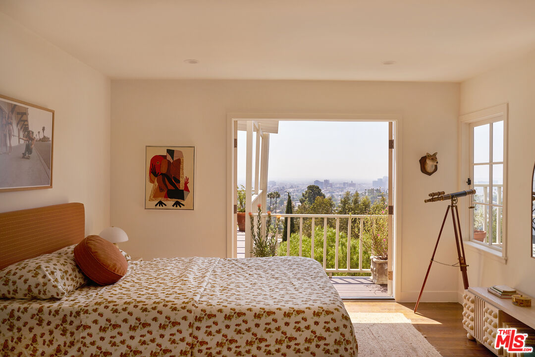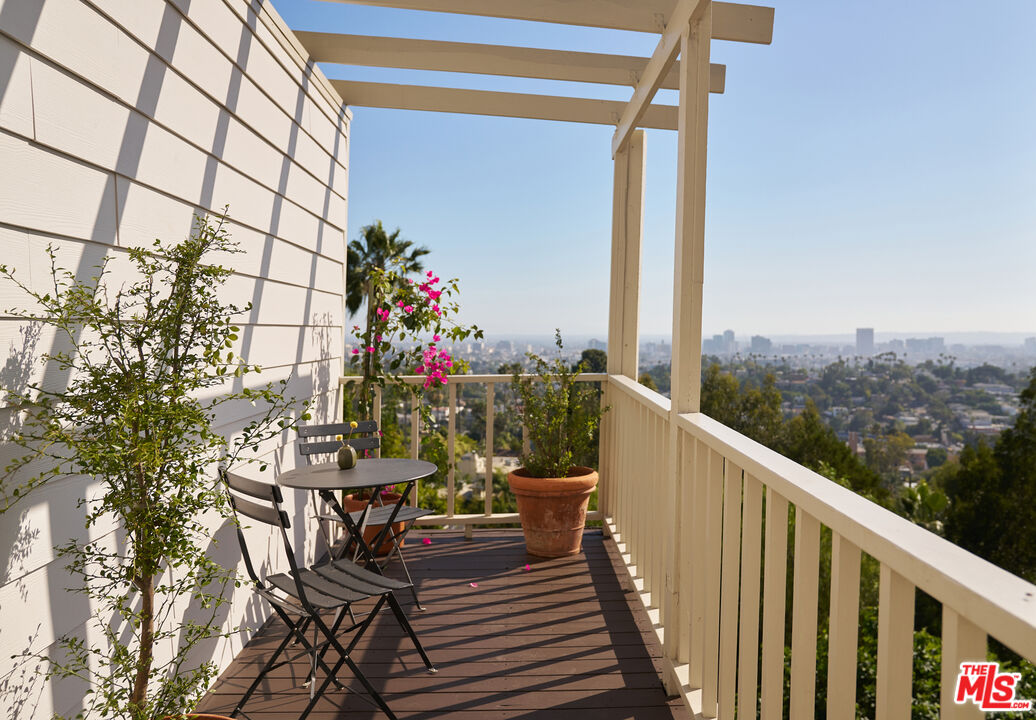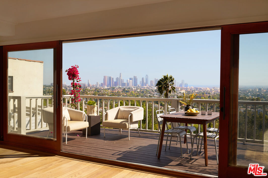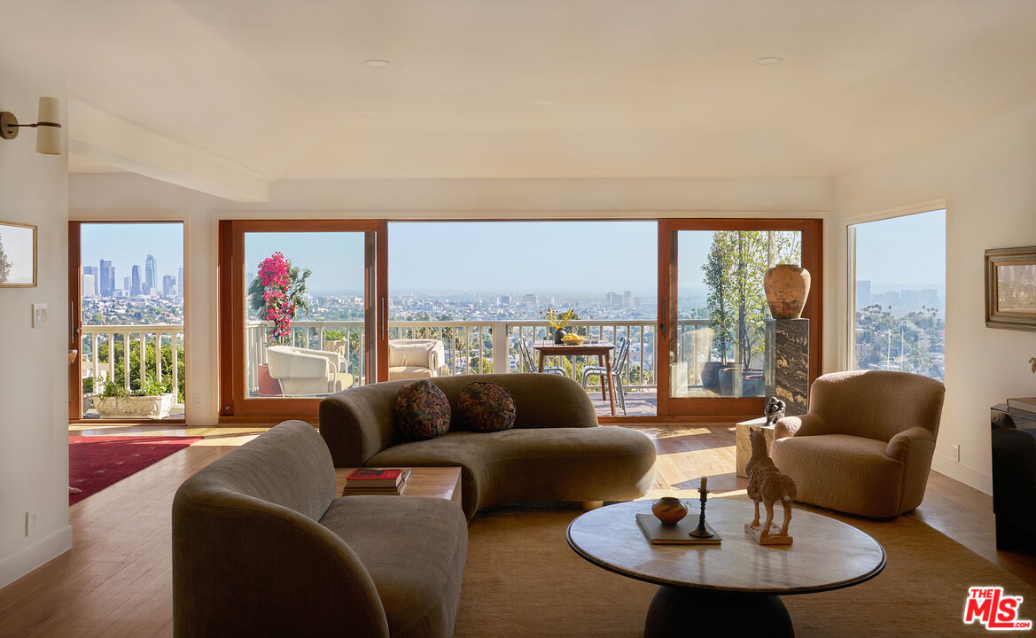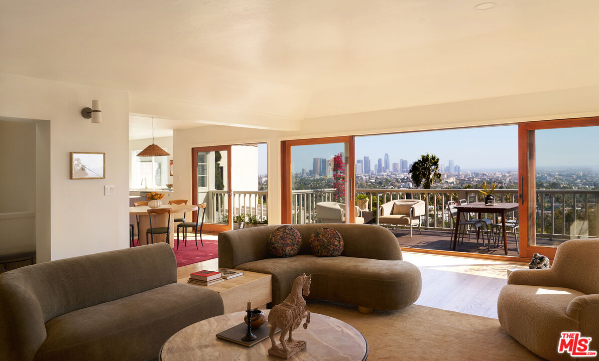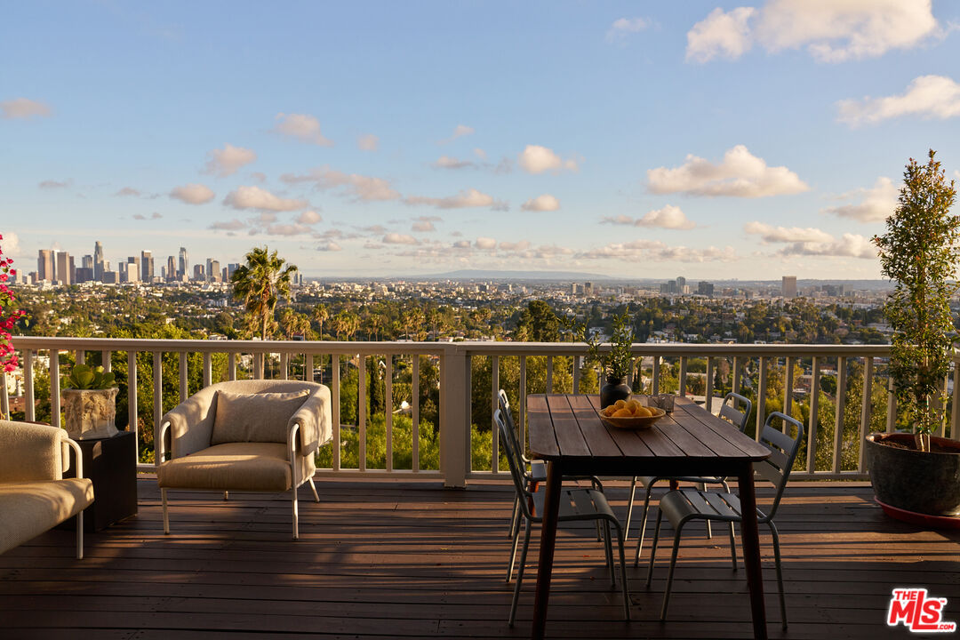Set behind gates on a rare street-to-street lot spanning over 10,000 square feet, this extensively renovated private Silver Lake residence offers sweeping views from Downtown to the Pacific Ocean, visible from every room, along with a true indoor-outdoor California living experience just moments from all the neighborhood has to offer. Landscaped by acclaimed LA design firm Breland-Harper, the grounds unfold as a hidden oasis with winding paths, multiple terraces, mature fruit trees, and distinct outdoor spaces designed for both entertaining and everyday retreat. Blending character and comfort a dramatic living room welcomes you with coved ceilings, opening to a spacious view deck and flows seamlessly into the dining area and newly remodeled kitchen, appointed with custom cabinetry, premium appliances, dolomite countertops and backsplash. The primary suite is a private sanctuary with windows that frame the panoramic views, a renovated spa-like bathroom with freestanding tub, double vanity, a custom walk-in closet, and its own private deck. A generous secondary bedroom and adjacent bath complete the middle level. The lower level offers versatility as a guest suite, office, creative studio, or media lounge, with its own kitchen, sitting area, bedroom, and direct access to an additional outdoor dining and lounging terrace. Throughout the home, spaces open effortlessly to the outdoors. At the heart of the grounds, a rare flat entertaining area centered around an outdoor fireplace creates an ideal setting for sunset dinners, gatherings under the stars, or quiet evenings at home. Ten fruit-producing trees, including plum, citrus, pomegranate, and apple, add charm and abundance, while multiple decks and terraces invite year-round enjoyment. A pedestrian gate to Golden Gate Avenue provides direct access to Sunset Boulevard's shops, restaurants, and neighborhood favorites. A singular offering that combines privacy, scale, views, and lifestyle in one of Los Angeles' most sought-after neighborhoods.