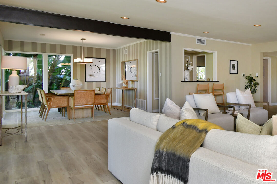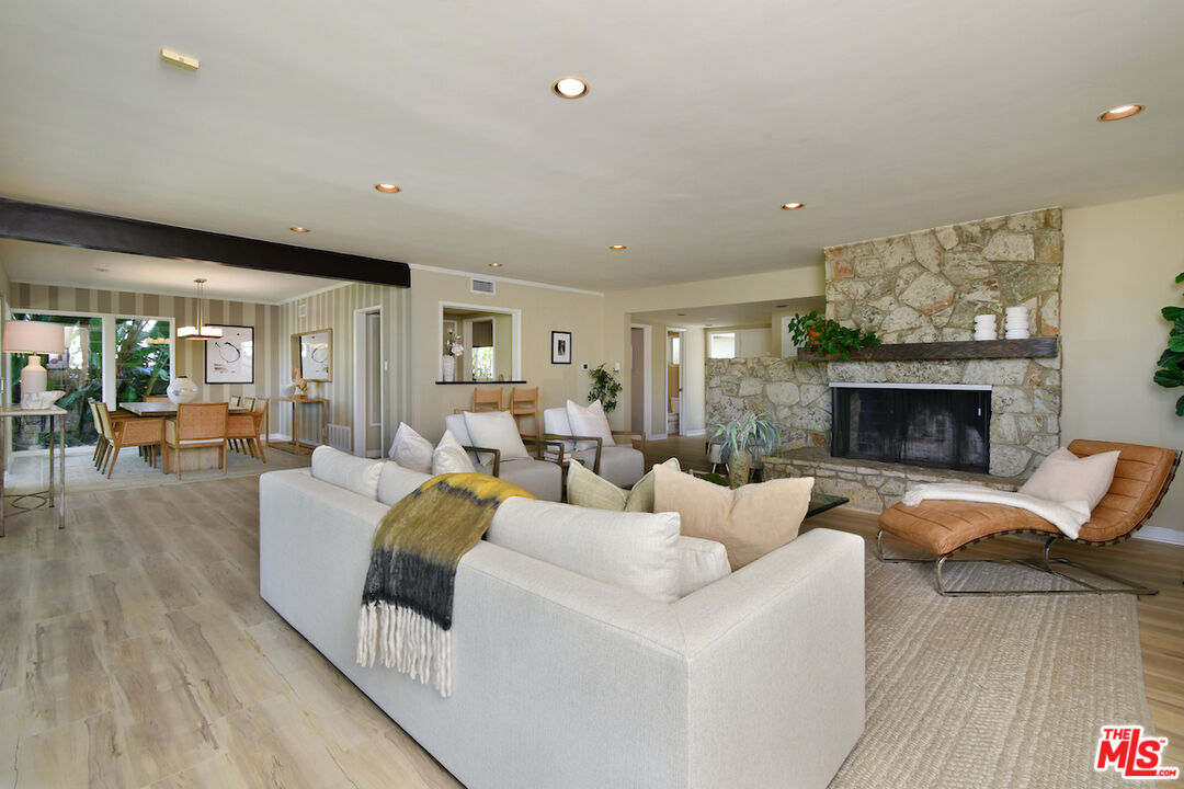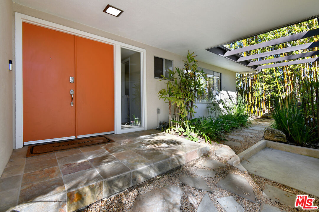 Gated and set back from the street, this single-story mid-century home offers a well-designed floor plan with open living spaces and walls of glass that frame the surrounding views. A welcoming garden entry leads to an expansive living room with a natural stone fireplace, built-in bookcases, and direct access to the formal dining room and bar, creating a comfortable flow for everyday living and entertaining. The updated center-island kitchen includes a breakfast area, Viking oven and range, generous storage, and a pantry. The spacious primary suite features a dressing area and an en-suite bath. Private backyard with a lounging pool/spa, covered patio, and deck, surrounded by mature landscaping and trees. Additional highlights include an indoor laundry room, a two-car detached garage with potential for an ADU, and an oversized driveway for off-street parking. Great neighborhood near the top of Sherman Oaks and close to Mulholland Drive, the home has easy access to Beverly Hills, Ventura Blvd. and the Westside.