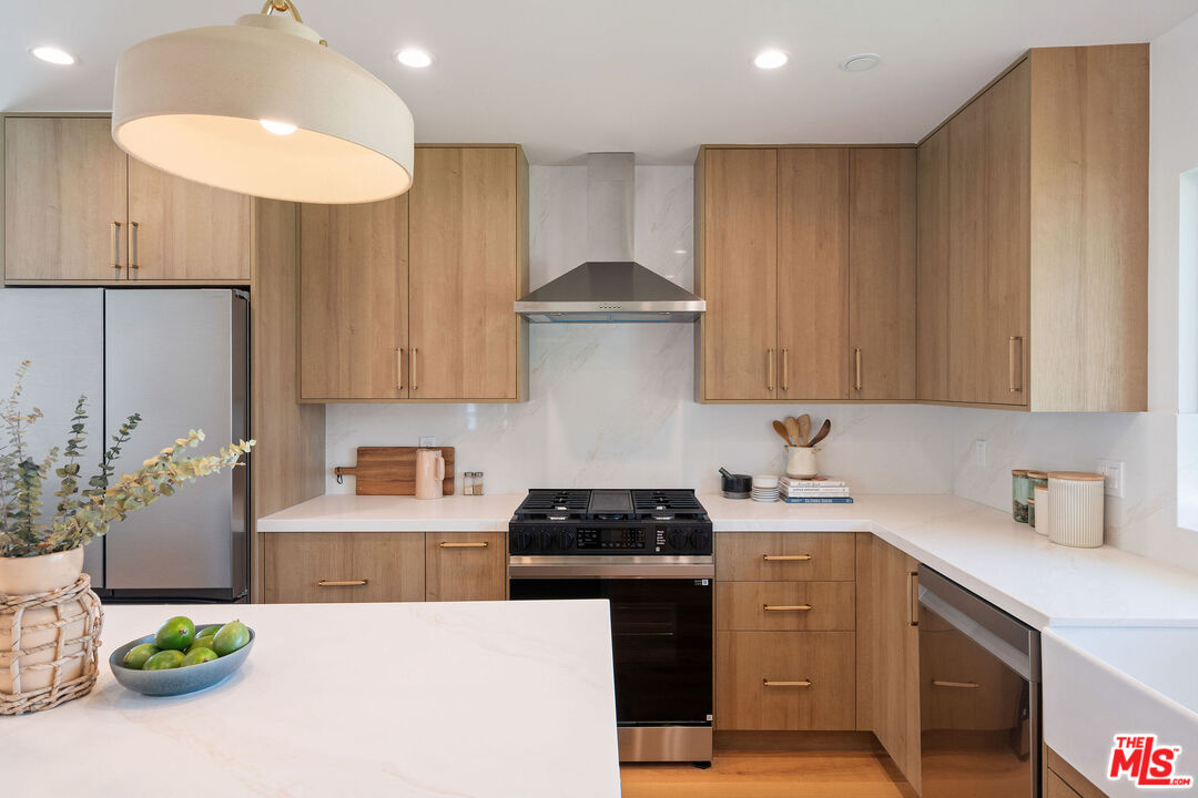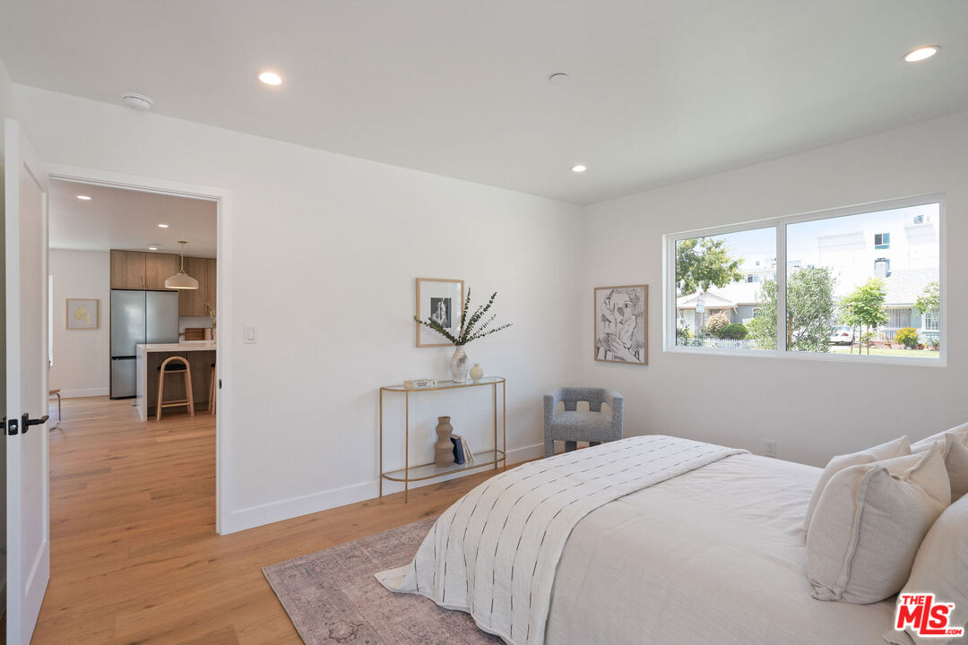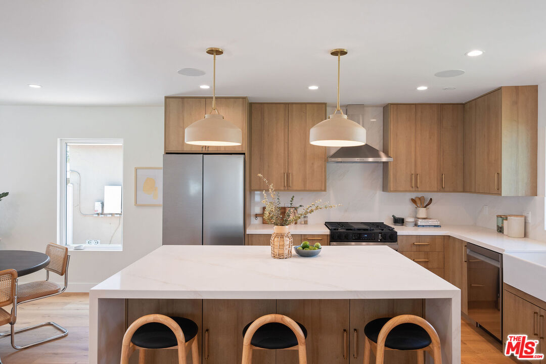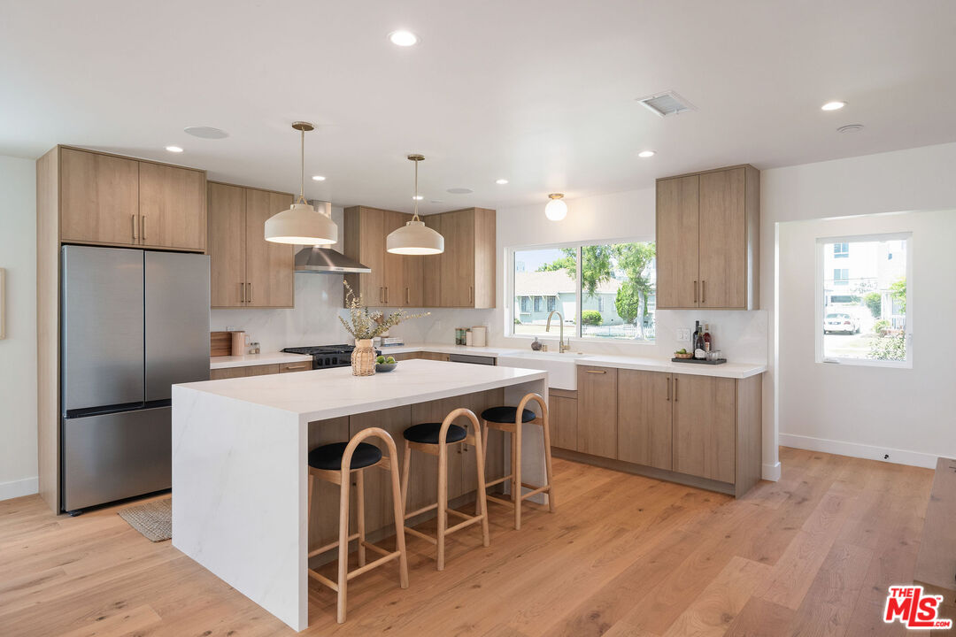 Chic and fully renovated 3 bed 2 bath home in Mid City. Located on a quiet street in one of LA's hottest neighborhoods, this 1,680 square foot home blends modern design with comfort and style. Step through the new redwood front deck and past the new stucco front wall, a perfect spot for sunny morning coffee or laid-back afternoons. Inside, the open floor plan connects the spacious dining and living rooms to the all-new kitchen.The kitchen is a standout, featuring a large island with waterfall quartz countertops, stool seating, a Sharp drawer microwave, ample cabinet storage, and new Samsung stainless steel appliances including a range, refrigerator, and dishwasher. The adjacent dining area creates a comfortable zone for entertaining or daily meals. Sliding doors open to a private, fully fenced backyard with multiple outdoor dining and lounge areas.Every bedroom is generously sized and includes a walk-in closet, offering both comfort and function. The expanded primary suite is a true retreat with a spacious en suite bathroom featuring custom dual vanities, a walk-in shower, and a freestanding tub surrounded by spa style tile. A generous walk-in closet adds both function and luxury. A glass door leads from the suite to the backyard, stepping onto a redwood landing that opens to a beautifully landscaped outdoor space with a mature persimmon tree.The guest bathroom features stylish tile work and includes a tub with shower, blending beauty with practicality.The laundry room offers cabinets above and enough space for a side-by-side washer and dryer. In the hallway, custom linen cabinets provide additional storage.This home was thoughtfully updated with quality and comfort in mind. Features include a new roof, HVAC system, plumbing, electrical, tank less water heater, hardwood floors throughout, recessed lighting, new stucco, fresh paint, and professional landscaping. The finished 400 square foot garage with sliding doors provides flexible space that can be used as an office, gym, or bonus room.The 6,000 square foot lot offers excellent indoor-outdoor flow and plenty of space for relaxing or entertaining. Built-in speakers in the primary suite, kitchen, living room, and backyard enhance the home's entertainment capabilities, perfect for hosting gatherings or enjoying music throughout the house. This home is ideally situated just minutes from Whole Foods, Target, and the thriving West Adams food and coffee scene, with popular spots like Highly Likely, Damn, I Miss Paris, and more close by. Outdoor lovers will appreciate quick access to Kenneth Hahn State Recreation Area, nearby hiking trails, and Culver City's Platform. The Metro Expo Line makes getting to Downtown LA, Santa Monica, and other parts of the city a breeze. You'll also find local favorites like Johnny's Pastrami, Vicky's All Day, Cento, Alta, Fleur et Sel, and Chulita just a short drive away. This is a rare opportunity to own a stylish, move-in ready home in one of Los Angeles's fastest growing and most desirable neighborhoods. The home has passed final inspection, and the Certificate of Occupancy is in place. Welcome home.