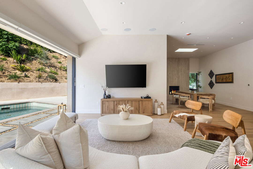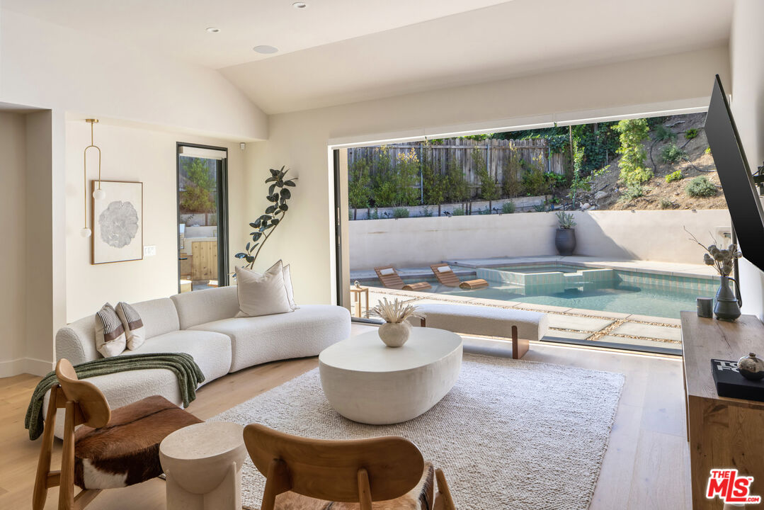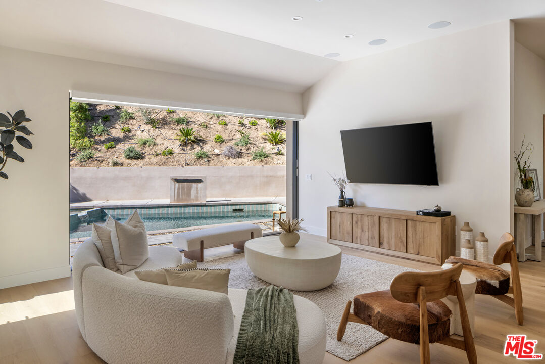 Nestled in the coveted hills of Sherman Oaks, this fully renovated contemporary home offers 4 bedrooms and 3.5 baths with the perfect blend of luxury, style, and functionality. Step through custom double entry doors into an elegant living space highlighted by a stunning travertine porcelain slab fireplace and soaring 11-foot ceilings - wide-plank engineered wood floors flow throughout, while each bathroom showcases a refined Roman clay finish. Expansive Fleetwood sliding doors open to a private resort-like backyard with pool, spa, a Pentair system and a full outdoor kitchen including a built-in barbecue, sink, and refrigerator surrounded by mature ficus throughout, ideal for effortless entertaining. This smart home is fully integrated with advanced RTI and ADT systems, featuring upgraded switches, Episode speakers, security cameras, and a premium whole-house audio setup. Thoughtfully designed and move-in ready, this home caters to the most discerning buyers seeking a turnkey, fully furnished sanctuary in one of the Valley's most desirable neighborhoods.