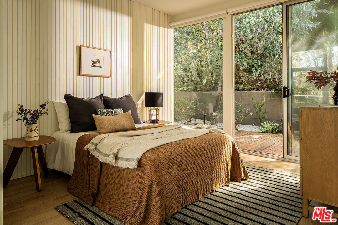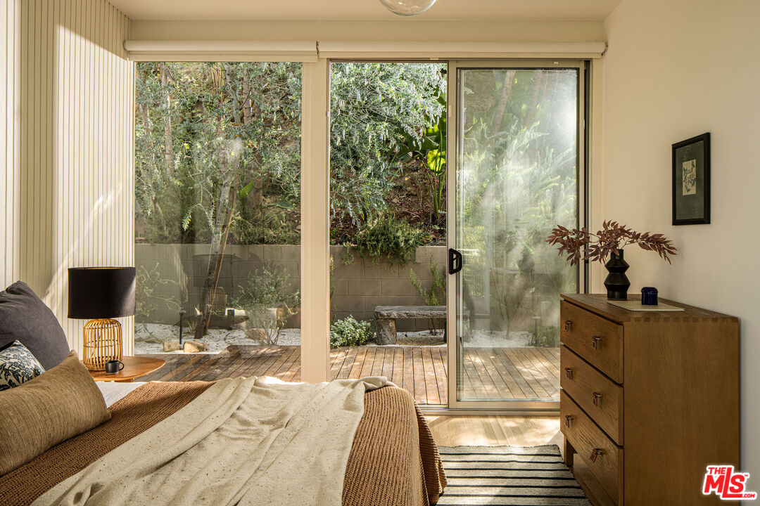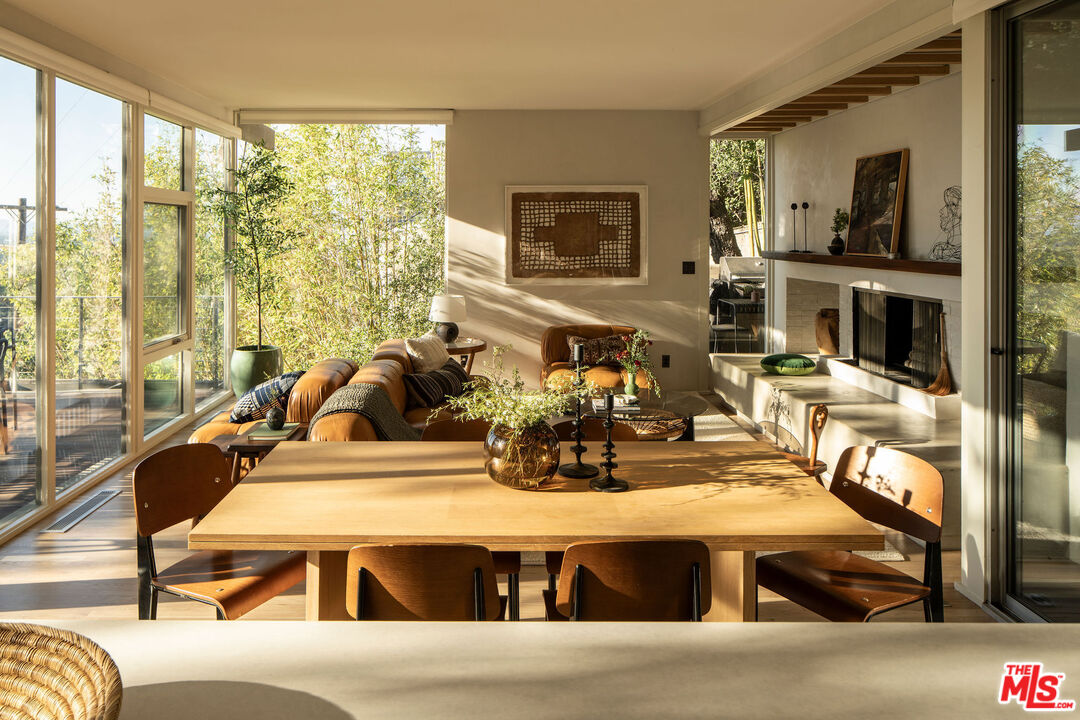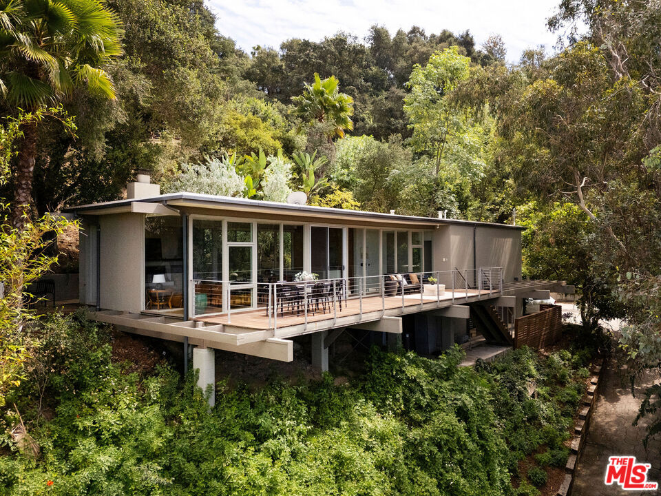 Iconic mid-century modern design by Pearson & Rawdon Architects defines this 1961 post-and-beam home in the Hollywood Hills. A recent design refresh by Allprace highlights the quintessential elements of this coveted era. Perched above the drive on a hillside west of the Cahuenga Pass, the home's airy, glass-lined design frames sweeping canyon and city-light views while embracing seamless indoor-outdoor living. The open-plan main level is flooded with natural light, with living and dining areas flowing directly onto a spacious patio and an oversized view deck. Two thoughtfully updated bedrooms offer privacy and natural light, while a lower-level bonus space, configured as a third en-suite bedroom with a separate entrance, offers flexible use as a guest suite or creative studio. Outside, multiple terraces and gardens create distinct areas for gathering or retreat, including a hot tub, BBQ zone, and serene meditation perch. A rare architectural offering, this home balances iconic design with calm, retreat-like living above the city.