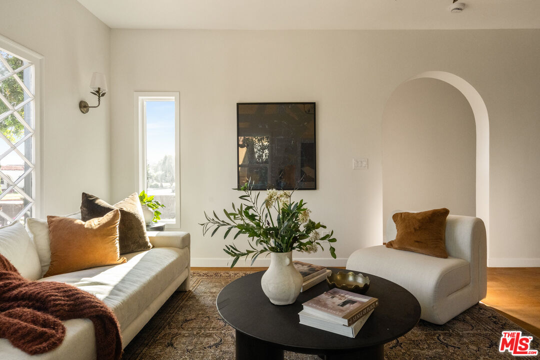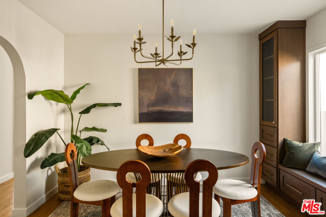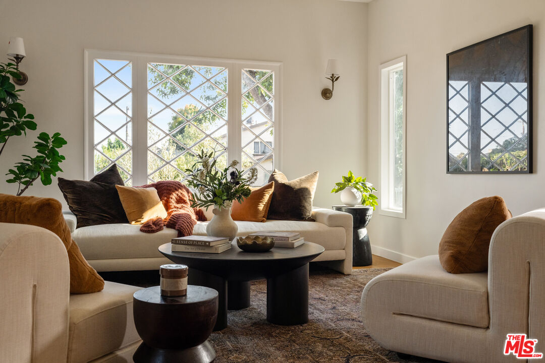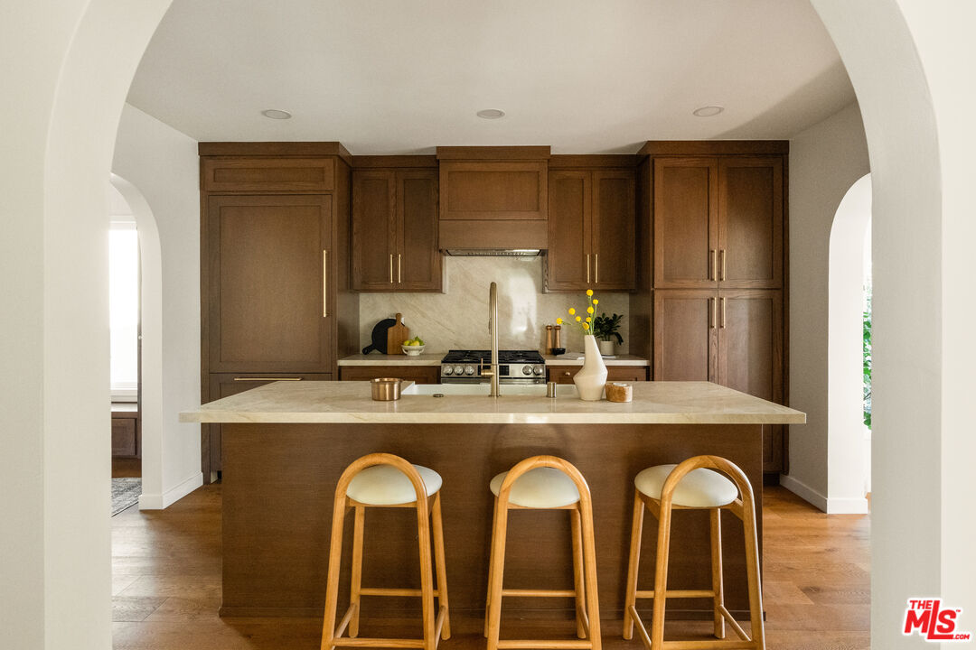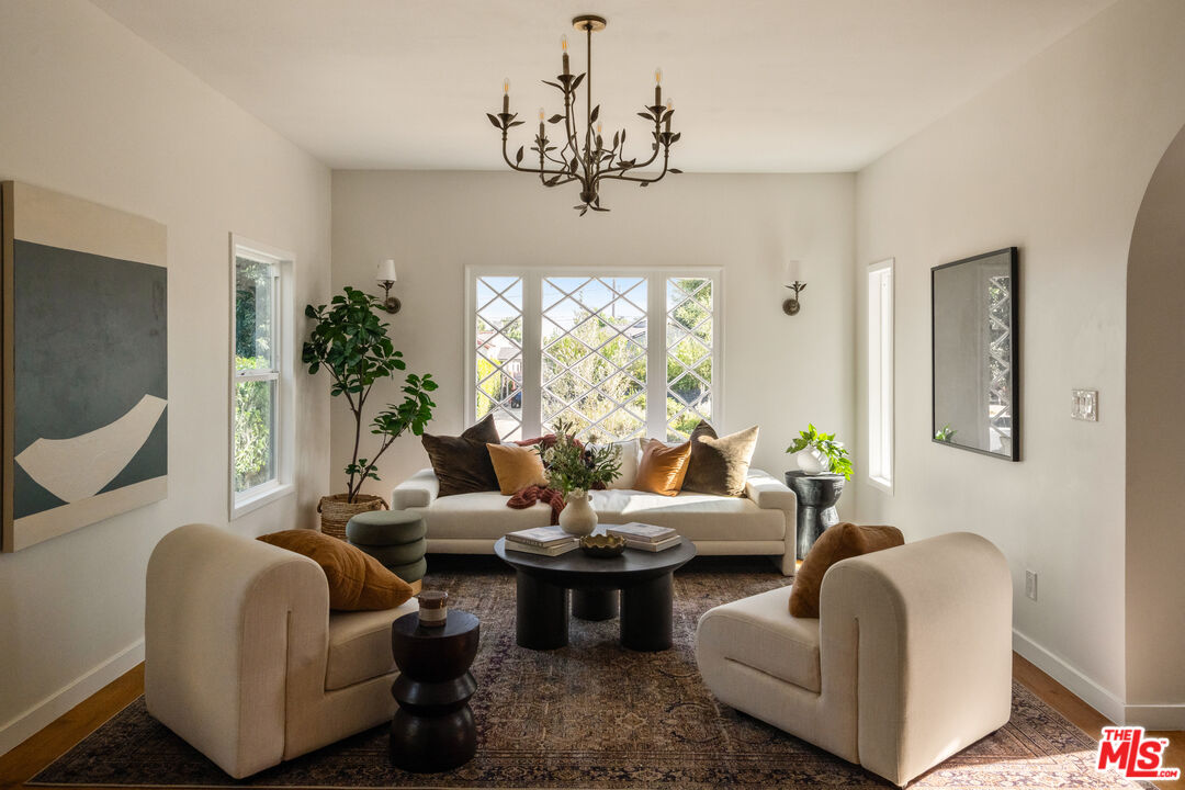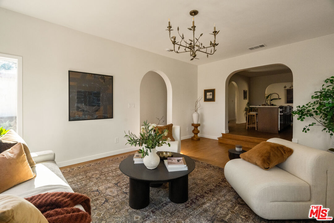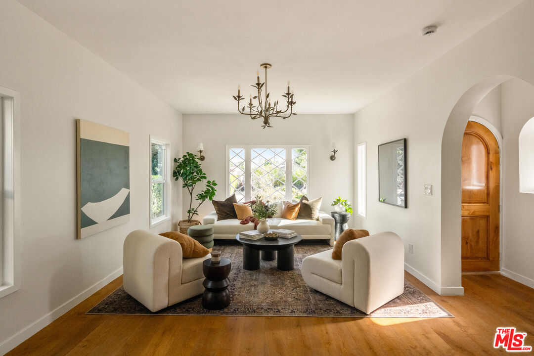 On a tree-lined View Heights street, this reimagined storybook bungalow wraps everyday life in soft light, arched passages, and garden views. Step through the curved wood front door into a living room framed by diamond-pane windows, where sunlight pours across warm wood floors and a layered, intimate palette that feels equal parts gallery and gathering space.The heart of the home is a custom kitchen and dining suite, joined by an elegant archway and anchored by a long stone island made for lingering over late-night conversations. Rich wood cabinetry, brass accents, and a built-in dining bench create a quietly luxurious backdrop for everything from weeknight pasta to celebratory dinners. Three tranquil bedroomsincluding a dreamy primary that opens directly to the yardoffer restful retreats, with airy walls, sculptural lighting, and soft textures that invite you to slow down.In the spa-like bath, deep green paneling, brass fixtures, and an arched, zellige-tiled tub niche turn daily routines into candlelit rituals. Outside, an expansive lawn and modern stone-and-gravel patio flow seamlessly from the interior, creating a private outdoor living room for golden-hour cocktails, barefoot play, or quiet mornings with coffee beneath the trees. Thoughtful upgradesincluding new roofing, windows, systems, and a fully reimagined kitchen and bathsbring ease and longevity to the home's romantic character, while a finished two-car garage and fresh landscaping complete this polished View Heights retreat. So close to Somerville, Jon + Vinny's, Two Hommes, Hilltop Coffee, Sunday Gravy and the booming South L.A. commercial corridor. Easy access to LAX, the 10 and 405 freeways and a quick jump up La Brea to center city. Welcome to your new retreat!