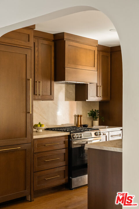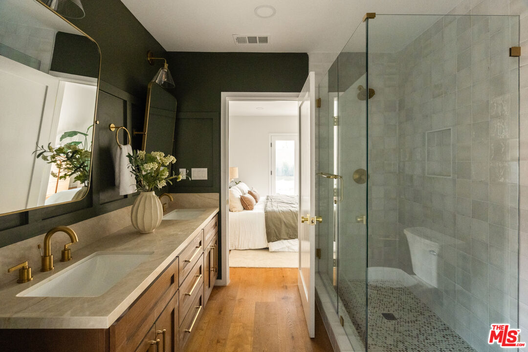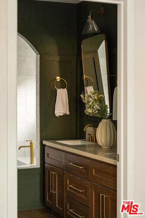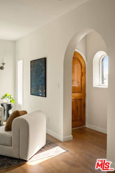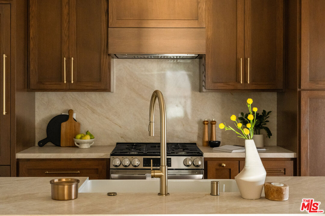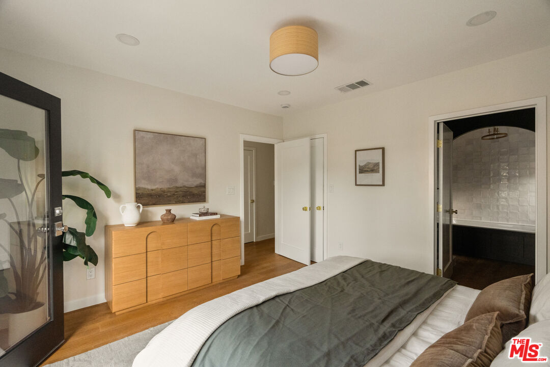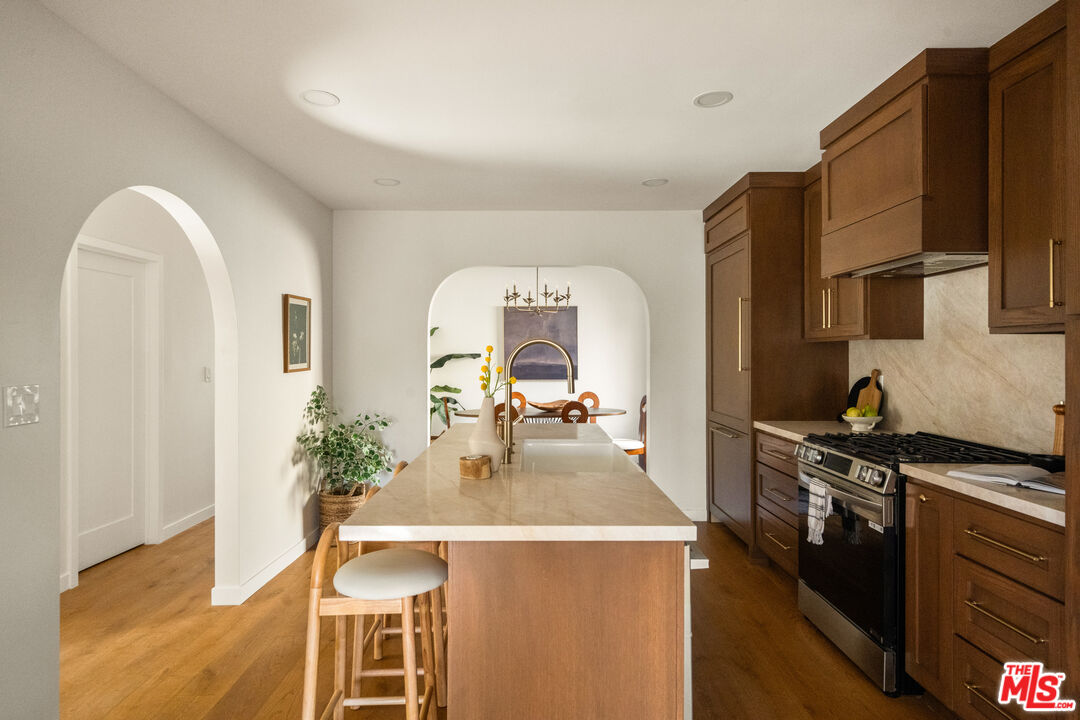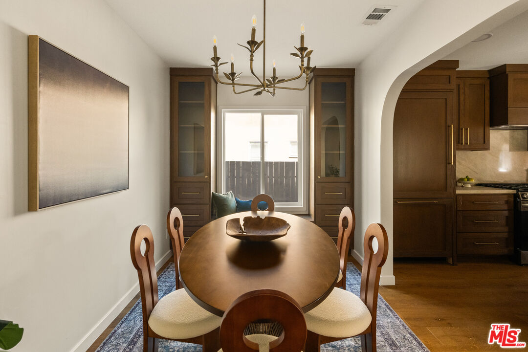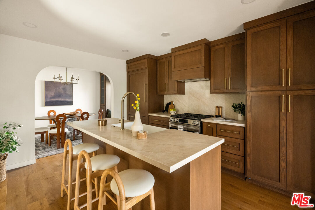 On a tree-lined View Heights street, this reimagined storybook bungalow wraps everyday life in soft light, arched passages, and garden views. Step through the curved wood front door into a living room framed by diamond-pane windows, where sunlight pours across warm wood floors and a layered, intimate palette that feels equal parts gallery and gathering space.The heart of the home is a custom kitchen and dining suite, joined by an elegant archway and anchored by a long stone island made for lingering over late-night conversations. Rich wood cabinetry, brass accents, and a built-in dining bench create a quietly luxurious backdrop for everything from weeknight pasta to celebratory dinners. Three tranquil bedroomsincluding a dreamy primary that opens directly to the yardoffer restful retreats, with airy walls, sculptural lighting, and soft textures that invite you to slow down.In the spa-like bath, deep green paneling, brass fixtures, and an arched, zellige-tiled tub niche turn daily routines into candlelit rituals. Outside, an expansive lawn and modern stone-and-gravel patio flow seamlessly from the interior, creating a private outdoor living room for golden-hour cocktails, barefoot play, or quiet mornings with coffee beneath the trees. Thoughtful upgradesincluding new roofing, windows, systems, and a fully reimagined kitchen and bathsbring ease and longevity to the home's romantic character, while a finished two-car garage and fresh landscaping complete this polished View Heights retreat. So close to Somerville, Jon + Vinny's, Two Hommes, Hilltop Coffee, Sunday Gravy and the booming South L.A. commercial corridor. Easy access to LAX, the 10 and 405 freeways and a quick jump up La Brea to center city. Welcome to your new retreat!