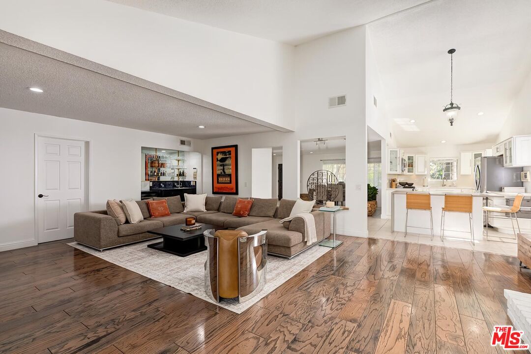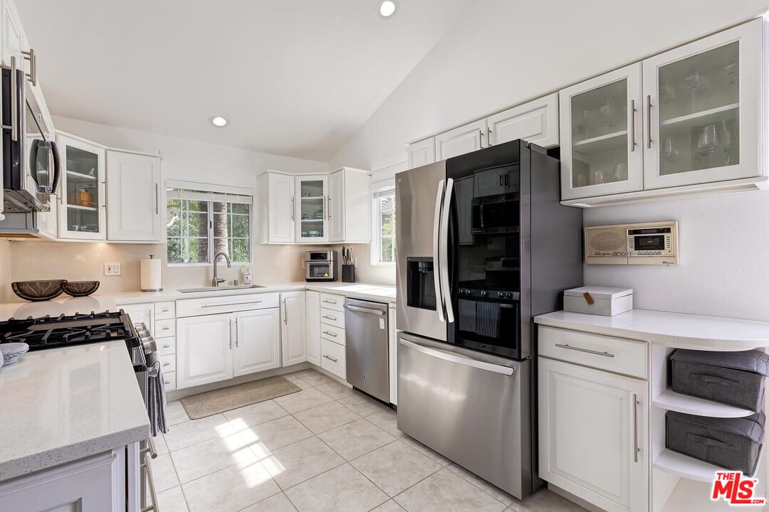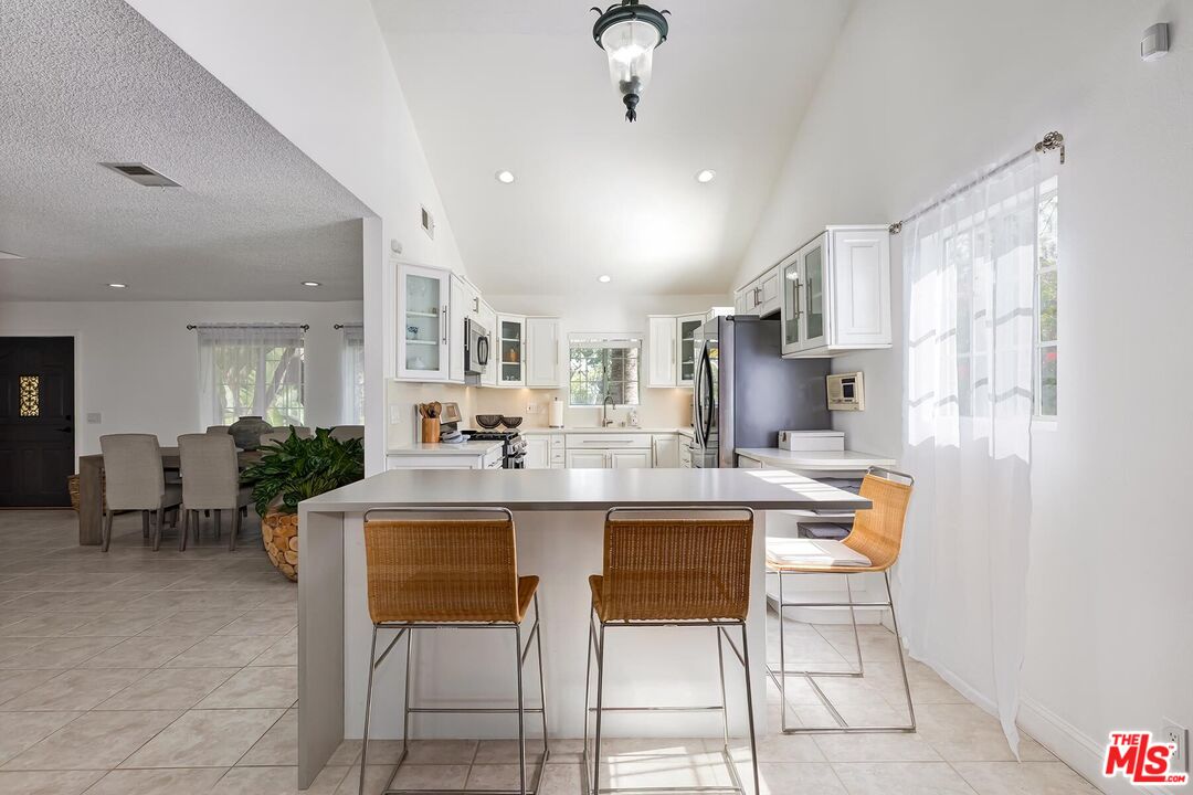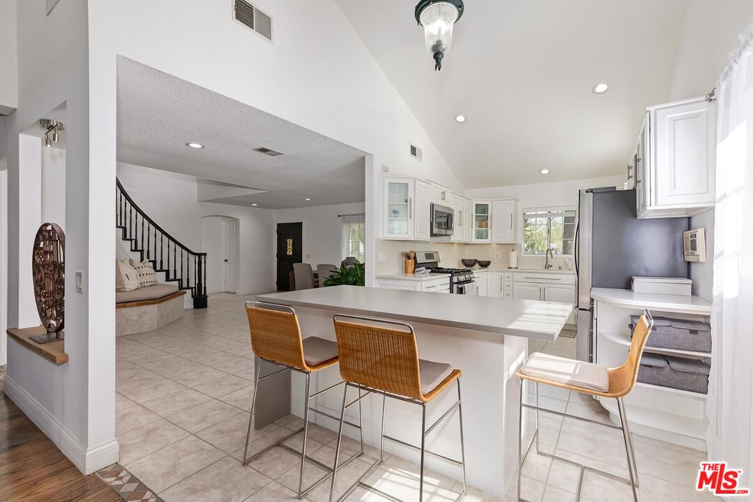 Located on a picturesque, tree-lined street in the sought-after Los Cerritos neighborhood, this thoughtfully updated and meticulously maintained Mediterranean-inspired residence blends timeless architecture with refined indoor-outdoor living just moments from Virginia Country Club and the shops and dining of Bixby Knolls. Comprehensively rebuilt and expanded in 1990 with a second-story addition, the home offers the presence of an established neighborhood with the feel and functionality of a much newer residence. A striking front walkway framed by mature, stately palm trees creates a grand, colonnade-like approach, setting the tone before you step inside. High vaulted ceilings and expansive windows fill the dramatic living room with natural light, anchored by a fireplace and French doors that open seamlessly to the backyard. The remodeled kitchen features white cabinetry, quartz countertops, stainless appliances, and a center island, flowing effortlessly into formal and casual dining spaces designed for everyday living and entertaining. Upstairs, the spacious primary suite is complemented by a renovated bath with dual vanity and glass-enclosed shower, while additional bedrooms offer flexible space for family, guests, or a dedicated home office. The private backyard includes a covered deck and brick patio ideal for al fresco dining, weekend gatherings, and relaxed evenings outdoors, along with a detached two-car garage and generous lawn. Set within one of Long Beach's most established enclaves known for wide streets, architectural character, parks, golf, and top-rated schools, this home offers classic Los Cerritos living with elegance and modern comfort.