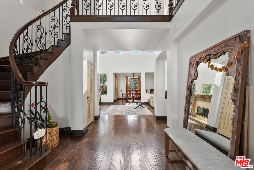 Elegant Spanish-style home tucked away behind the prestigious gates of La Vina. The charming front welcomes you with a beautiful courtyard while the backyard is an entertainer's dream, featuring a built-in gas fire pit, BBQ grill, outdoor kitchen, and patio ideal for al fresco dining, hosting friends and family, or enjoying sunset evenings. On clear days, take in stunning views all the way to Catalina. Designed for entertaining, the thoughtfully planned floor plan offers multiple indoor and outdoor gathering spaces, including a formal living room with a mantel fireplace adjacent to the formal dining room. For more relaxed living and entertaining, enjoy a chef's kitchen open to the family room, which features its own fireplace, creating warm and inviting spaces for everyday living. The chef's kitchen is beautifully appointed with granite countertops, tile flooring, a generous center island, and built-in appliances including a stove, refrigerator, microwave, and double oven, perfect for both daily living and effortless entertaining. Ideal for multi-generational living or guests, the home includes a first-floor en-suite bedroom. This flexible space can also be used as an office, additional family room, theater room, or gym the possibilities are endless. The luxurious primary suite , with a fireplace and sitting area, is located on the second floor and offers a serene retreat with expansive closets and sunset views. Additional second floor bedrooms have balconies with views of the mountains. La Vina offers resort-style amenities including a sparkling pool, playground, scenic hiking trails, and 24-hour gated security for peace of mind. The community is currently in the process of rebuilding portions affected by the Eaton Fire, with steady progress continuing and a strong commitment to full recovery.