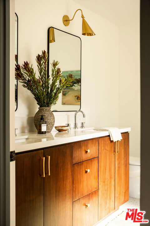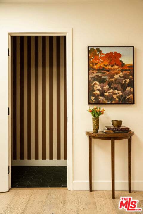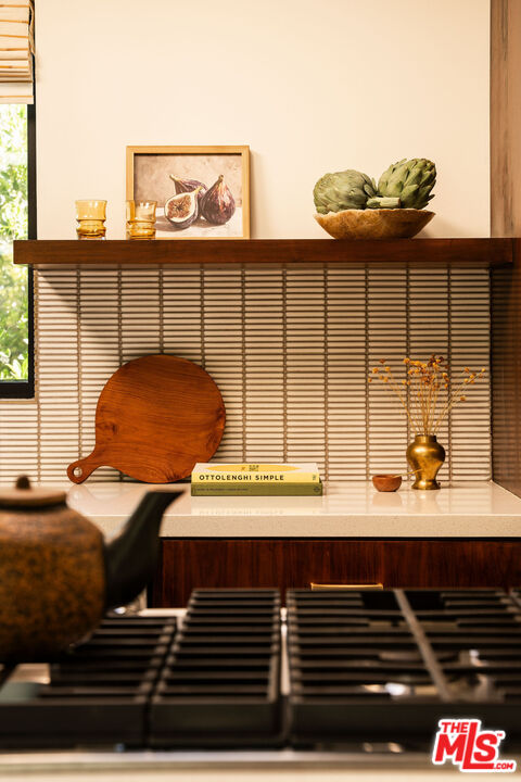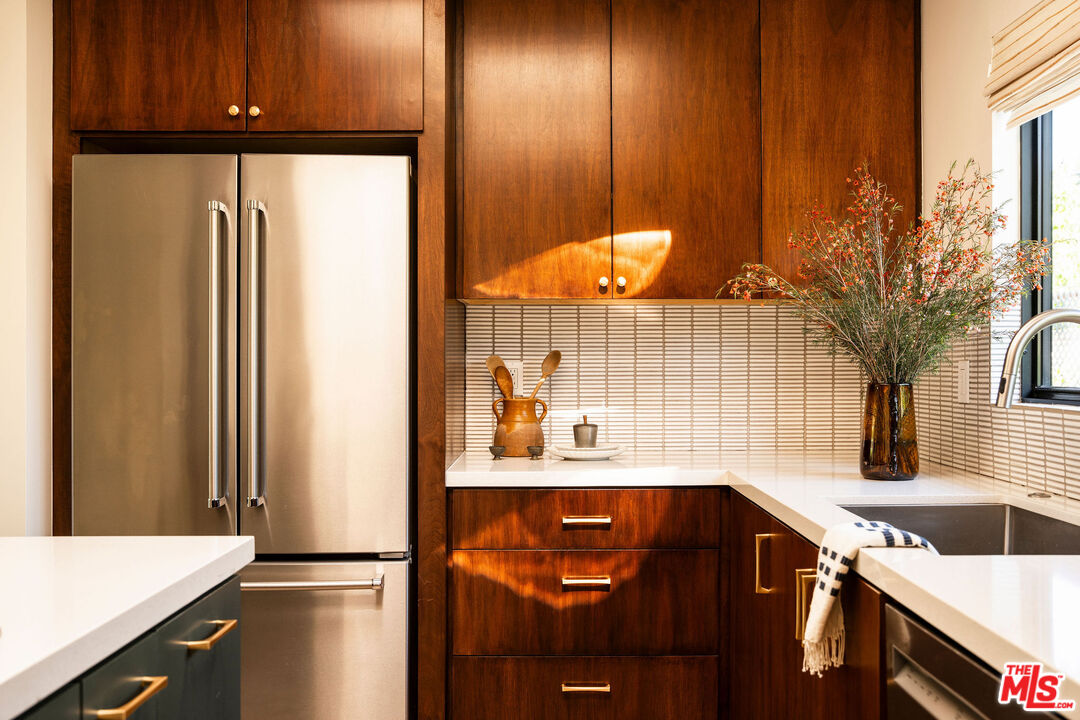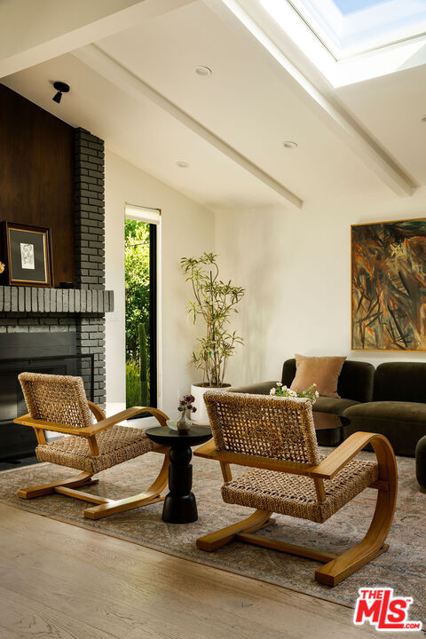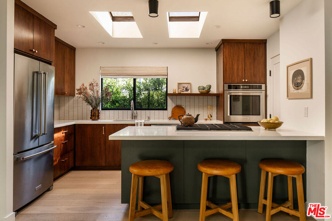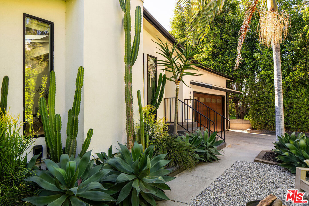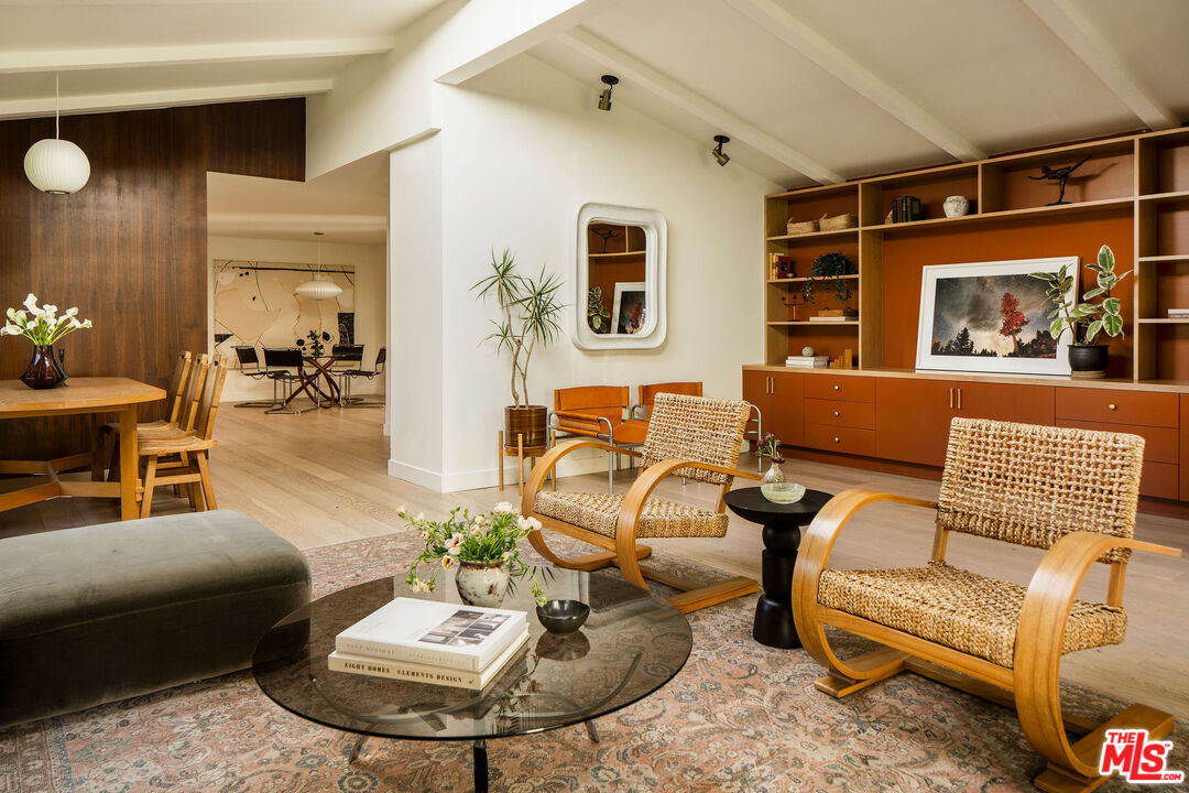 Located in the Franklin Hills neighborhood of Los Feliz, this renovated Mid-Century-inspired 3 bed, 2.5 bath residence sits privately behind hedging and gates within the coveted Franklin Elementary School district (per LAUSD). Framed by sculptural cacti and drought-tolerant landscaping that echo the home's clean architectural lines, the property offers a thoughtful blend of modern, elevated design and easy California living. Inside, vaulted beamed ceilings and new Velux skylights with solar-powered shades fill the home with natural light, highlighting its open layout and curated finishes. The living room serves as the heart of the home, anchored by a chic brick fireplace and picture windows overlooking the front yard. The space flows effortlessly into the dining area set against a beautiful walnut accent wall, where a Herman Miller George Nelson Bubble Lamp hangs overhead -- an ideal setting for both lively dinner parties and quiet evenings at home. The adjacent kitchen pairs warm walnut cabinetry with a glazed tile backsplash, stainless steel appliances, a large pantry, and a peninsula with bar seating. A stylish breakfast nook sits beneath another Herman Miller pendant, while a charming powder room wrapped in striped Sandberg wallpaper is perfect for guests. Just off the breakfast space, sliding doors open to a private patio, creating an easy connection for outdoor relaxation and entertainment. The home offers three bedrooms, including a spacious primary suite with vaulted beamed ceilings, a generous walk-in closet, and direct access to the backyard. The spa-inspired bath includes terrazzo tile floors, a dual vanity, a soaking tub, and a walk-in shower. Two guest bedrooms with skylights, a beautifully designed hall bath with statement tilework, and a spacious laundry room with a sink complete the home's thoughtful layout. The property is entirely fenced and gated, with several outdoor areas including a back grassy lawn and a paver-stone patio, perfect for dining under the stars. An oversized two-car garage with an EV charger and a gated driveway provides convenience and secure parking. Ideally situated on the cusp between Silver Lake and Los Feliz, the home is a short distance to the commercial offerings on Hyperion Avenue -- Speranza restaurant, Trader Joes, Gelsons, Rodeo Fitness - and the vibrant shops and restaurants of Los Feliz Village -- including All Time, Maru, MUD, and Little Dom's -- plus the hiking trails and open space of Griffith Park. Private, chic, and ideally located, this stunning residence showcases thoughtful design and the best of Eastside living.