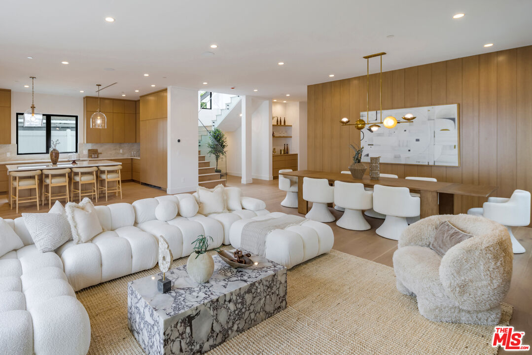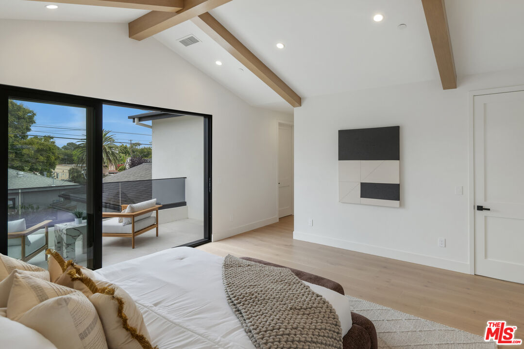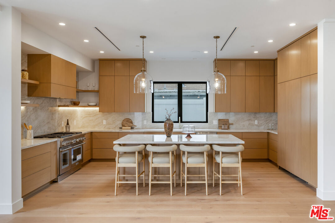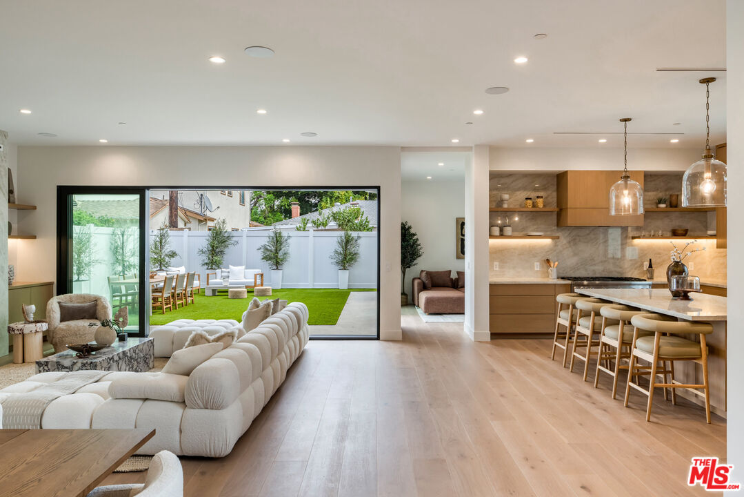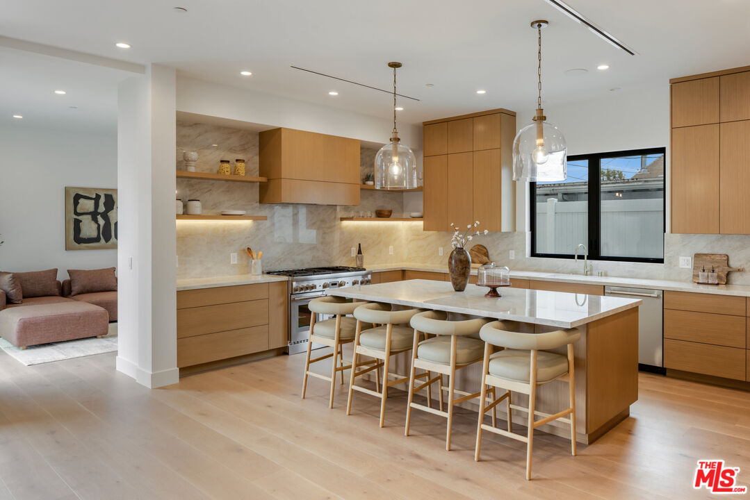 Welcome to one of Mar Vista's most refined new offerings, an architectural home that exemplifies California modern living with elevated design, premium finishes and effortless flow. Behind a crisp white fence and sculptural facade, this warm modern residence offers the perfect balance of privacy. Beyond the grand pivot door, a sun-drenched open floor plan unfolds. It is anchored by wide-plank French oak flooring, designer lighting and an airy atmosphere throughout. The first floor features expansive formal and casual living spaces that seamlessly connect to a chef's kitchen equipped with Thermador appliances, custom cabinetry and an expansive island designed for entertaining. The formal dining area is wrapped in natural wood paneling, adding texture and tone to the organic palette. Retractable walls of glass open to a lush private backyard with lounge seating and al fresco dining that invites true indoor-outdoor living. The second level features a spacious primary suite with vaulted ceilings, a spa-grade bathroom with a soaking tub and a private terrace overlooking the yard. Three additional en-suite bedrooms offer space and comfort for guests or family, each with refined finishes and generous proportions. Moments from Mar Vista's local boutiques, farmers markets and top-rated schools, this home represents a rare blend of architectural sophistication and relaxed SoCal living crafted for the most discerning buyer.