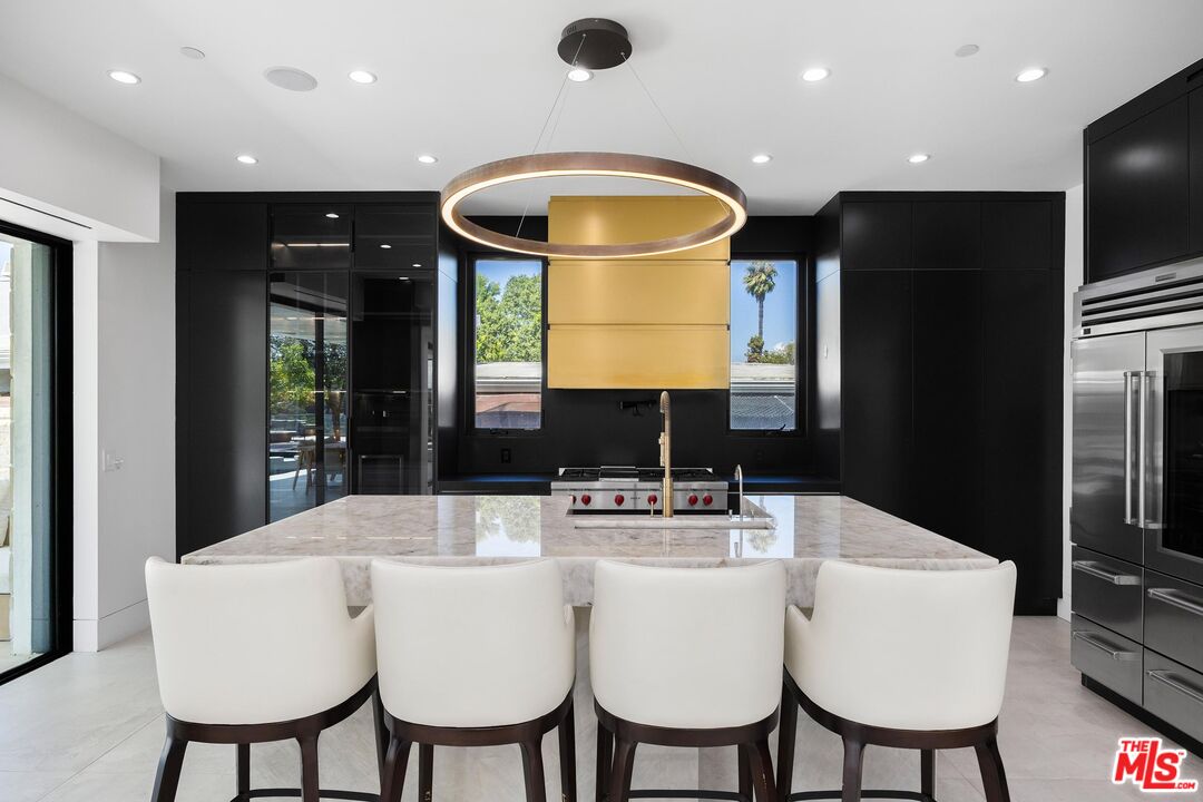 Tucked behind gates in prime Sherman Oaks, this newer 5BD/7BA estate blends privacy, sweeping views, and seamless indoor-outdoor living. A custom Kolbe glass entry sets the tone, leading into a dramatic main level with soaring ceilings allowing natural light to fill the space. A bar area and formal dining room allow plenty of space for friends and family to gather. The chef's kitchen features a 6-burner Wolf range, Miele appliances, a glass-front Sub-Zero, and a striking Cristallo White Quartzite island. Floor-to-ceiling pocket doors open to the resort-style backyard, designed with a covered patio, pool, spa, wood decking, and a full outdoor kitchen. An elevator takes you to the rooftop deck, where city, valley, and mountain views create the ultimate backdrop for entertaining. Two fire pits, a second outdoor kitchen, and a private shower round out this impressive space. Upstairs, dual primary suites showcase distinct luxuries. One offers a wraparound balcony with 180-degree views, swing seating, fire feature, and a spa-like bath with steam shower, rainfall heads, and a freestanding tub positioned toward the horizon. The other includes a fireplace, dual balconies, and a custom walk-in closet. Two additional ensuite bedrooms round out the level, one with its own kitchenette, private entry, and fireplace. Every detail has been thoughtfully selected, from electronic bidet toilets in each bathroom to the home theater, Blue Roma Quartzite fireplace, Yellow Onyx bar, and Jerusalem stone exterior. Just minutes from Ventura Boulevard and scenic hiking trails, this residence balances sophistication, comfort, and unmatched views. Also available for lease, inquire within.