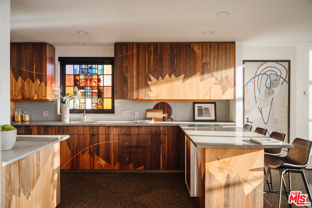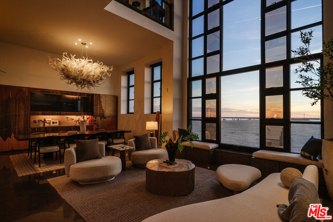 This iconic oceanfront residence in Marina del Rey is the epitome of premier coastal California living. Tucked within the ultra-private Marina Peninsula enclave, this extraordinary home delivers unrivaled serenity on a secluded stretch of the beach while staying close to the vibrant pulse of Venice Beach. Created by the renowned sculptor Robert Graham in close collaboration with dozens of iconic 1980s artists, this home integrates their extraordinary site-specific works throughout. The result is an irreplaceable living artwork, famously featured on the cover of Architectural Digest - a breathtaking fusion of ocean energy, marina views, and modern luxury. Enter through stunning stained-glass doors into open living and dining spaces bathed in natural light and filled with gentle sea breezes. A soaring two-story window with custom bronze accents frames panoramic beach views, creating heavenly tranquility within earshot of the ocean waves. The entertaining kitchen flows seamlessly into the dining room, anchored by a striking hand-blown Dale Chihuly chandelier, while a full secondary kitchen is tucked away discreetly in the back for effortless service and preparation. Ascend the architecturally pleasing staircase to a private office with tranquil ocean views and exquisite built-in cabinetry. Beyond lies the primary suite, a spacious and serene retreat with expansive floor-to-ceiling windows that invite abundant natural light and sweeping ocean vistas from sunrise to sunset. It includes refined etched Waterford crystal accents, automated shades, generous walk-in closets, a luxurious sauna-equipped bath, elevator access, and direct entry to the rooftop. The home is thoughtfully divided into two wings: the east wing houses the guest bedrooms, offering privacy and comfort, while the captivating secondary living room features a waterfall skylight, overhead mural, and angled marble floors. The private rooftop offers sweeping panoramas from Palos Verdes in the south to Malibu to the north across the Marina channel and Pacific to the west, all further enhanced by custom mosaics. Additional highlights and luxury amenities include a lower level with an informal theater or gym, powder room, and 4-car garage; a 4-stop elevator; mosaic lap pool; whole-house filtration; central vacuum system; and generator. Perfectly balancing the best of California beach charm with effortless access to world-class shopping, dining, entertainment, and travel, this home weaves an irresistible combination of art, nature, and sophisticated design into vibrant daily life. Your oceanfront sanctuary awaits.