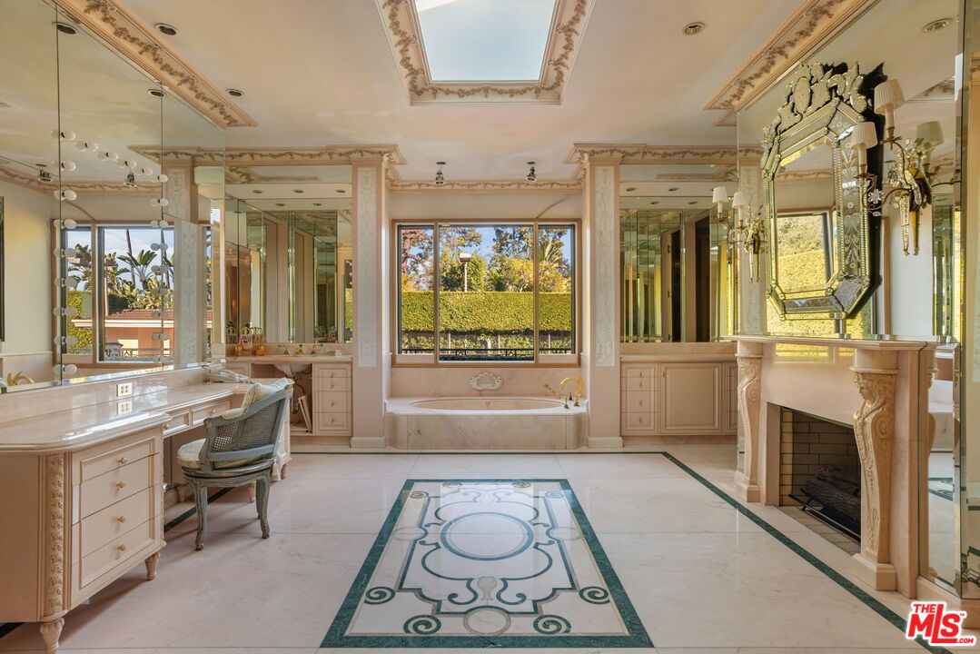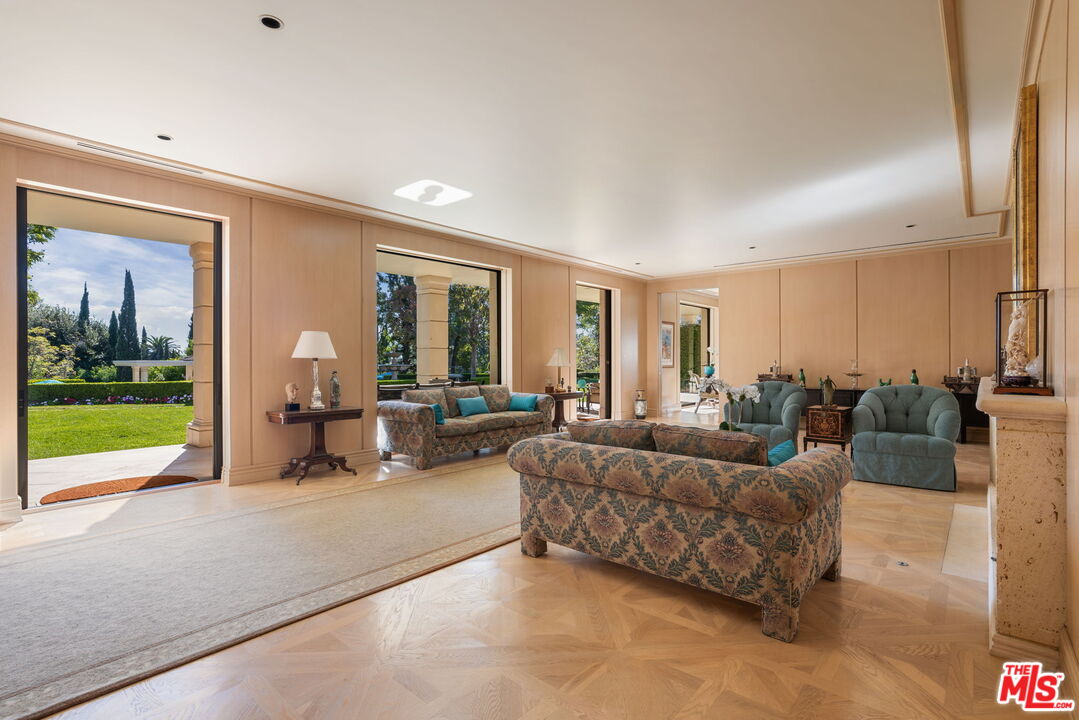 The Carson Estate. Formerly the cherished sanctuary of Johnny and Joanna Carson, this legendary residence is situated on approximately 1.5 acres of verdant grounds in the heart of ultra-prime East Gate Bel Air. Secured by private gates and a dedicated security booth, an expansive motor court provides an impressive sense of arrival, complemented by two spacious garages. Classic and elegant, the home exudes timeless sophistication defined by magnificent scale, high ceilings, and bespoke details and craftsmanship. An airy foyer transitions into a magnificent great room with a wet bar, while the formal dining area and generous family room capture serene vistas of the lush surroundings. Pocket doors disappear throughout the home to facilitate a quintessential California lifestyle, anchored by a stately loggia with classical pillars that traces the rear of the residence. The gourmet kitchen is outfitted with a central island and cozy breakfast nook, while a distinguished den replete with character features rich wood paneling and custom built-ins. Entered via a striking rotunda, the palatial primary retreat is a haven of luxury, boasting dual bathrooms and walk-in closets, while a detached two-story guest house provides additional versatility with a home office and a lower-level ideal for a fitness studio. Also featured at the property is a sizable basement area providing ample storage and a wine cellar. The exterior is a meticulously curated resort-style oasis, where manicured lawns and a tiered fountain lead to a signature oval swimming pool, a sprawling sun deck, and an elegant cabana. This legendary estate is completed by a championship lighted tennis court, uniquely supported by its own pavilion with a covered seating area, kitchenette, and dedicated powder room. A truly iconic luxury property ensconced within a private, park-like environment in one of the world's most coveted locations.