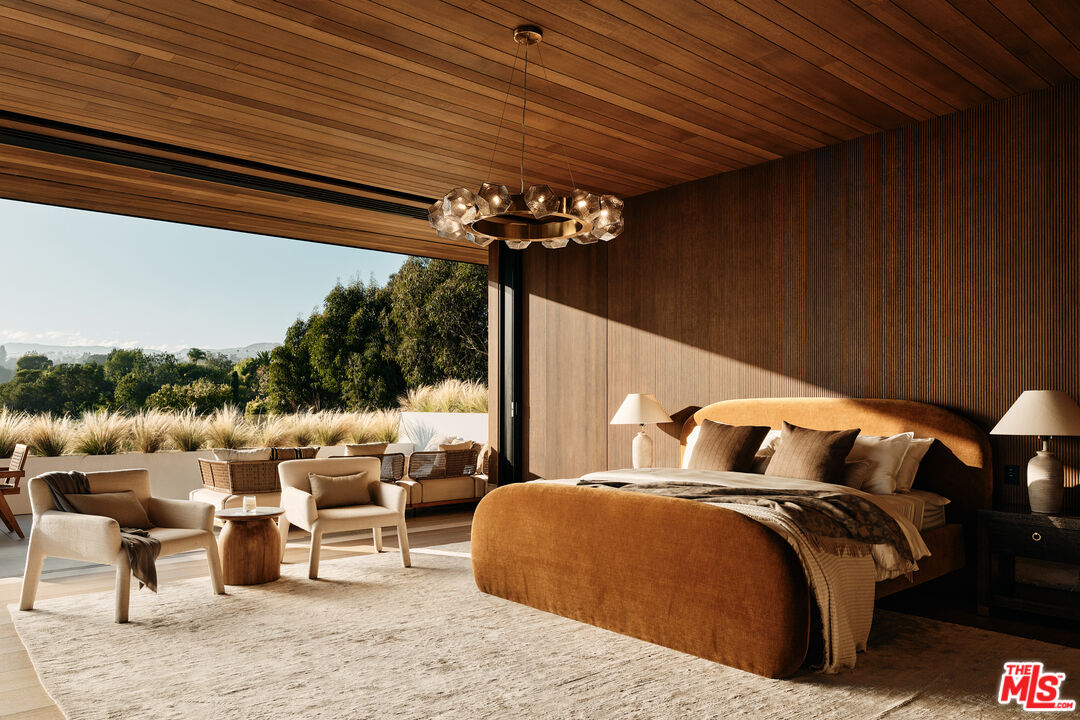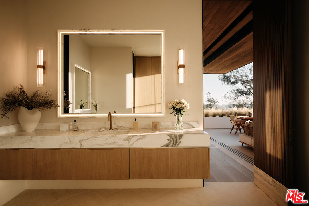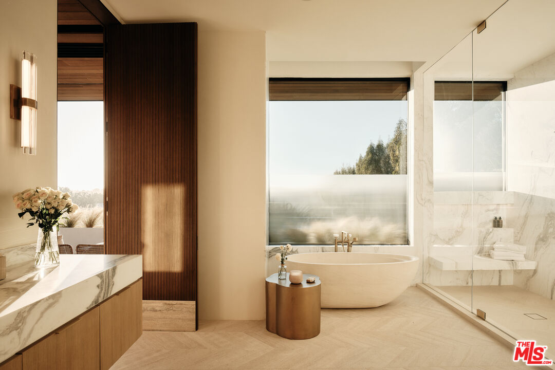Serenity patiently awaits at Villa Serenique, a truly one-of-one estate designed with deep reverence for organic materials, refined amenities, and understated sophistication. Located at 401 N Tigertail Road, just minutes from Brentwood Village, the home offers seamless access to L.A.'s premier dining, shopping, and hiking trails. Crafted over four years and thoughtfully designed with Tiffany Harris Design, Villa Serenique spans approximately 20,000 square feet on over one acre, featuring nine bedrooms. The residence is wrapped inside and out in hand-chiseled Portuguese limestone, complemented by Roman plaster walls, travertine, and board-formed concrete creating a calm, timeless atmosphere rooted in nature. Beyond a gated entry, limestone steps lead to a grand double-height door opening into light-filled living and dining spaces divided by a limestone fireplace. Floor-to-ceiling glass frames hillside views and opens to expansive outdoor entertaining areas. The hosting level includes an open-air kitchen with gas and Argentinian-style grills, a pool and hot tub with sunken firepit seating, manicured lawns with citrus and olive trees, a private walnut-wrapped office, chef's kitchen with brass hood, industrial prep kitchen, two guest suites, laundry room, garage, and secured delivery cabinet. Upstairs, canyon and city views accompany three ensuite bedrooms, a lounge, and the primary retreat featuring a private balcony, silver travertine accents, dual spa-like bathrooms with heated floors, and custom walk-in closets.The lower level offers a world-class wellness and entertainment wing: an indoor-outdoor gym, Pilates studio, lap pool, cold plunge, infrared sauna, steam spa, car gallery with drive-in movie capability, and parking for 10 plus cars, soundproof theater, bar, wine cellar, and additional ensuite bedrooms. Below the home lies a private outdoor retreat with soccer field, a pickleball court, gardens, and an Italian-style dining terrace. Quiet yet central, Villa Serenique is a sanctuary that grounds, restores, and inspires an everyday retreat for mind, body, and spirit.