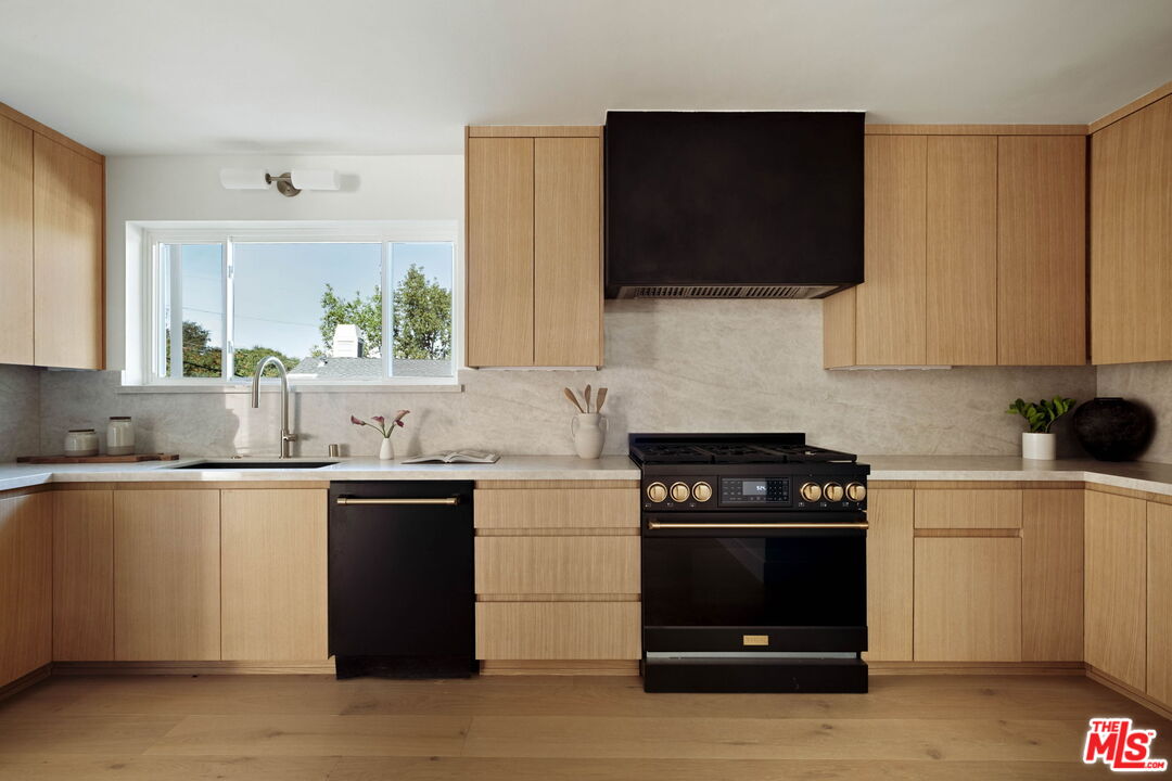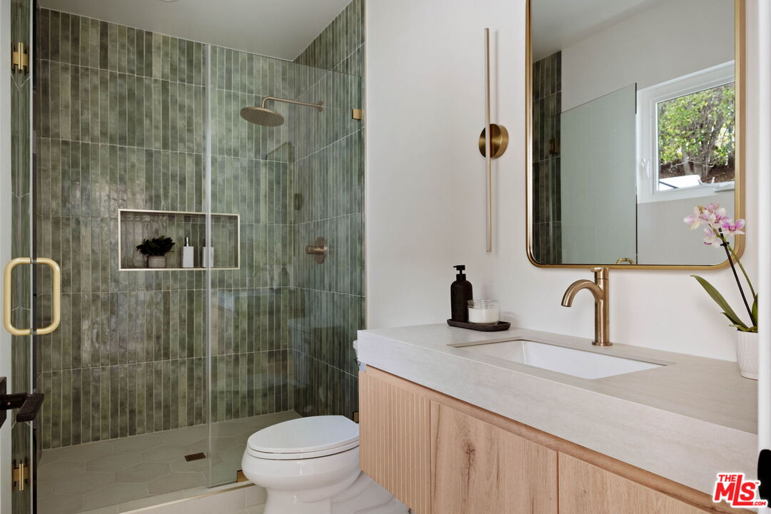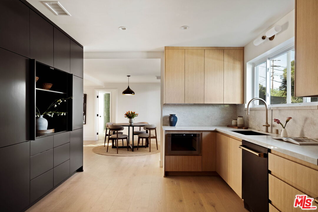 Set high in the hills of Sherman Oaks, this fully renovated home feels private, quiet, and intentionally removed from the street below.The house keeps its mid-century bones while leaning clean and modern throughout. The main living spaces including the living room, dining area, and kitchen are open and airy, with vaulted ceilings, exposed beams, and a natural flow that works for everyday living.On the main level, alongside the kitchen and living room, there's a separate bedroom with its own en-suite bathroom, ideal as a guest suite or home office. Downstairs, two additional bedrooms share an updated bath, creating a comfortable and functional layout.The kitchen has been completely redone with rifted white oak custom cabinetry, black stainless appliances, and a warm, modern feel that's clean, current, and great for hosting. Laundry is conveniently located on both the primary level and the lower level, adding flexibility to the home's layout.Upstairs, the primary suite sits on its own level, paired with a den and balcony that look out over canyon and valley views. The primary bathroom has been fully renovated and includes dual sinks, a soaking tub, and a calm, spa-like feel.Outside, the pool has been fully redone and anchors a private backyard that's calm, usable, and easy to enjoy. A quiet hillside setting with real views, thoughtful renovations, and a layout that truly makes sense.